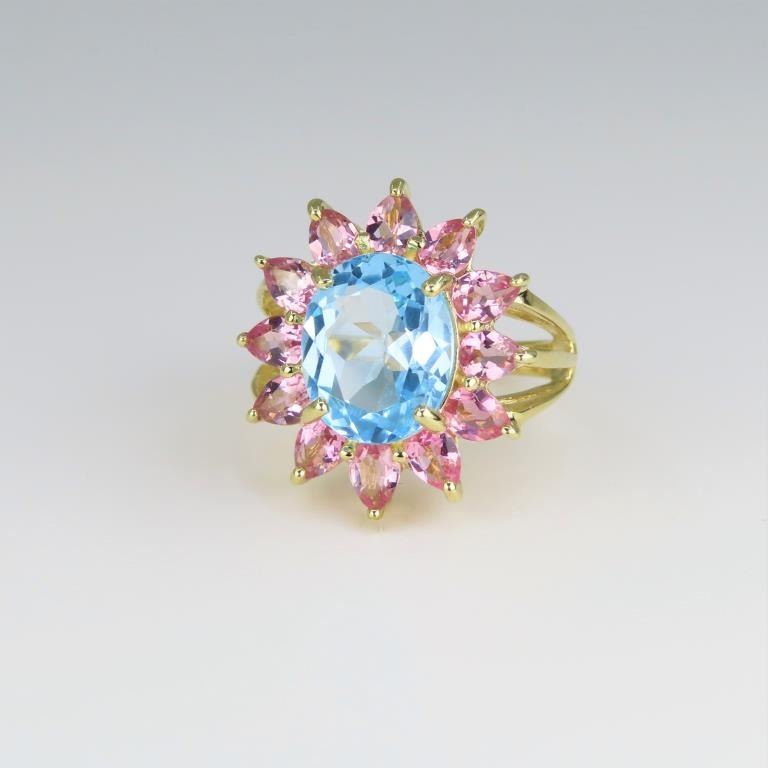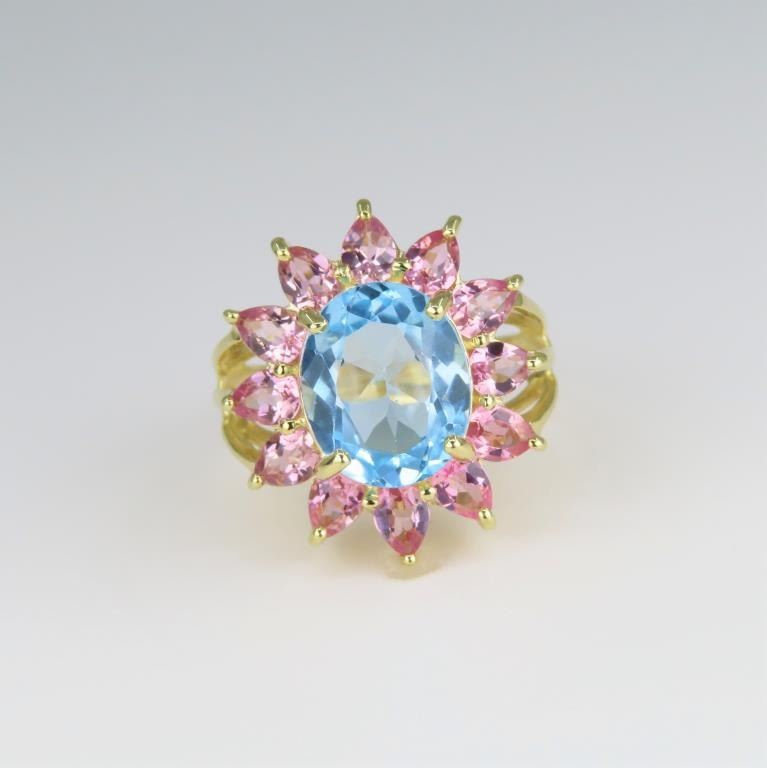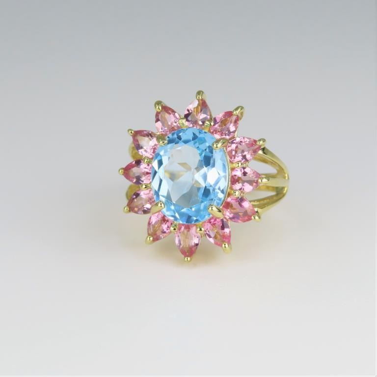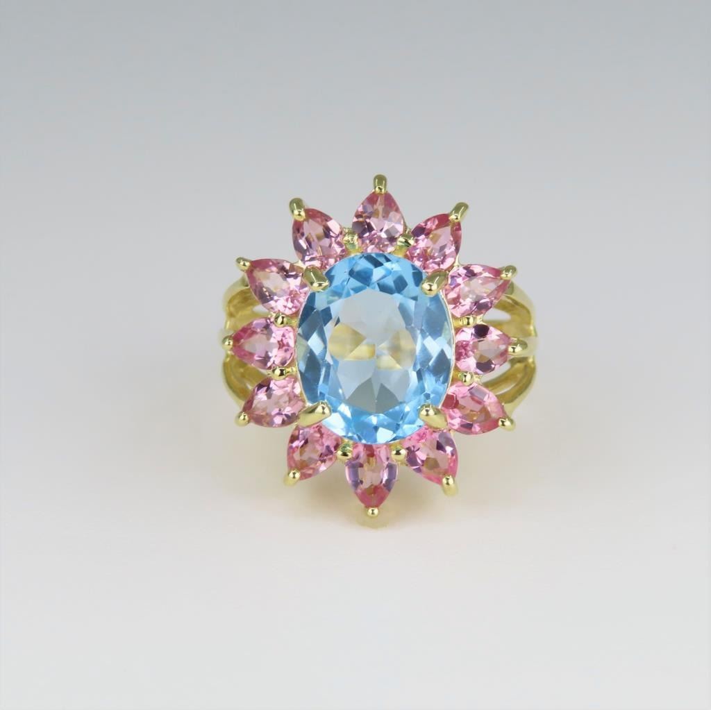Pink Tourmaline Ring weighing approx. 5.00 carats encircled by 12 pear shape Pink Tourmalines weighing approx. 2.00 carats set in a 10 karat yellow gold ring.
