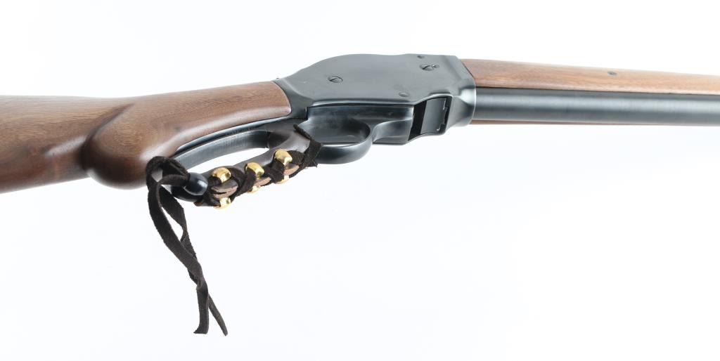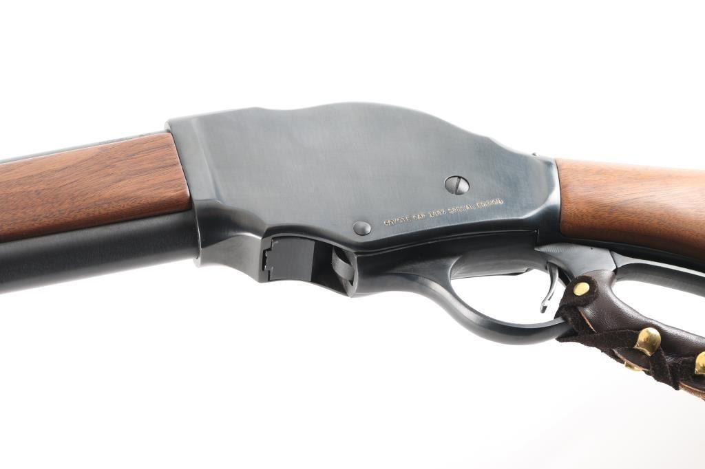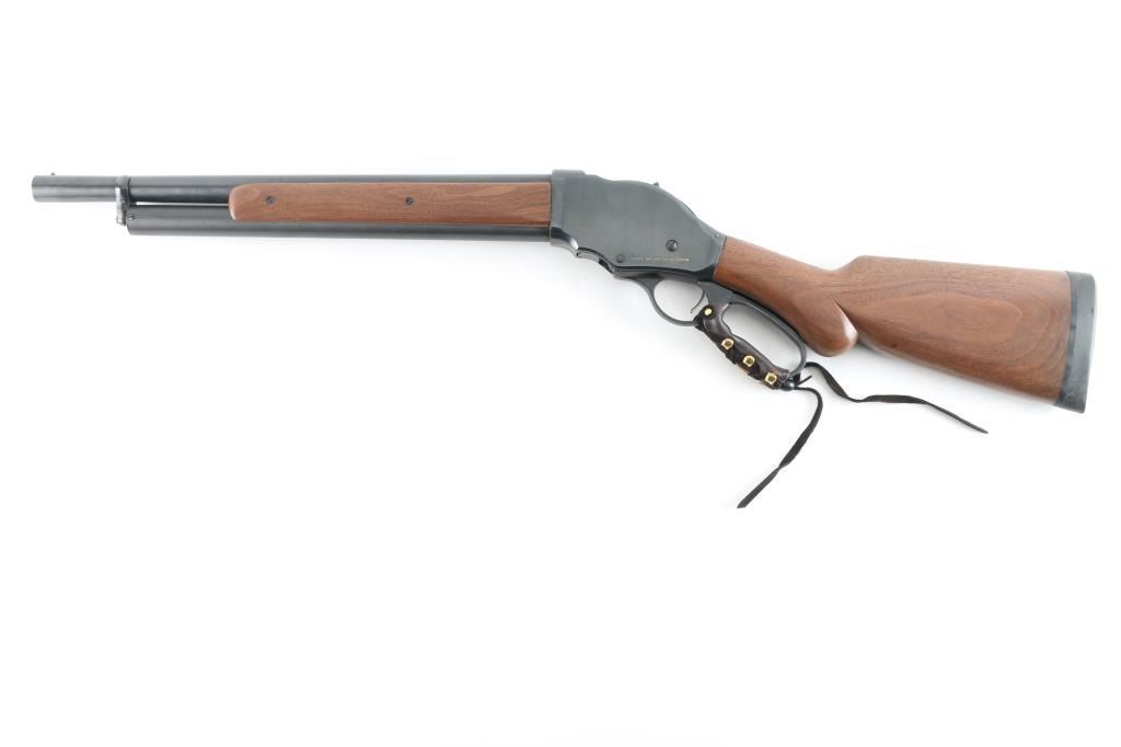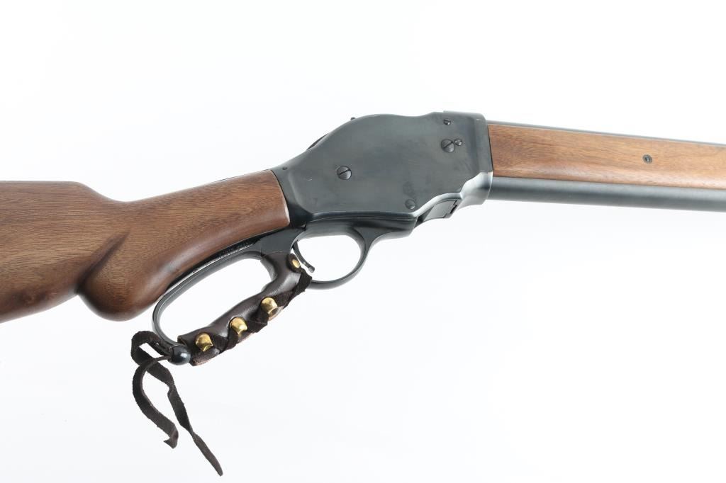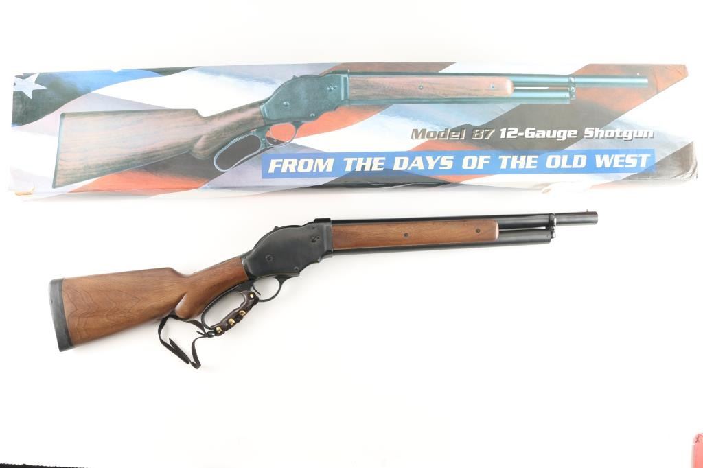 'Coyote Cap Model 1887 Special Edition' lever action shotgun made in China by SDI, imported by IAC, Billerica MA. Features 18" barrel with brass bead front sight, blued finish, external hammer, smooth hardwood stock & forend panels, solid rubber recoil pad, leather wrap with brass stud accents around finger lever. Accepts 2-3/4" shells, choke tubes. Bore is very good. Retains 95% finish with handling marks. Stocks are excellent. Includes factory box with choke wrench, MOD & EF tubes. Installed tube not removed, very hard to turn with a tube wrench, measures CYL with a drop-in gauge. Condition is NRA Excellent (choke tube frozen) *** Modern Firearm ***