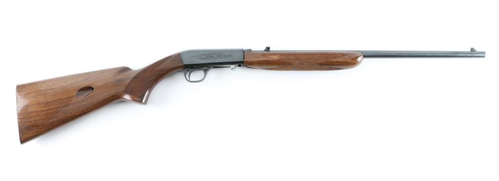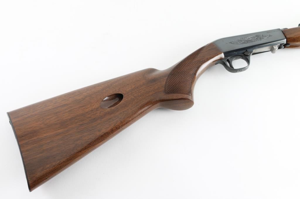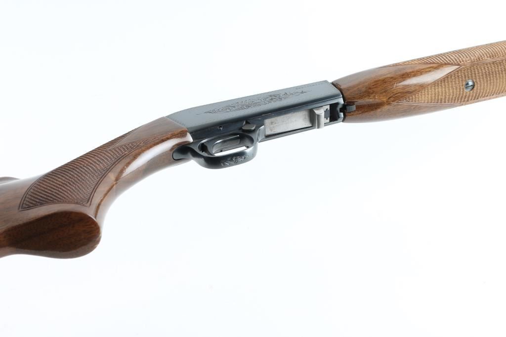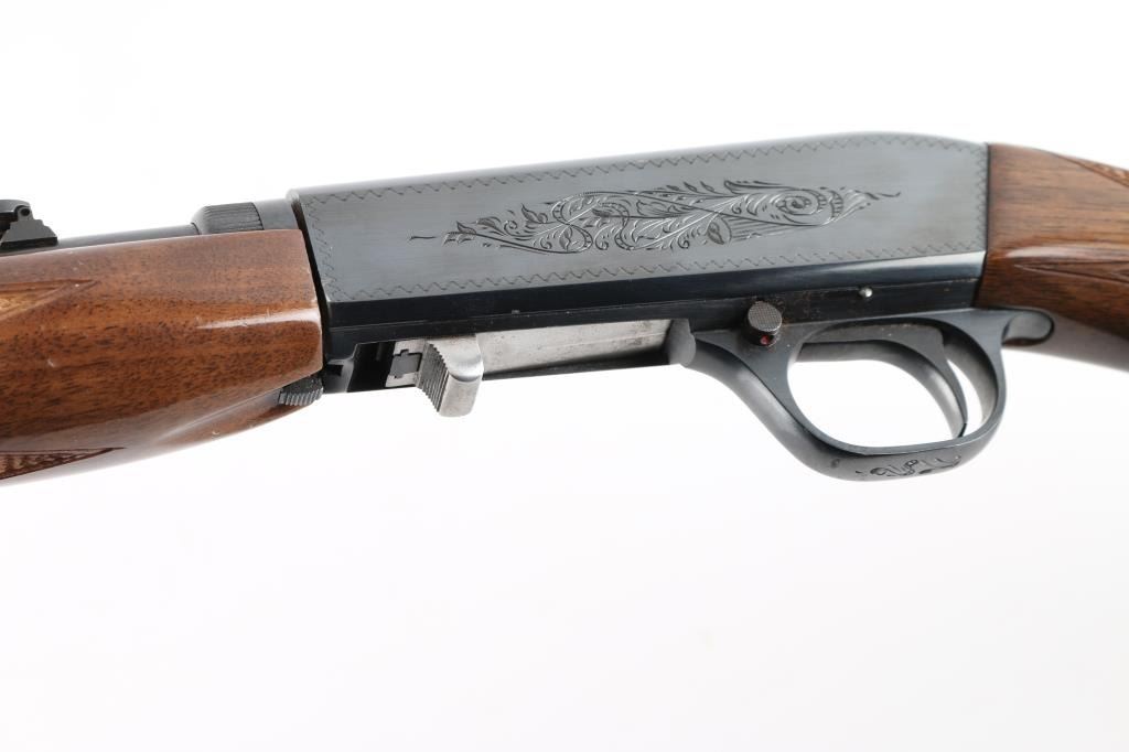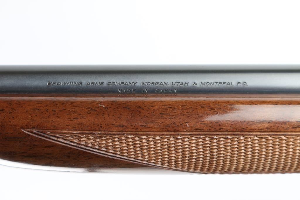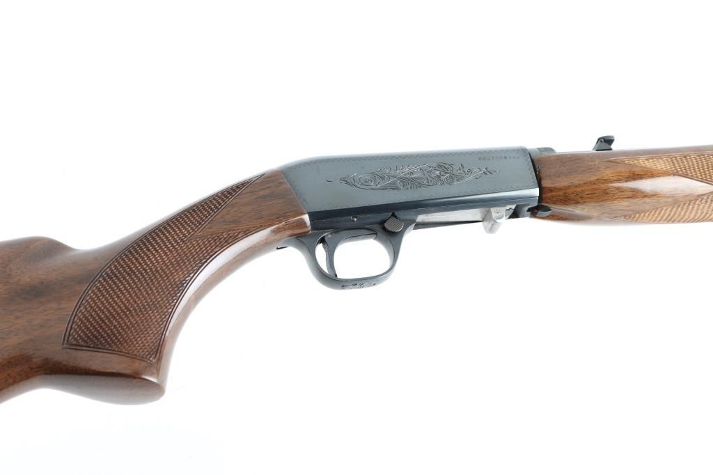 Semiautomatic rifle manufactured in Japan circa 1979. Imported for Browning Arms Company of Morgan, Utah/Montreal P.Q. Features a high-polish blued finish, light coverage floral scroll engraving. 19 1/4" take-down barrel, post/bead front sight with brass bead, elevation adjustable folding leaf rear sight, tubular magazine in butt, smooth trigger, push button safety, serrated charging knob on the underside of the bolt, checkered walnut forend with high gloss finish and semi-pistol grip shoulder stock with serrated metal buttplate. barrel drilled/tapped for optics. Bore appears very good, needs cleaning. Retains 98% polished blue with very minor rubs. Wood is near excellent with some minor dings. NRA Condition-Very Good+ Modern Firearm