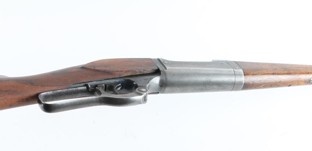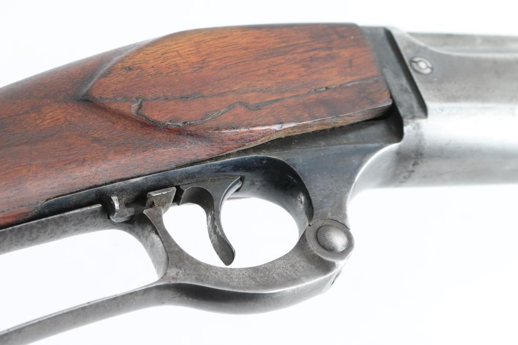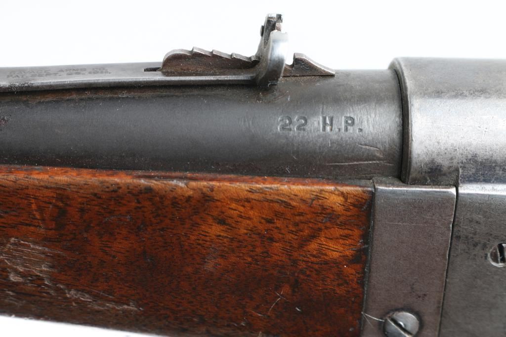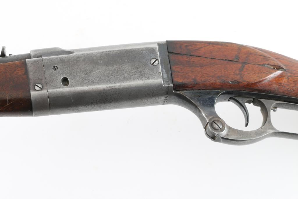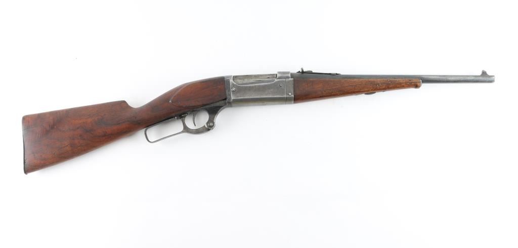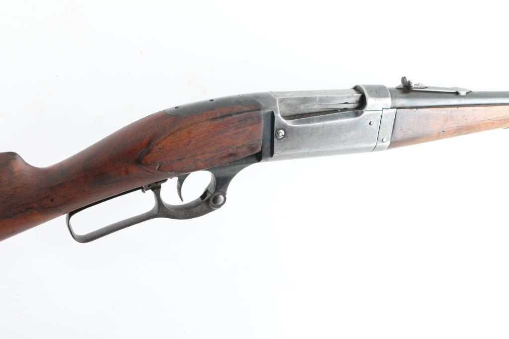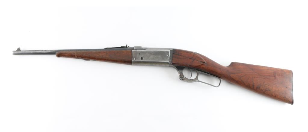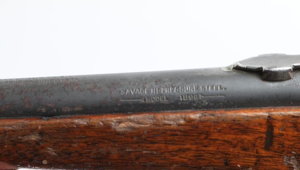 Lever action center fire rifle chambered for .22 High Power cartridges. This is NOT a .22 LR. It has a 16" blued barrel, fixed blade front sight and adjustable rear. Two piece wood stocks are plain with a Savage serrated metal butt plate. Metal finish is worn, most of blue is gone. Wood forearm is cracked and repaired with small nails. Shoulder stock is cracked on both sides where the wood meets the metal of the receiver. A piece is missing on the right side and what is there has been glued. Bore looks good, needs cleaned. Condition is NRA Good *C&R Firearm*