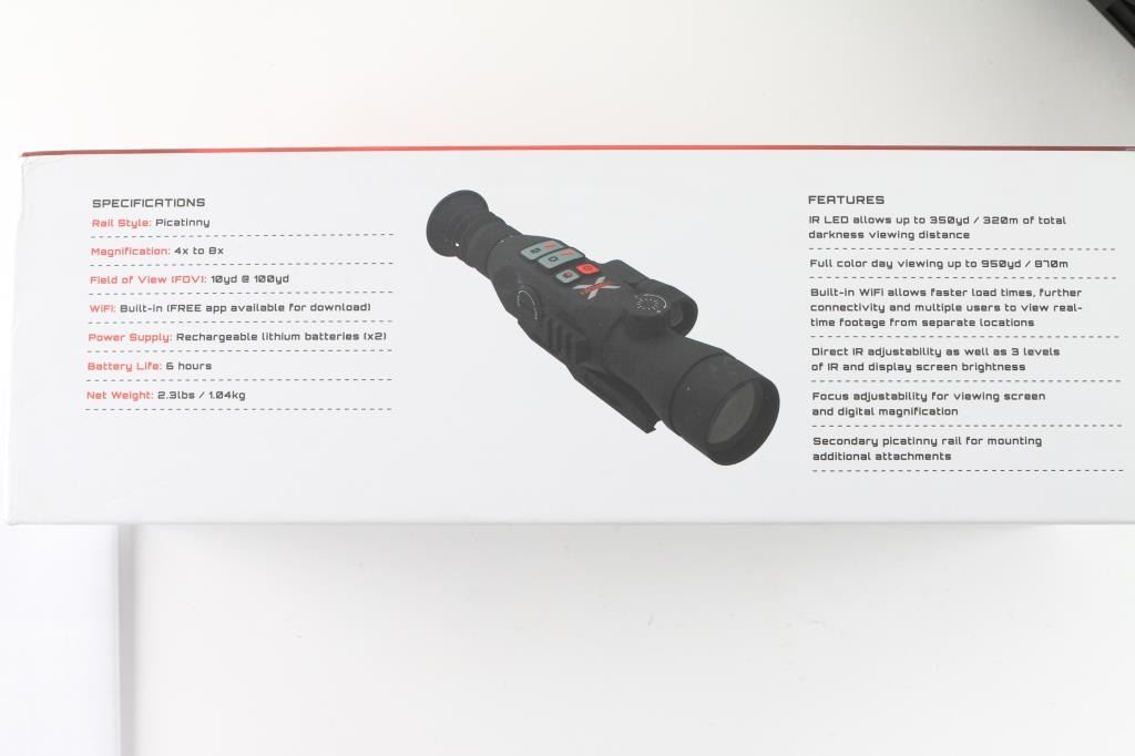 digital scope with integral infrared illuminator. Manufacturer states 350 yard range in total darkness. 4x to 8x magnification. Mounts to Picatinny rail. Small accessory rail on right side. Internal battery with USB charger and power plug. Has photo & video capability, WiFi connectivity. Like new in original box with paperwork. Approx 11" long.