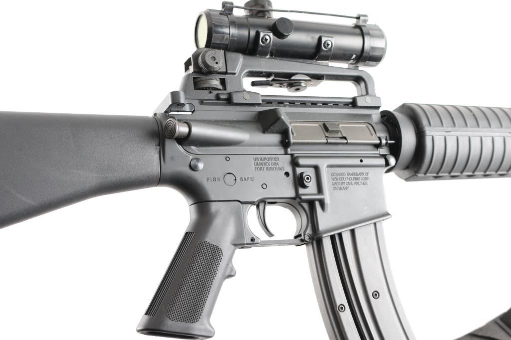 Made in Germany by Walther under Colt license, and imported by Umarex. Chambered in .22 LR HV (High Velocity) 21.2" barrel with A2 front sight, and birdcage flash hider. Has all the features of an M16, charging handle, faux forward assist, dust cover, and bayonet lug. Black synthetic stock, and round handguards. Bore appears excellent, needs cleaning, metal finish, and furniture are very good, a couple of minor scratches. Comes with black nylon sling, and 30 rd magazine. Carrying handle is mounted with a Al Rumaih 3x20 scope, clear optics. NRA Condition-Near Excellent Modern Firearm.