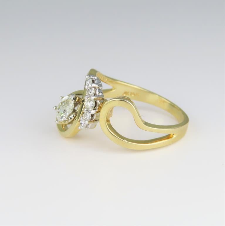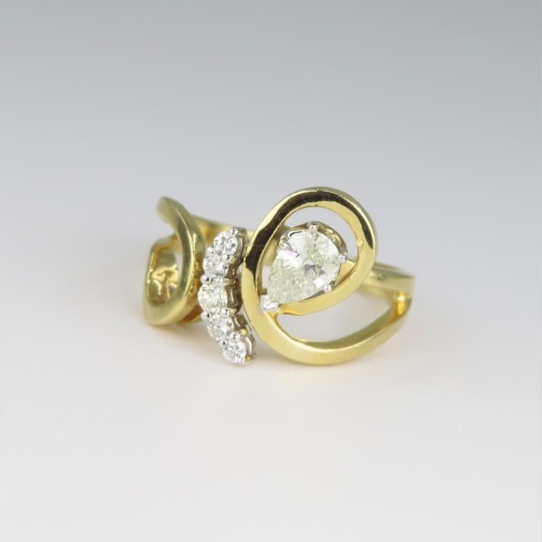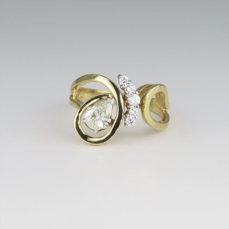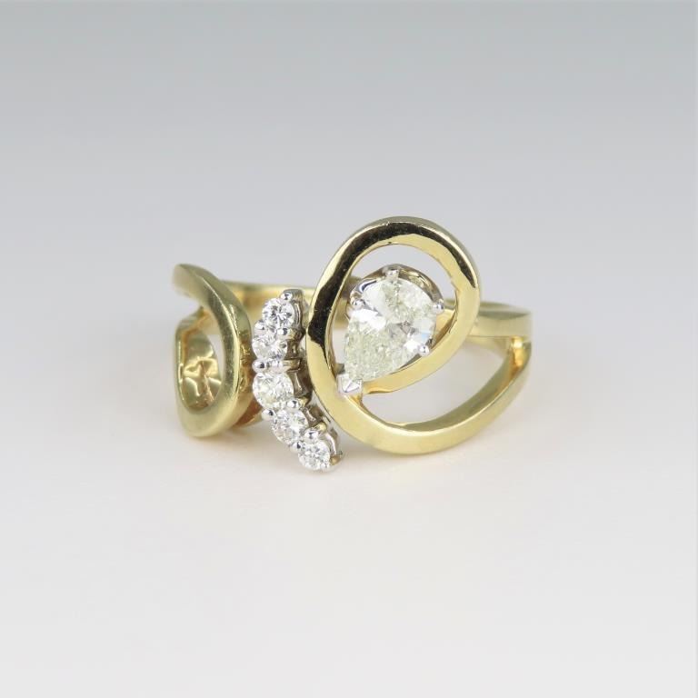 featuring a Pear shape Diamond weighing approx. 0.60 carats with H-I color and SI clarity with 5 ‘IDEAL’ cut accent Diamonds weighing approx. 0.30 carats with H-I colors and VS clarity set in 14 karat yellow gold setting. Retail $3,000-$4,000