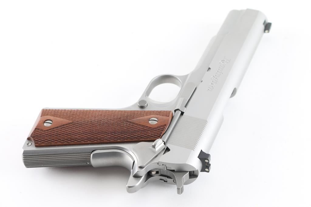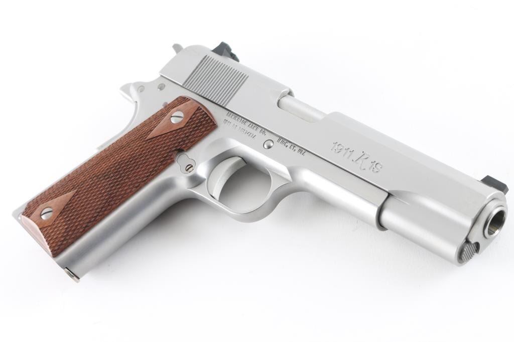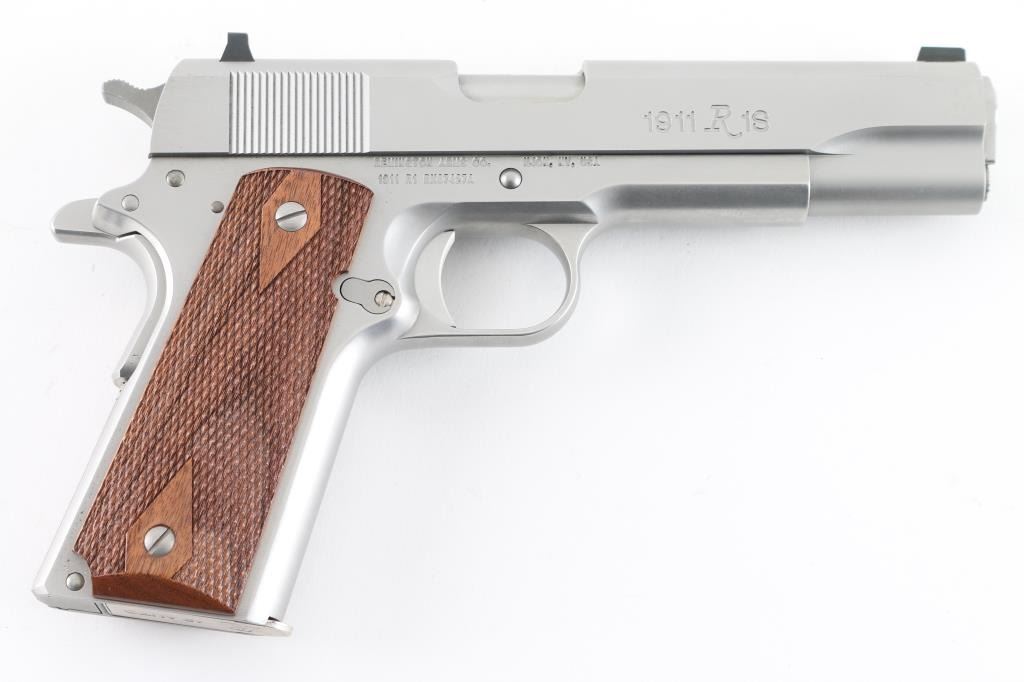 All stainless steel 1911 style single action semi-automatic pistol. Features a satin finish, 5" barrel, dovetailed three-dot sights with drift adjustable rear sight, serrated trigger, serrated hammer spur, thumb safety, grip safety, push button magazine release, serrated flat mainspring housing and two-piece double diamond checkered walnut grips. Pistol exhibits little to no visible wear. Action is strong, bore is excellent and wood grips are fine. Includes the original factory hard case with lock, take-down tool and (2) magazines. Condition is NRA Excellent *** Modern Firearm ***