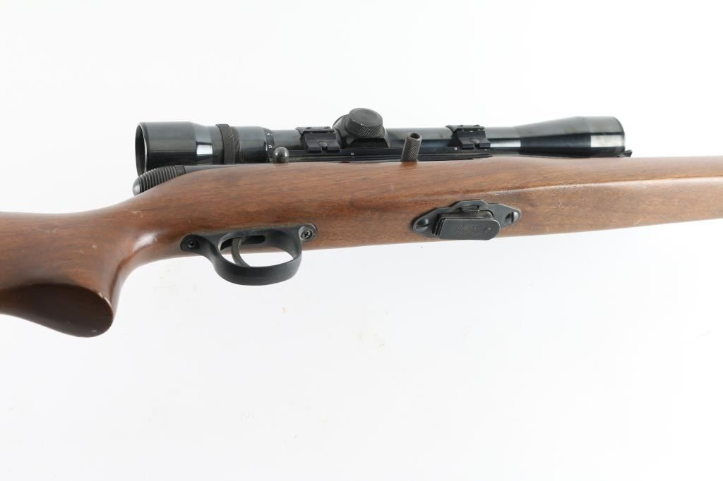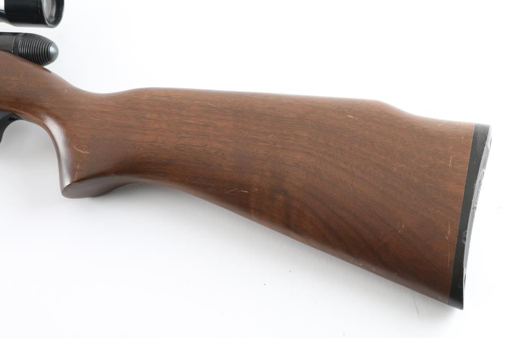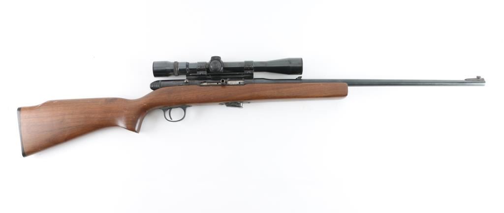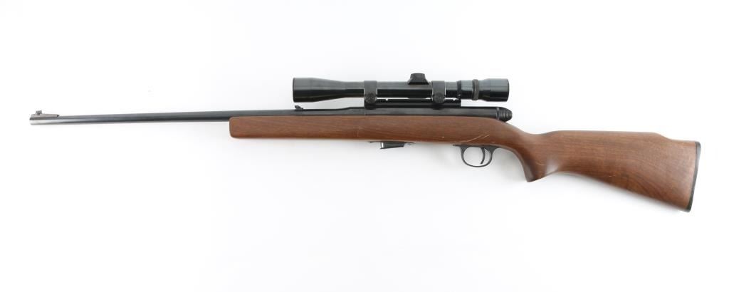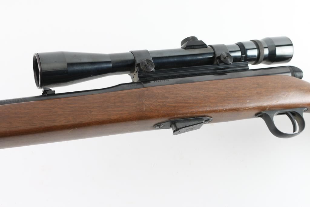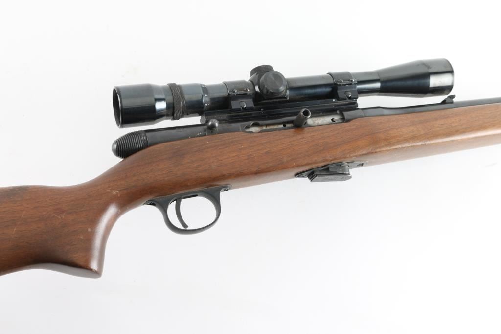 Semi-Auto rim fire rifle chambered for .22 Winchester Magnum Rimfire cartridges. It has a 22" blued barrel, raised blade front sight, flip up rear, thin serrated trigger, safety on the right side of the receiver and a detachable box magazine. The wood stock is plain straight grain with black H&R butt plate. Metal finish looks good overall with some small spots of surface rust on the barrel and accumulated dust and dirt on the receiver. Wood stock looks good with a couple of scuffs and scrapes but nothing bad. Bore looks good, dusty. LOP is 14.25". Condition is NRA Good+