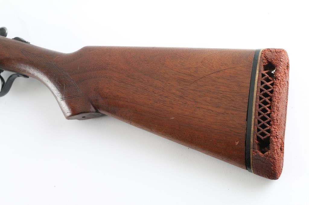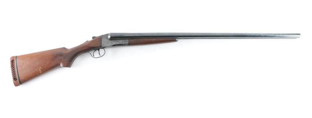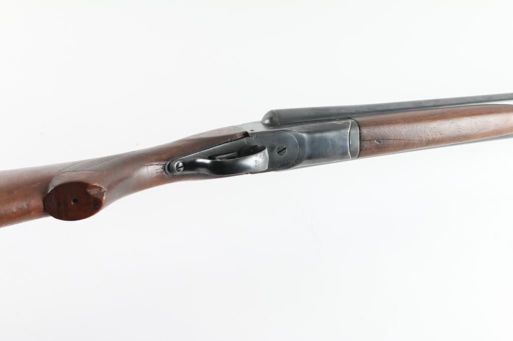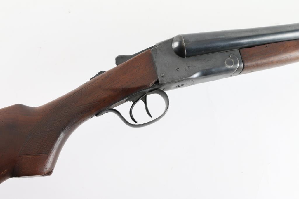 Vintage American double barrel side by side boxlock shotgun manufactured 1921-1948. Features blued finish, wood stocks with shallow cross-hatch patterns cut into wrist and forend, ventilated rubber recoil pad,(Recoil pad is dried/cracked, needs to be replaced) double triggers, extractor, sliding tang safety (opening action moves to safe position), 30" barrels, CYL/IM choked, steel bead. LOP 14.25". Bores are very good condition, needs cleaning. Retains 80% blue with scratches and handling/edge wear, receiver, and triggerguard have areas of pitting. Wood is good overall, but has a 2" crack on the underside of the forearm, and a minor crack behind the lower tang, some finish loss, with good fit to metal. Numbers match on barrels, receiver, forend iron. NRA Condition-Fair C&R Firearm