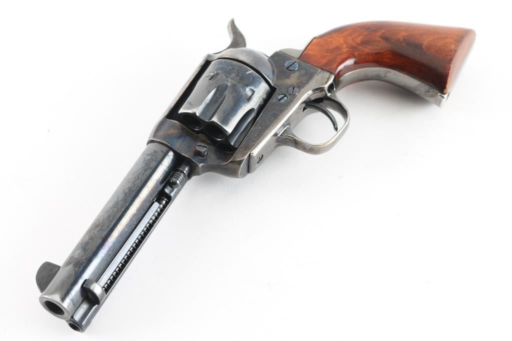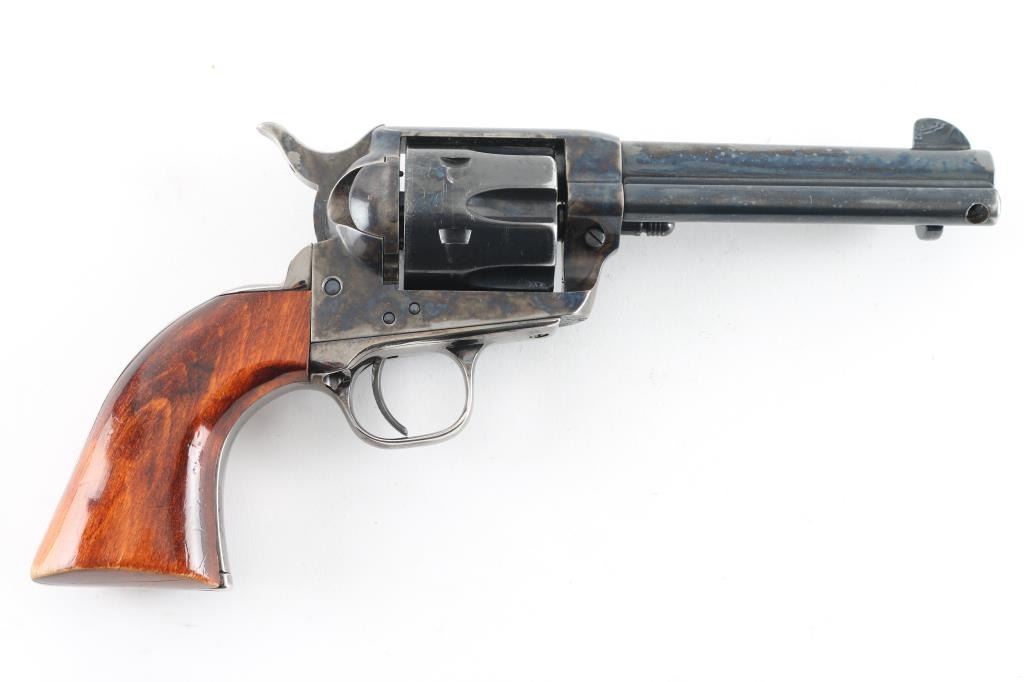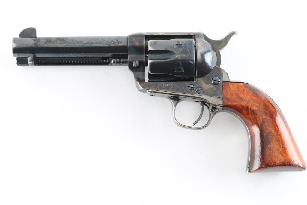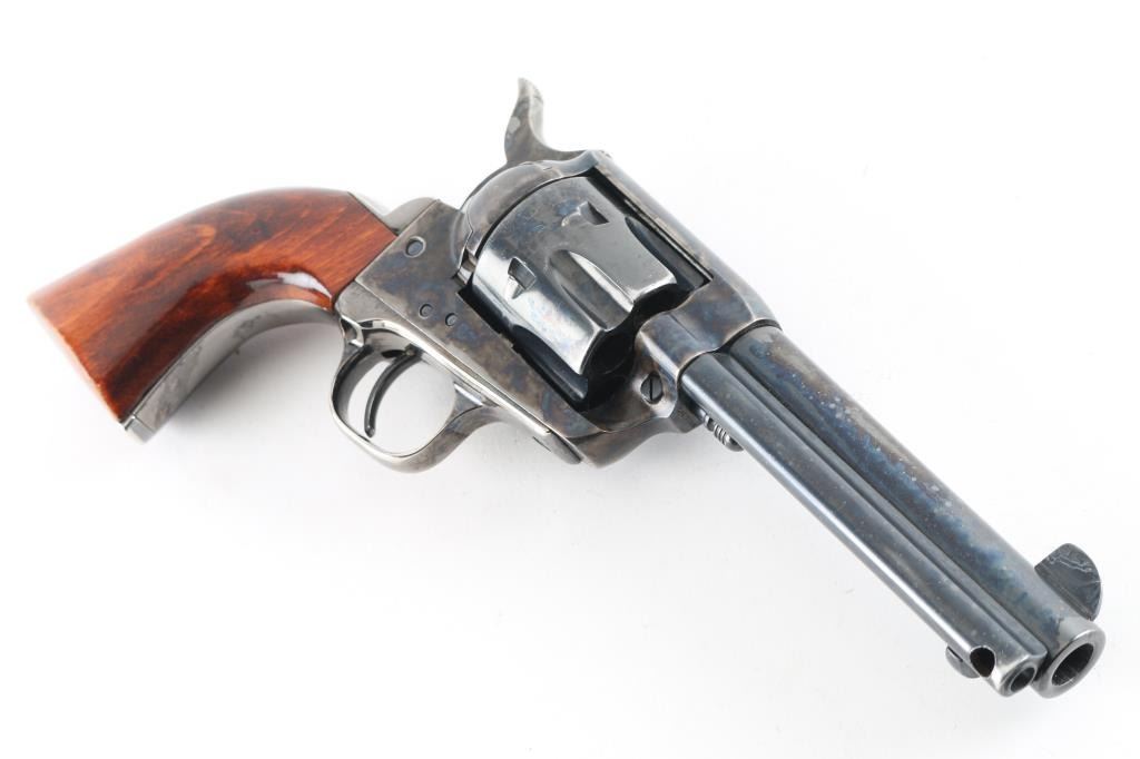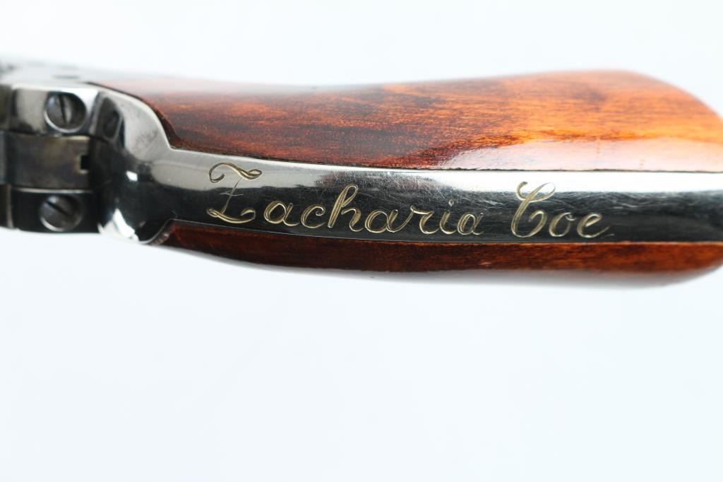 Single action revolver made in Italy by ASM, imported by EMF, Santa Ana CA. Features blued finish, case color receiver, smooth wood grips, 4.75" barrel, fixed sights, ejector rod under barrel. Bore appears very good, strong rifling. Action is crisp/tight. Grips are very good with minor wear/scratches. Metal finish is about 94% with some muzzle/edge wear, scratches, and slight tracking on the cylinder. The backstrap in engraved in script "Zacharia Coe". There is a Zacharia Coe who was President of the "Cochise County Cowboys". NRA Condition-Very Good. Modern Firearm.