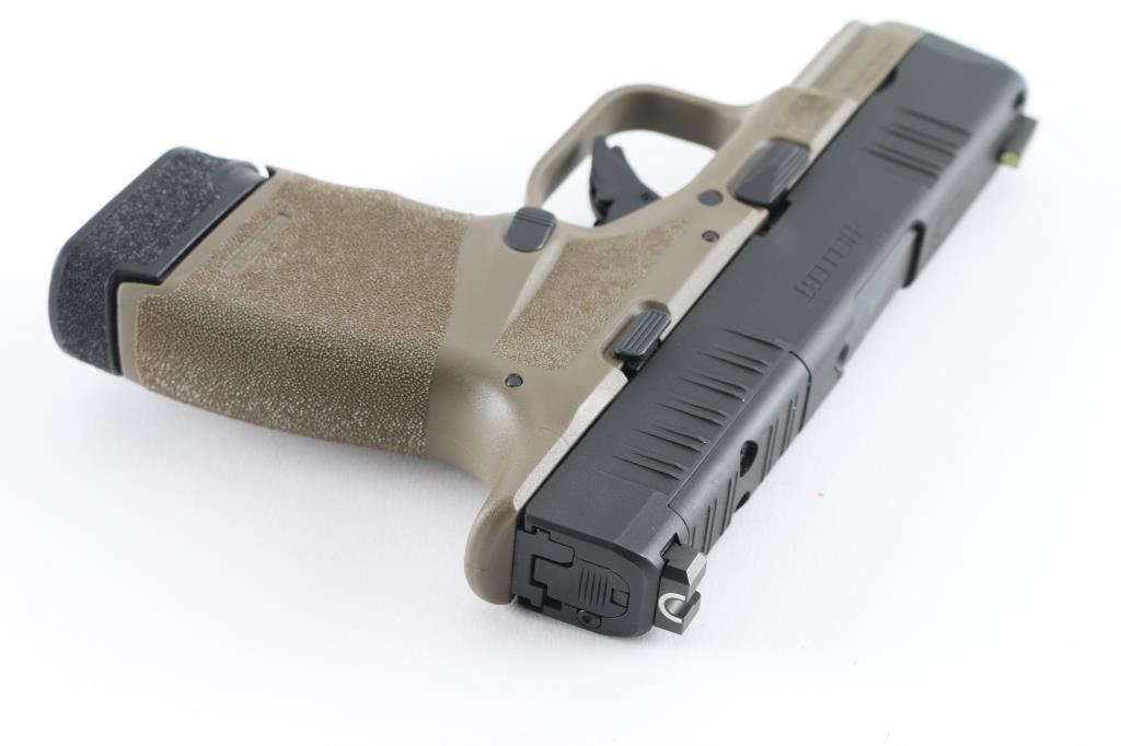 Made in Croatia this is a compact 9mm pistol. It has a 3" barrel, yellow ring night sight on front, white outline U notch rear sight, black slide, textured FDE polymer frame and safety trigger. Metal finish looks great. Frame looks Great. Bore looks great. Comes with original factory cardboard box, owners manual, extra magazine, lock, soft case and an unmarked OWB synthetic holster. Condition is NRA Excellent. *Modern Firearm*