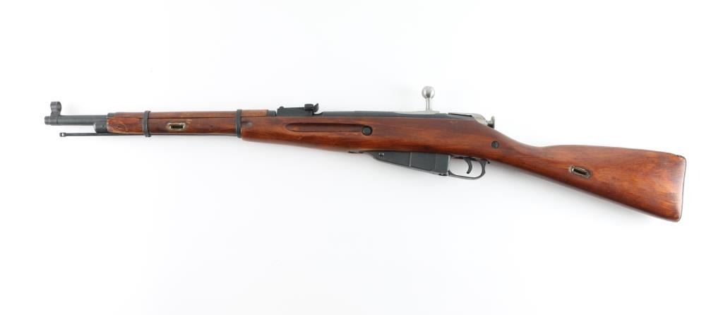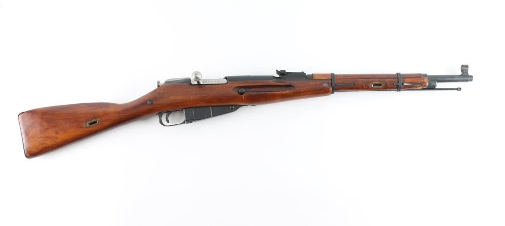 SN: M3809946. WW2 Russian Army carbine. Blued metal finish, with wooden stock, and forearm. 20" barrel, with tangent rear sights. Hooded adjustable front sight post. Bore is very good. Action is smooth/tight. 5-rd attached box magazine. Chrome bolt. 1944 dated barrel. Original serial number matched on barrel, magazine floorplate, bolt, and steel butt-plate. Imported by Century Arms. which assigned a new SN. (Left chamber) cleaning rod present. Blue metal is about 95%, with wear on the edges. Small scratches. Wood is very good. NRA Condition-Very Good. C&R Firearm