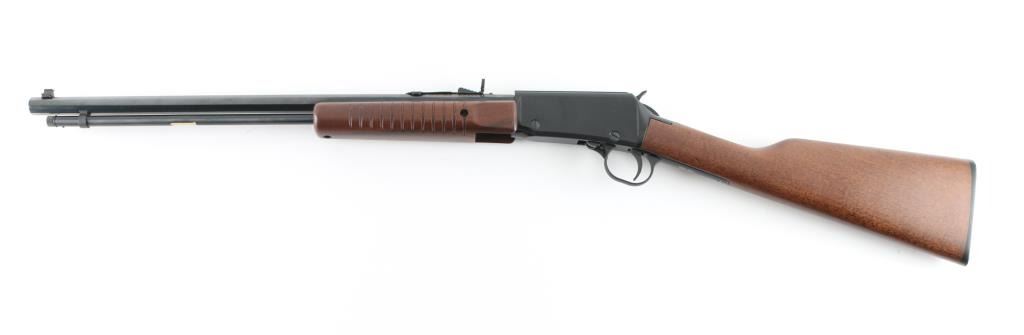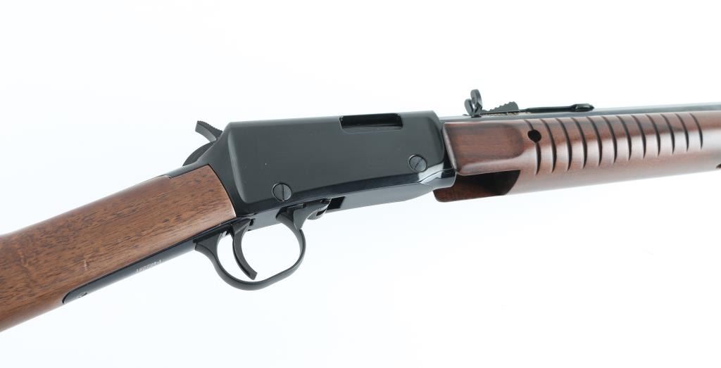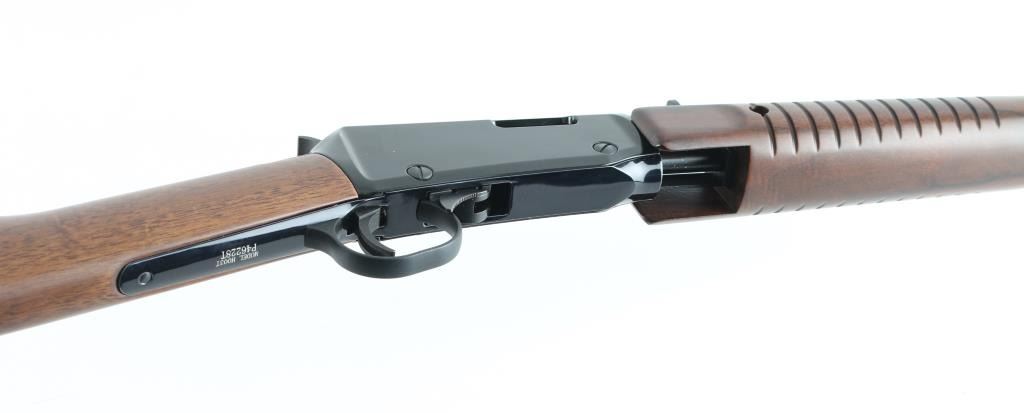Pump action rimfire rifle features blued finish, smooth walnut stock with straight wrist, grooved walnut pump handle, 20" octagonal barrel with full length magazine tube underneath, buckhorn style sights, factory plastic buttplate. Bore is excellent. Overall external condition is like new with few signs of handling. Includes factory box, manual. Condition is NRA Excellent - like new *** Modern Firearm ***