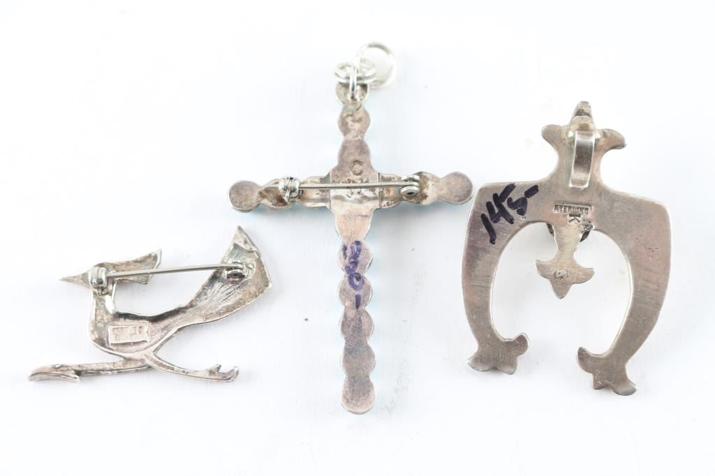 Includes turquoise and sterling cross, a sterling road runner pin, and a sterling naja pendant.