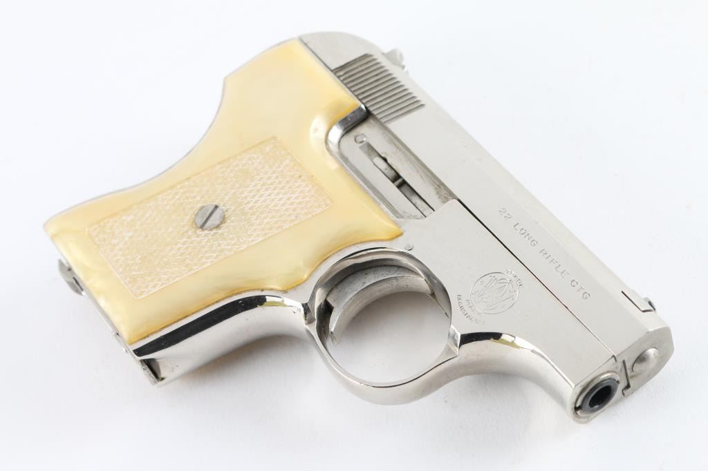 'Pocket Escort' Single action semi-automatic concealed hammer pocket pistol chambered in .22 Long Rifle, manufactured circa 1970. Features a nickel plated finish, 2 1/8" barrel, blade front sight, dovetailed rear sight with square notch, cocked indicator, manual safety on left side of the frame, heel magazine release, factory 5 round magazine, smooth trigger, and two-piece checkered faux mother-of-pearl plastic grips. Includes a factory two-piece grey cardboard box with tools and matching label. Pistol exhibits approximately all of it's original finish showing light handling marks. Action is smooth, bore is excellent and the plastic grips are very good. Condition is near NRA Excellent in box. ***Modern Firearm***