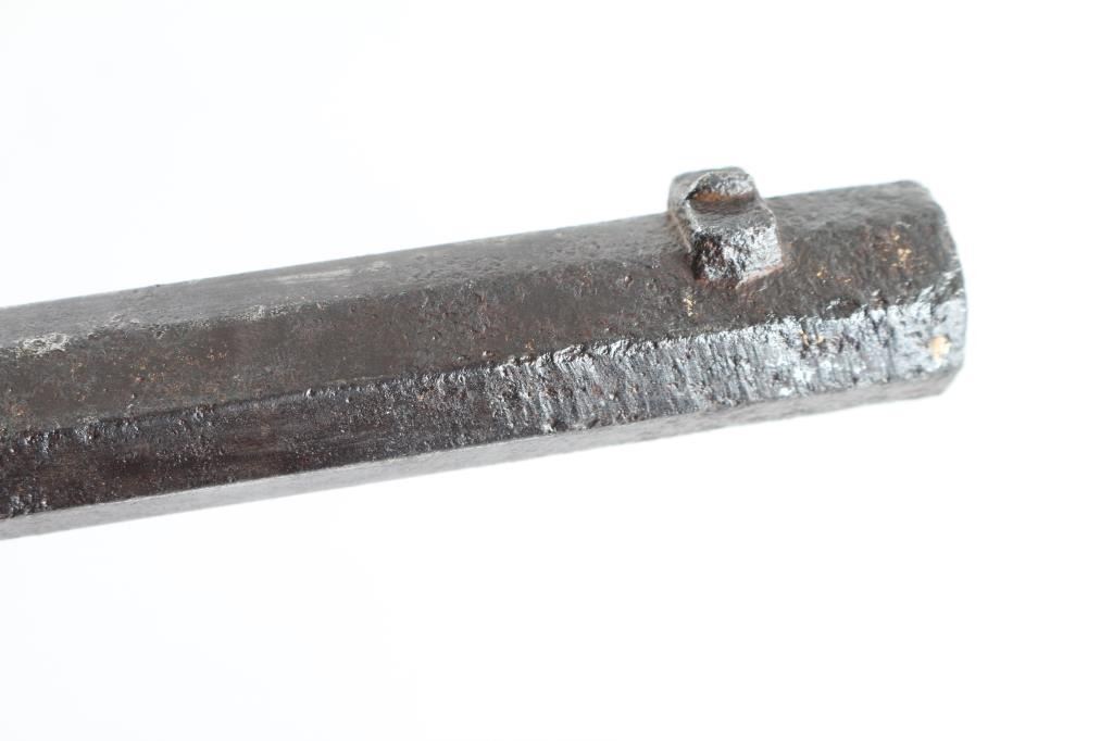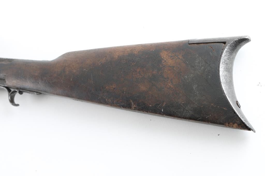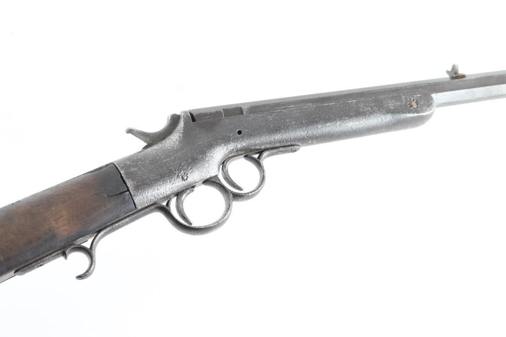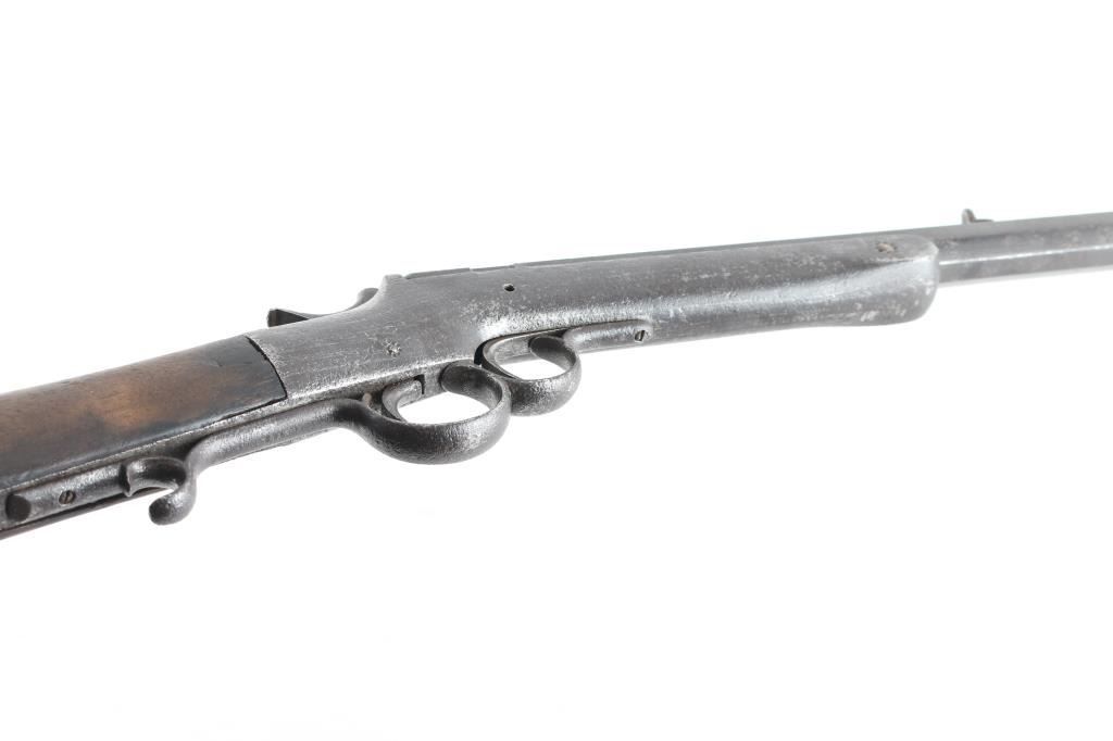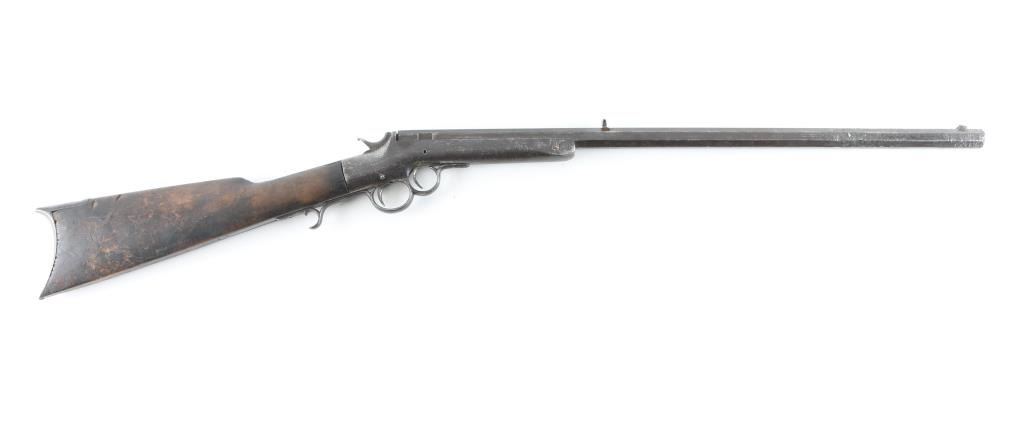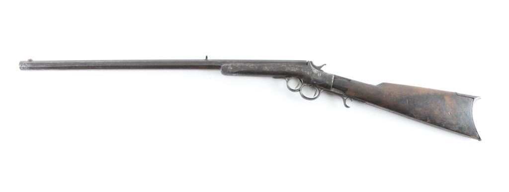 Single shot rimfire rifle, with medium weight octagon barrel of 24" in length. In fair to poor condition with missing exactor. Stock shows scorching from camp fires. And early frontier era cartridges rifle. From the Jim and Peggy Aplan collection. Antique Firearm