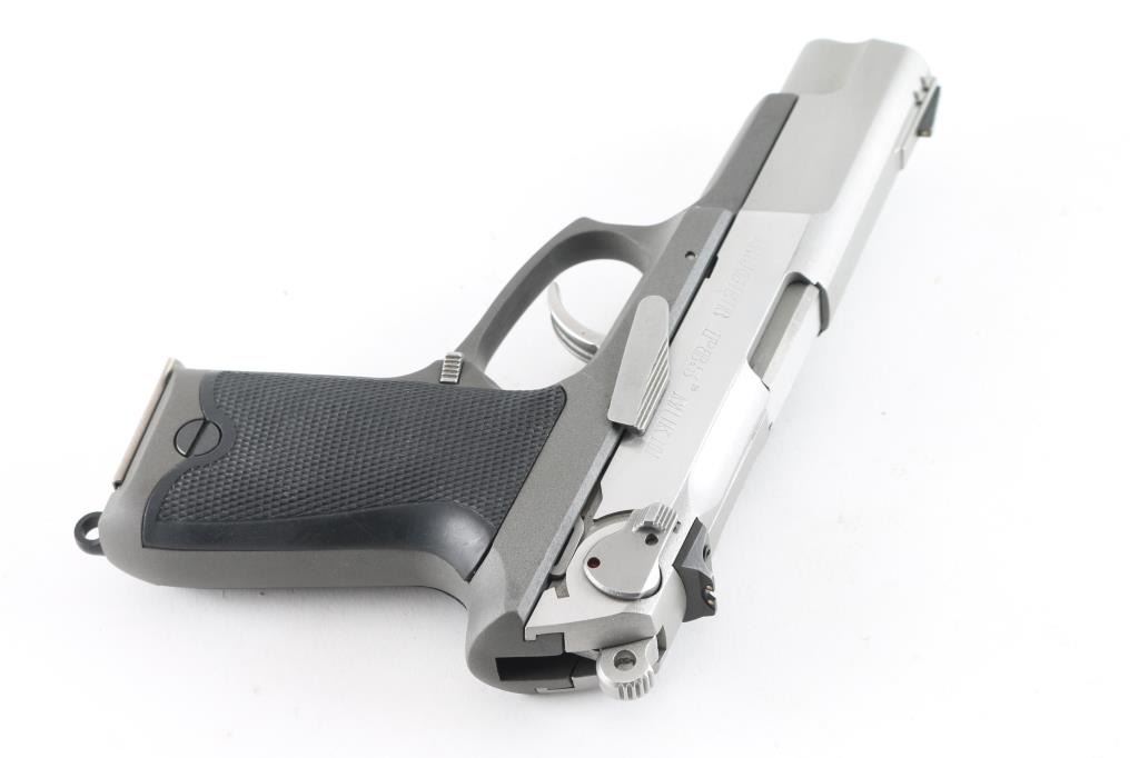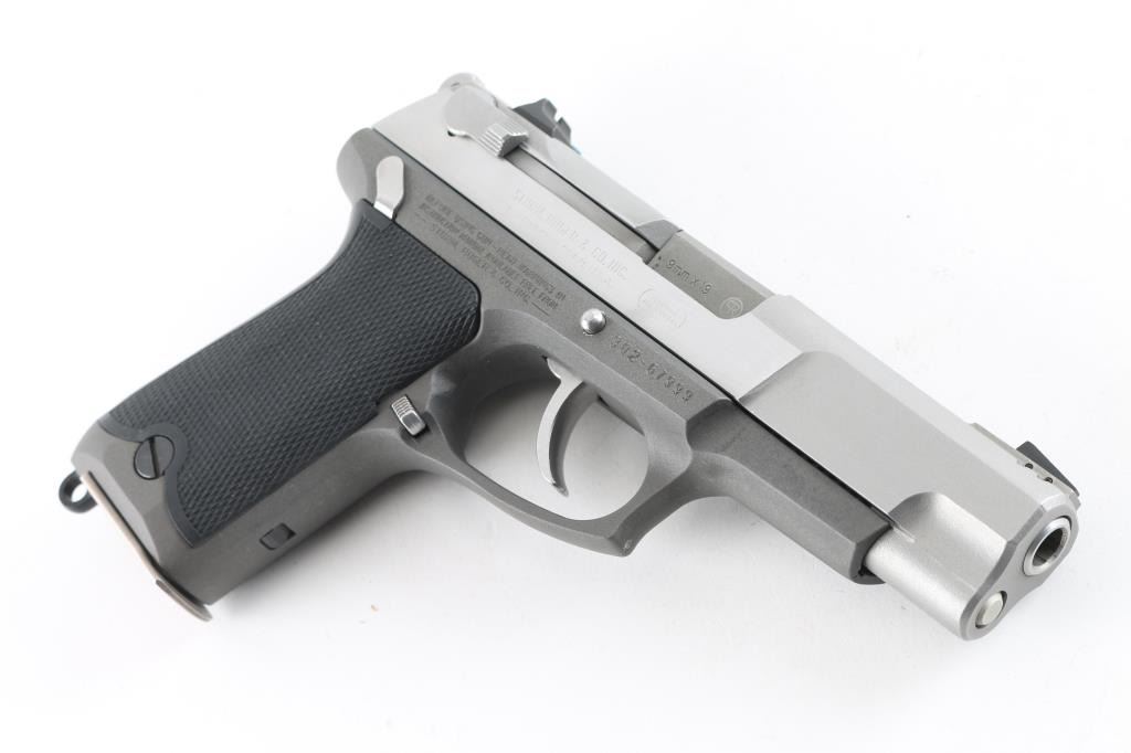 Double action semi auto pistol with 4-1/2" barrel. Alloy frame, Stainless steel slide, checkered black synthetic grip panels, 3-dot sights, pinned front, and windage adjustable rear, ambidextrous decocking/safety lever and magazine release and lanyard ring. serrated hammer, smooth trigger. 15 rd magazine. Bore appears excellent, needs cleaning. Action is crisp/tight. Metal finish is very good with some minor scratches. Comes in original factory hard case with manual, and two spare 15 rd magazines (3) Total. NRA Condition-Near Excellent. Modern Firearm