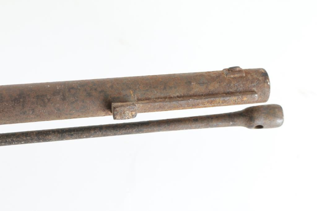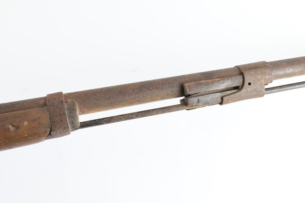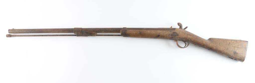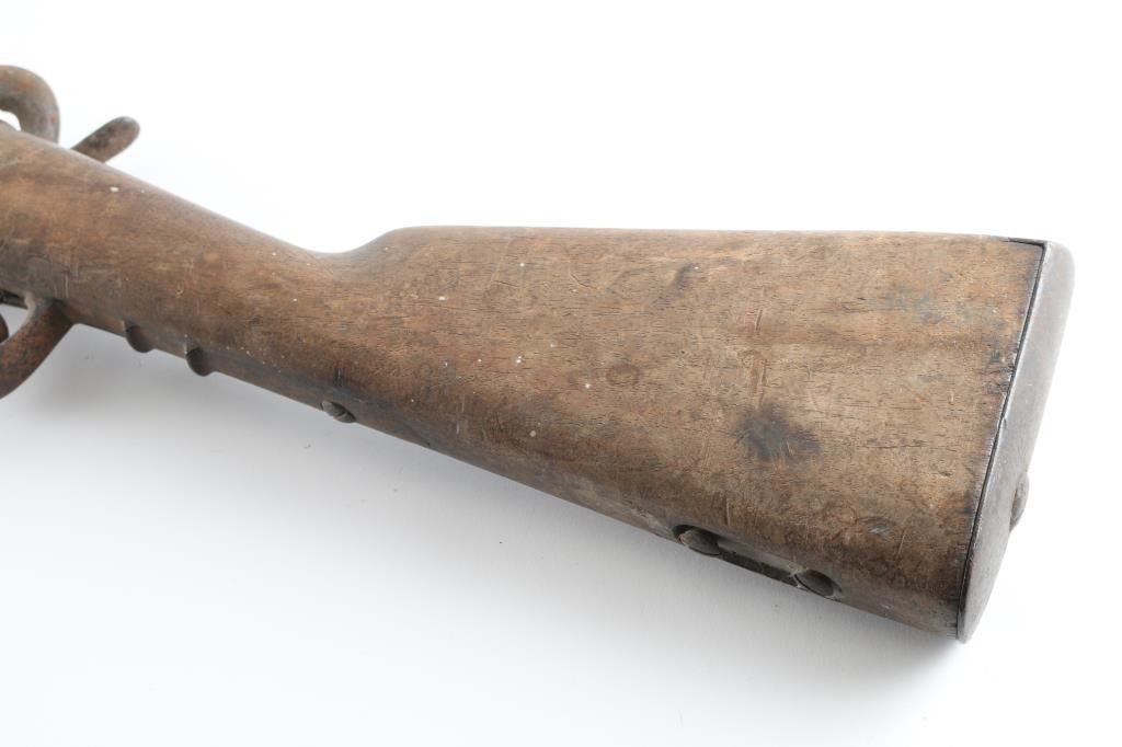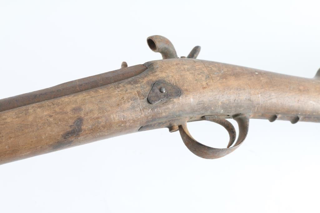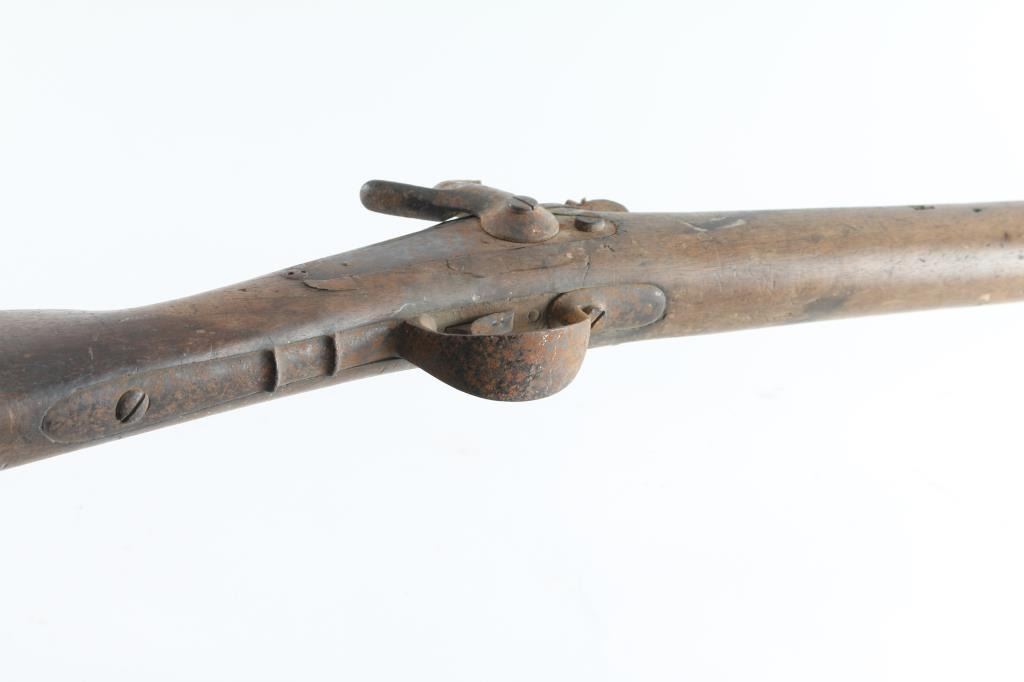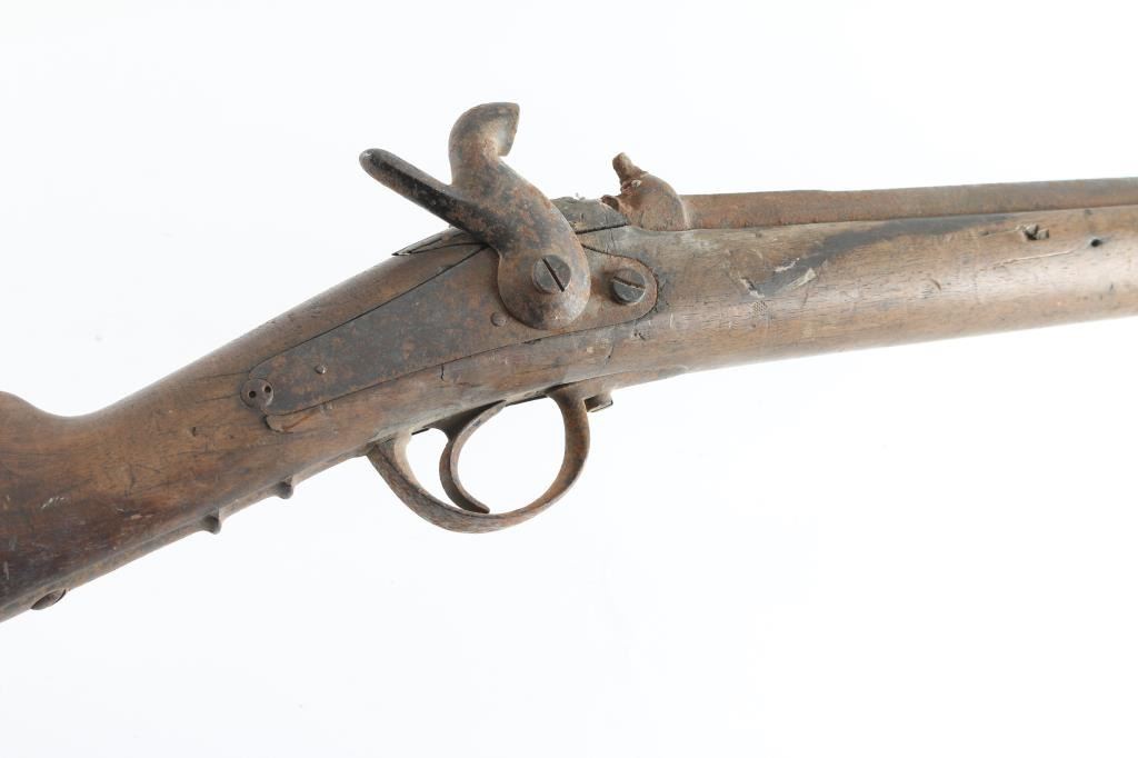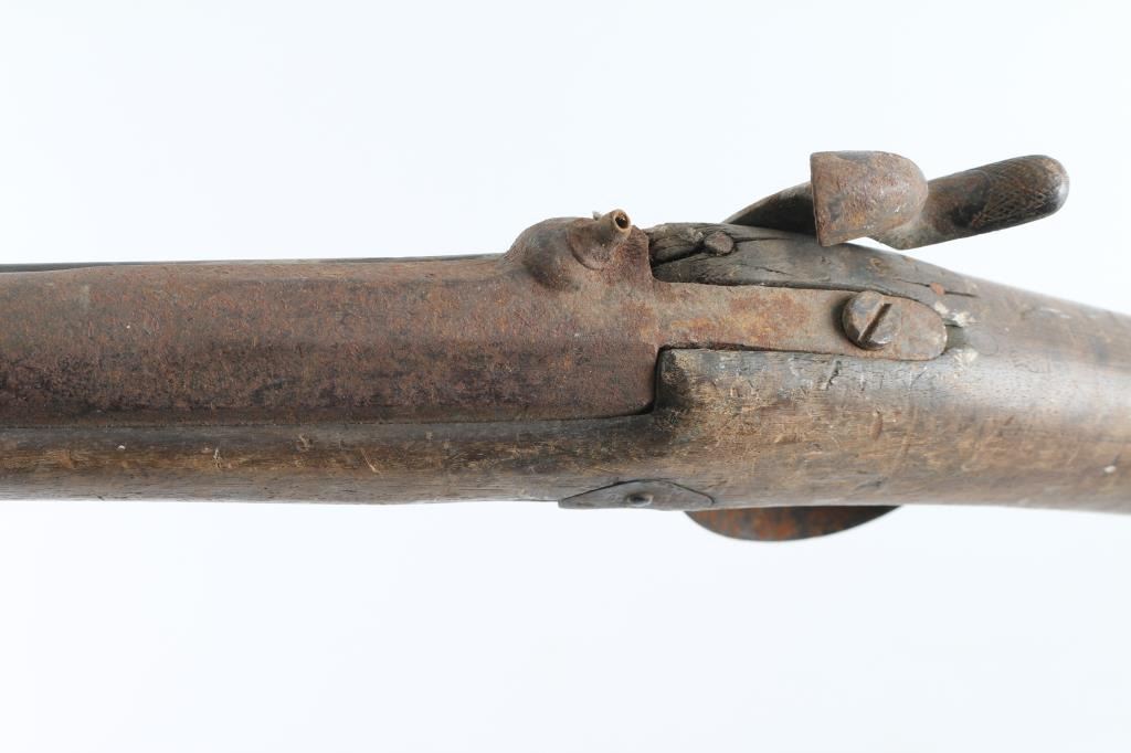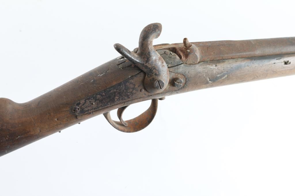 About 1850's-1860's, showing bayonet stud on right side of barrel for saber type bayonet. No markings or visible proofs. Relic condition "out of the attic" also uncleaned, for NRA poor condition. Some wood loss to forend and small parts missing. Rod retained and action not working properly. This relic came from the Jim and Peggy Aplan collection who traded with tribal people around piedmont S.D at his trading post and museum. Antique Firearm