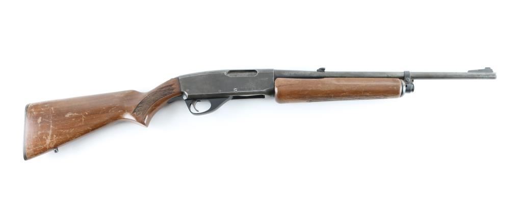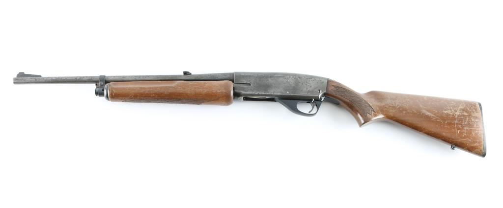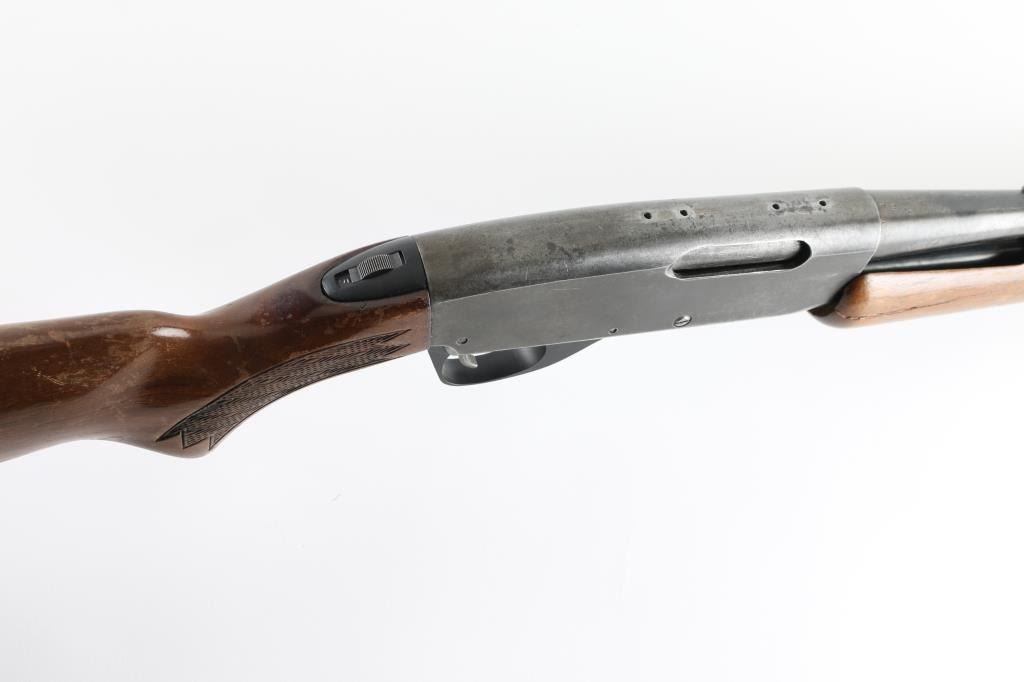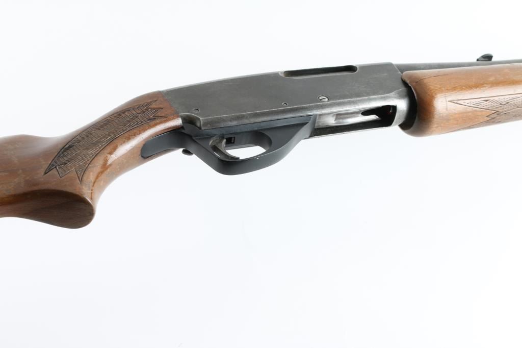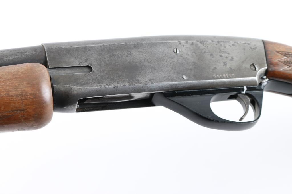 Tube-fed slide action sporting rifle chambered in .30-30 Winchester, manufactured in Westfield, MA circa 1970-1981. Features a blued finish, 18.5” tapered barrel, 3 round magazine tube, ramped blade front sight, adjustable flip-up rear sight, smooth trigger with beveled edges, sliding tang safety, drilled & tapped steel receiver, sling swivel studs, contoured walnut slide handle with pressed skip-line checkering and semi-pistol grip Monte Carlo shoulder stock with serrated black plastic buttplate. Rifle retains approximately 20% of its original blued finish showing handling wear, turning a mottled gray patina, with scattered pin-prick pitting . Action is stiff, the bore is dark/dirty, with strong rifling showing, may improve with cleaning. The wood stocks have numerous blemishes/scratches, there is a 2.5" crack on the lower right forearm. Condition is NRA Fair. Modern Firearm
