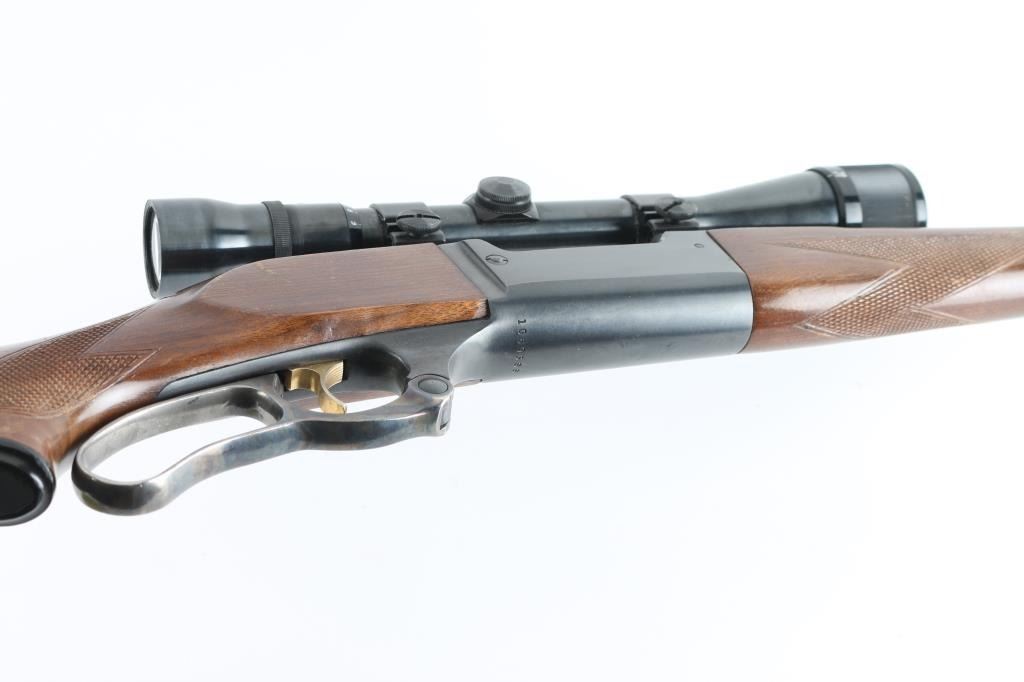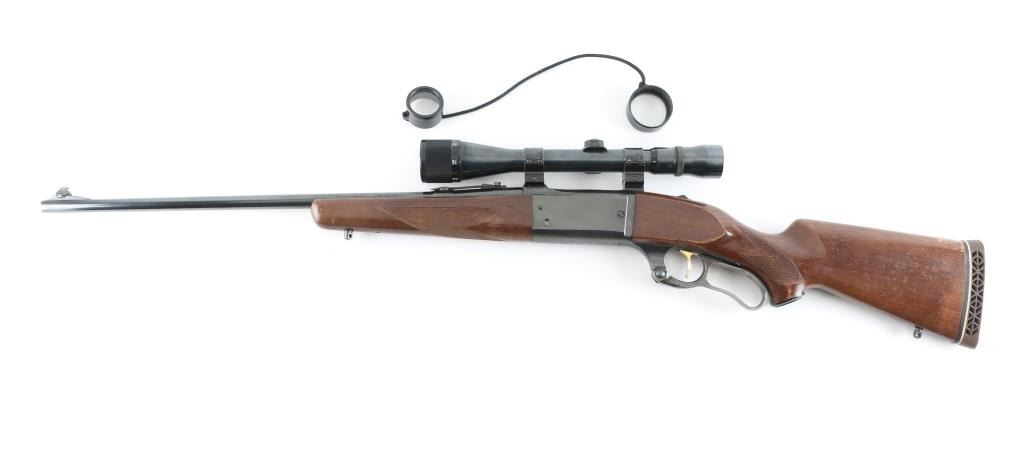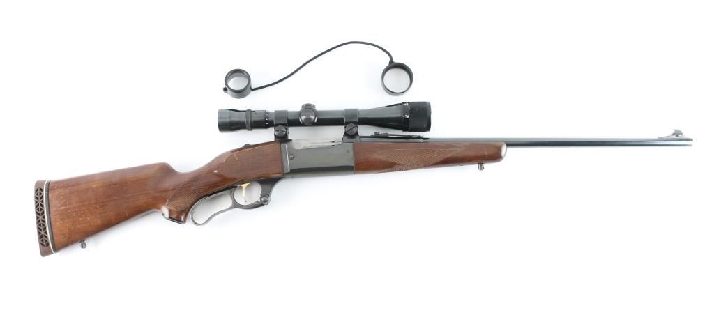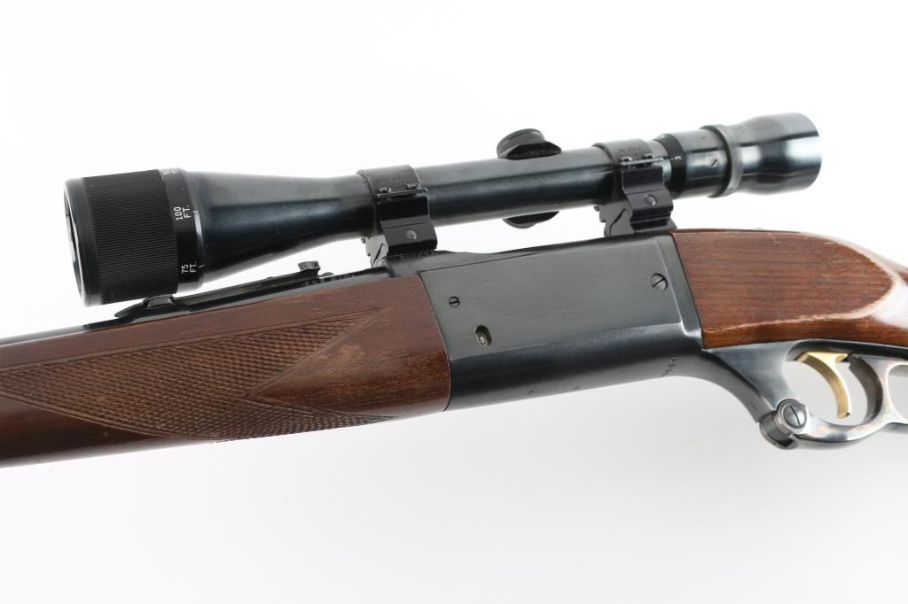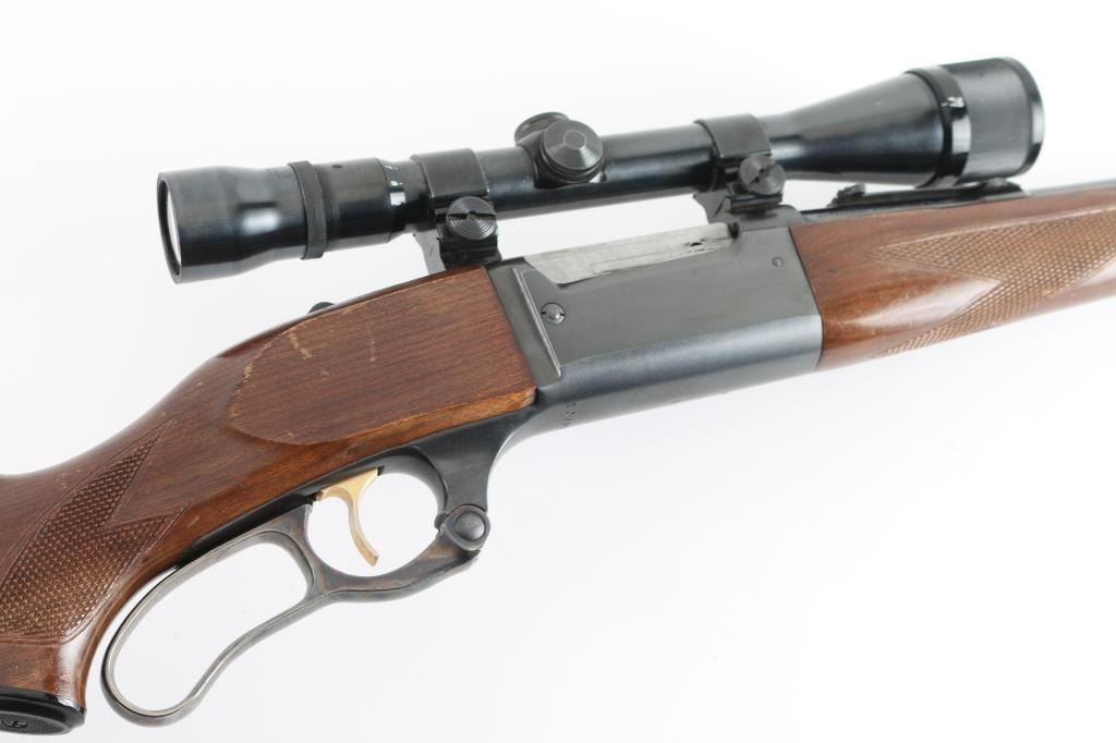 Vintage lever action repeating rifle chambered in .308 Winchester. Manufactured 1964. Features a blued finish, case hardened lever, 22" barrel, ramped brass post/bead front sight, flat-top rear sporting sight jeweled bolt, integral rotary magazine with round counter, brass cocked indicator, serrated gold trigger, sliding tang safety, swivel studs, press-checkered wood forend and pistol grip shoulder stock with White line recoil pad. Cartridge counter port on left receiver. Mounted with a Weaver V9 scope, with Weaver rings, clear optics. Rifle exhibits approximately 97% of it's blue finish showing some muzzle/edge wear, minor scratches. The action is smooth, bore appears excellent/bright, wood stocks are good/sound with scratches, wear to the edges, and some finish loss. NRA Condition-Near Very Good. C&R firearm