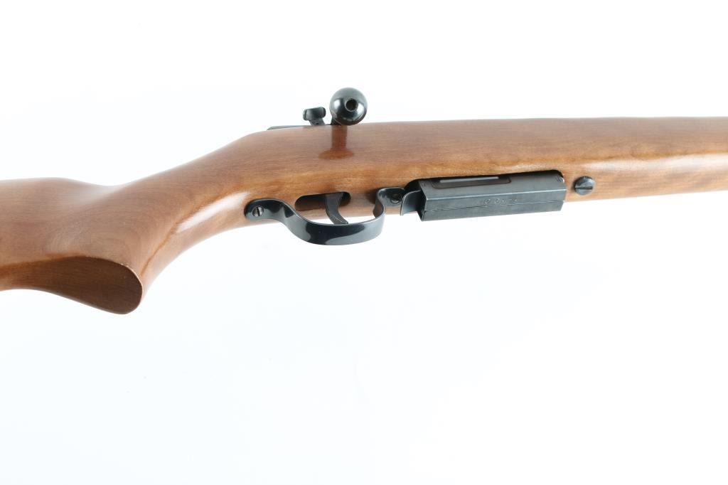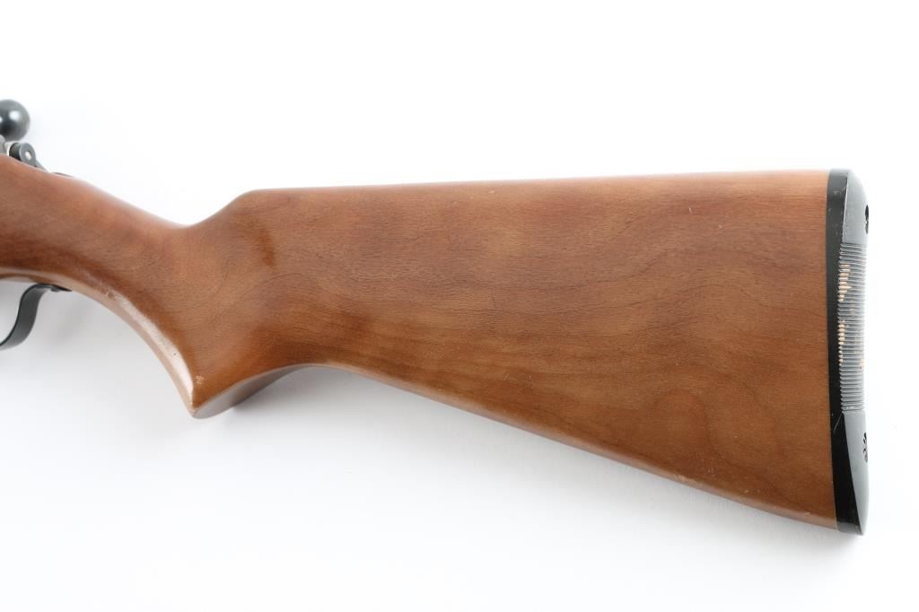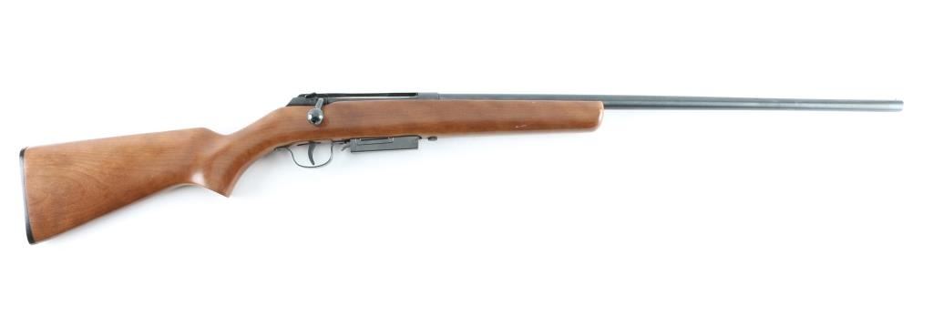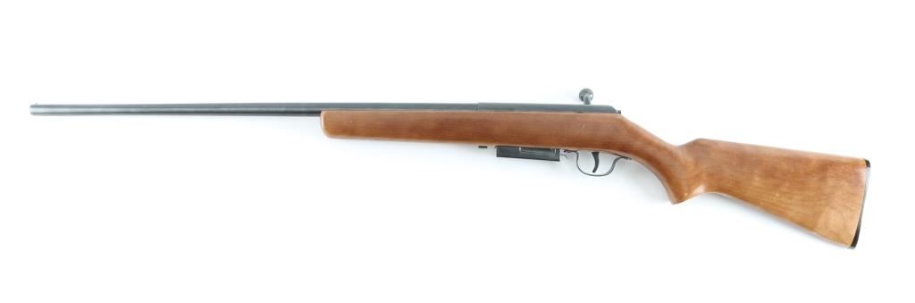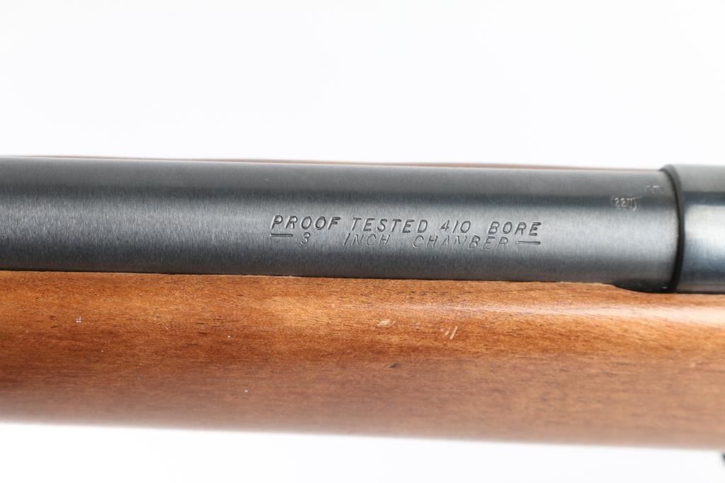 American made magazine fed bolt action shotgun chambered for 3" .410 gauge shells, manufactured pre-1968. Features a blued finish, 24" barrel, silver bead front sight, smooth trigger, manual thumb safety, detachable box magazine and smooth wood pistol grip shoulder stock with serrated black synthetic buttplate. Cocking indicator. LOP is 14" Shotgun exhibits approximately 98% of it's original finish showing slight edge wear, and a couple of minor scratches. Action is a little stiff, needs oil. Bore is excellent/bright and wood stock is near excellent with some very minor scratches. NRA Condition-Excellent. C&R firearm.