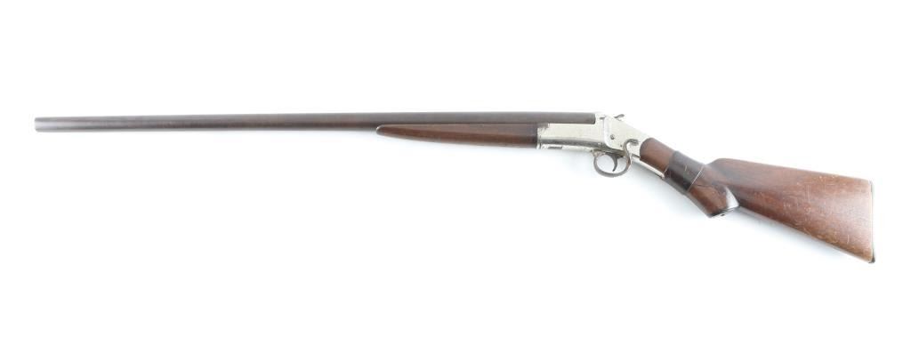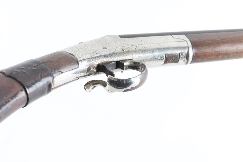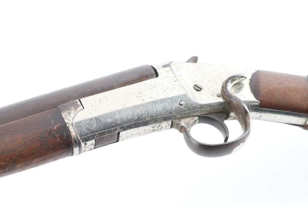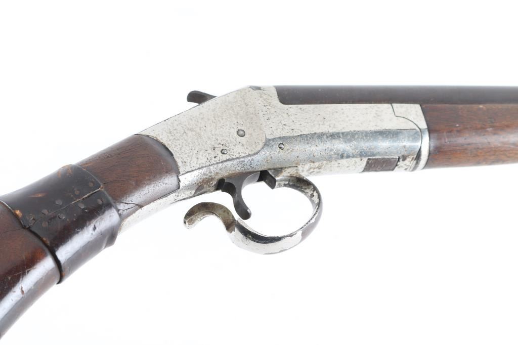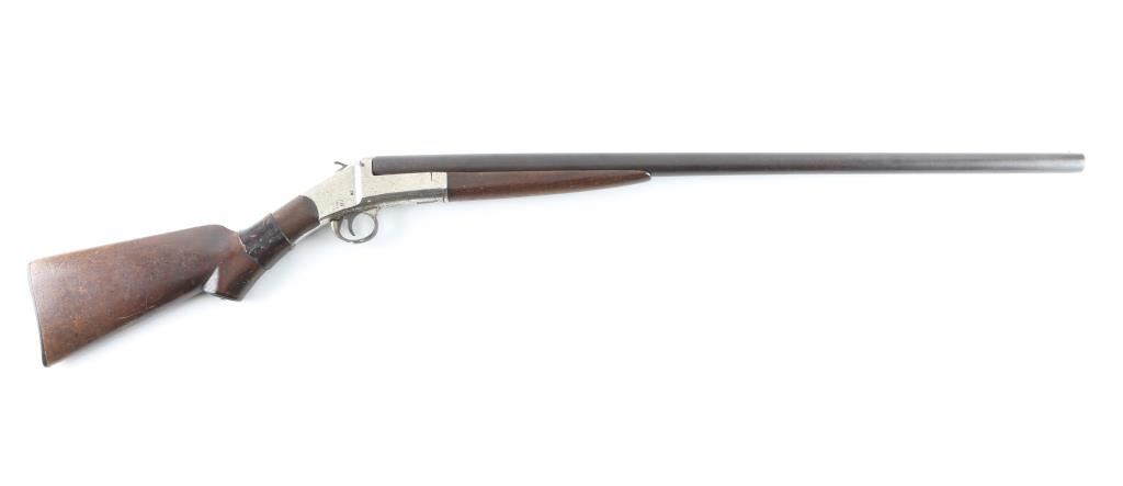 Single barrel break open shotgun features 30" barrel, brass bead installed, blued finish, nickel plated receiver plain wood stock & forend, plastic buttplate, side lever/triggerguard opening, exposed hammer. Bore is rough, some areas of pitting. Cylinder choke. Bluing has turned an even brown color. Nickel finish is starting to flake off, mostly non the triggerguard. Wood is poor. with a cracked wrist that has been repaired with a strip of leather. Barrel does not lock up tight. Needs gunsmith repair before attempting to fire. Condition-Poor. C&R Firearm