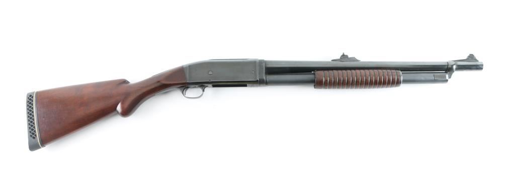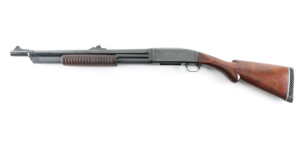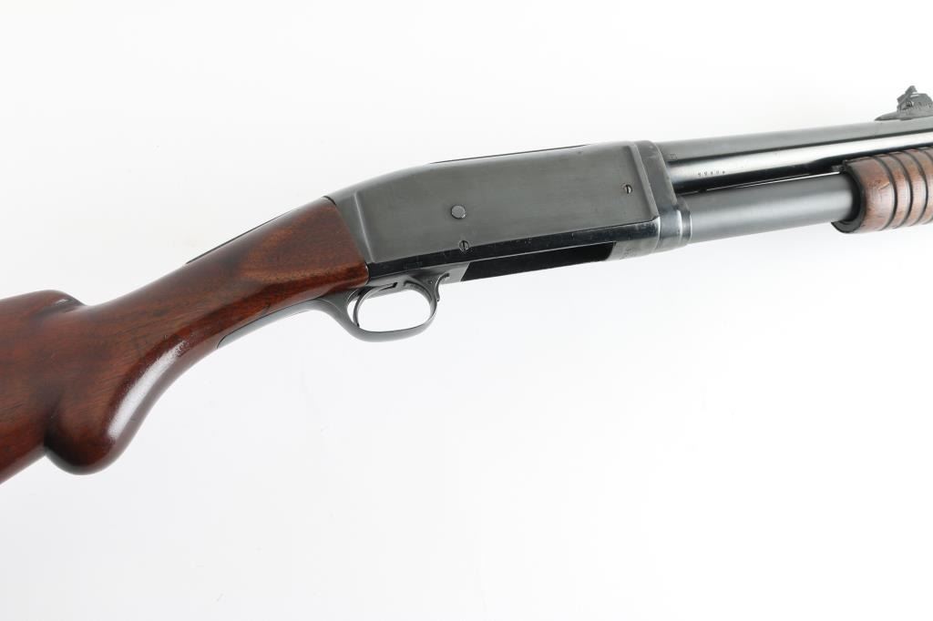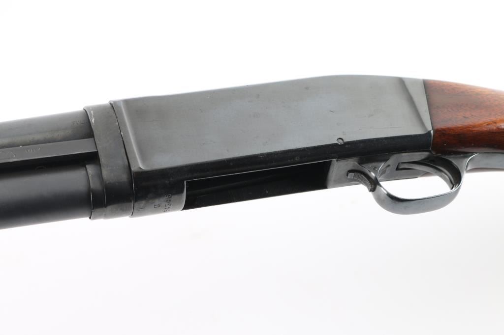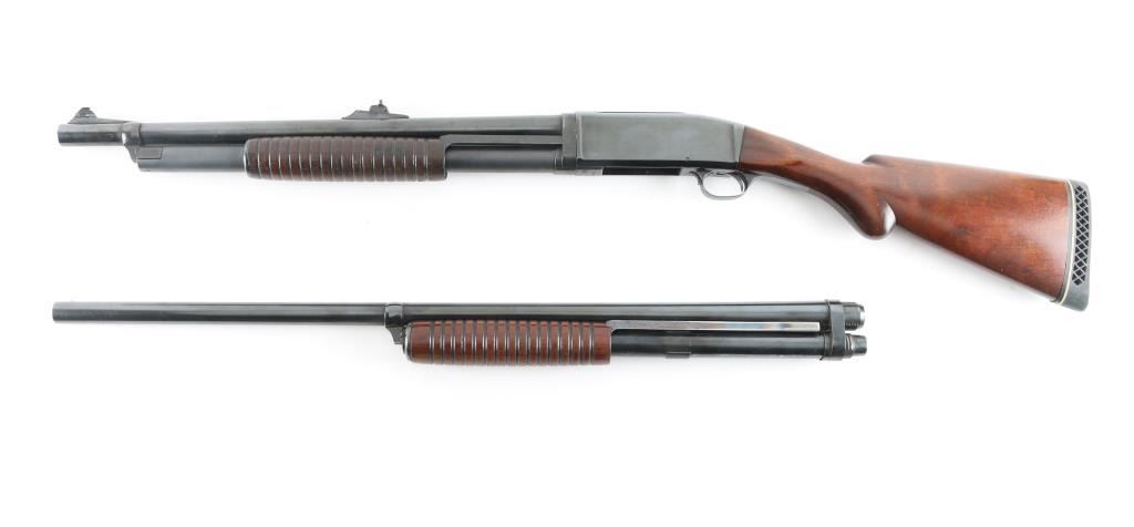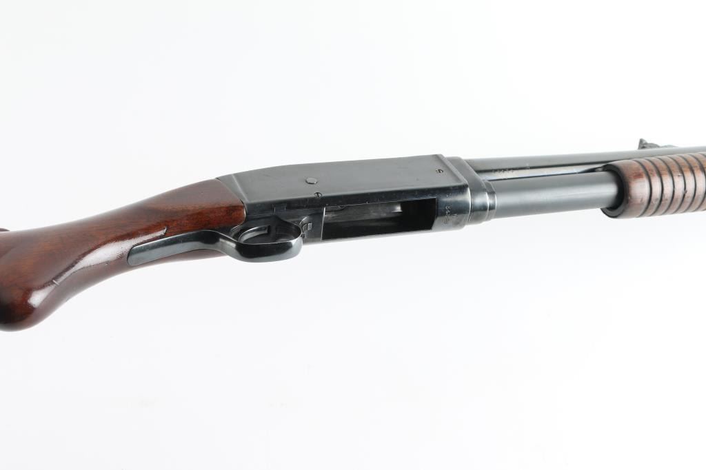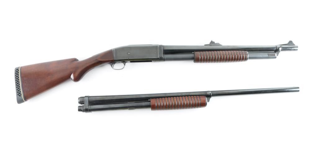 Shotgun has been professionally re-blued, wood refinished. restored Pump-Action. Vintage shot-gun produced 1908-1929. 6-rd tube magazine. 20" slug barrel, with ramped post/bead front, and sliding, adjustable notch rear sights. 2 3/4" chamber. Internal striker within the bolt. Bottom ejecting. Full choke. Manual safety on triggerguard. Serial numbers mismatched on barrel/receiver. Bore appears very good, but dirty. Smooth stock and ribbed forearm are very good, with some handling loss on the forearm. reblued finish is about 90% with scratches/rubs, some handling loss to the upper barrel. Comes with extra 30" round barrel, silver sighting bead, full choke. This barrel is matched to the receiver. LOP is 13 1/4". NRA Condition-Very Good as Refinished. C&R Firearm