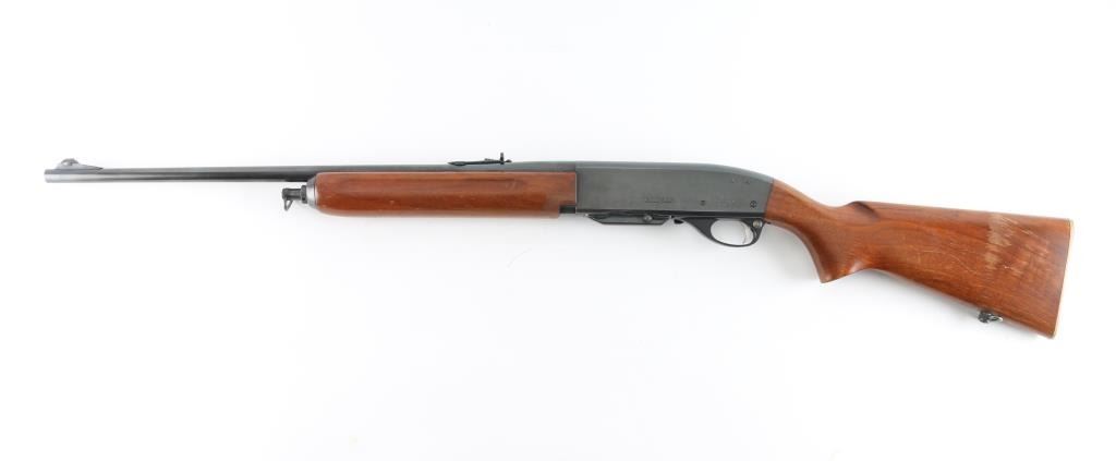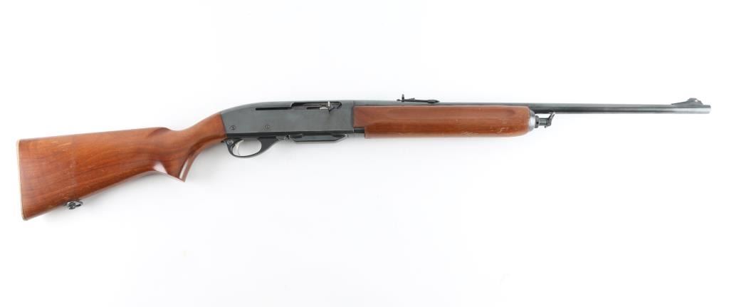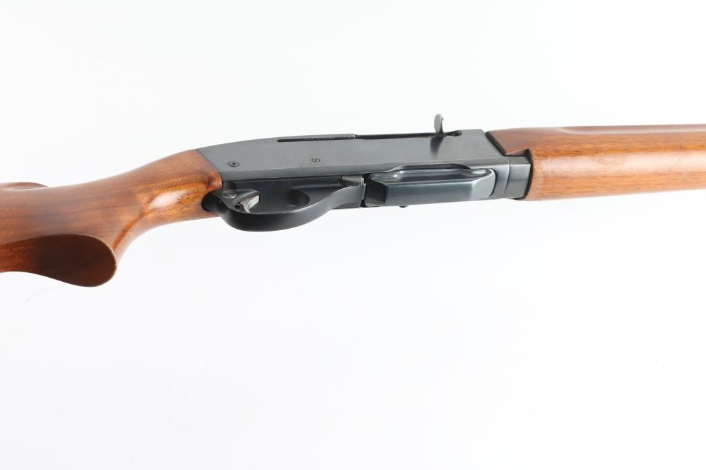 "Woodmaster". Semiautomatic rifle features blued finish, smooth wood butt & forend, 22" barrel, blade front sight, adjustable rear sight, manual safety, sling swivels, receiver drilled & tapped on top ( no filler screws in holes). Bore is very good condition. Metal retains 95% coverage of blue finish, with scratches on the receiver. Wood is sound/Good , scuffs & scratches in several places. Includes (1) magazine. NRA Condition-Very Good. Modern Firearm.