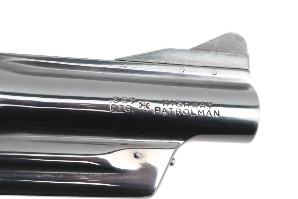 Highway Patrolman, "Pre Model 28", manufactured circa 1954. Blued six shot double action revolver chambered in .357 Magnum. Features a pinned & tapered 4" flat rib barrel, shrouded extractor rod, fluted cylinder with beveled edges, ramped, serrated, front sight ,adjustable micrometer click rear sight, serrated trigger, and checkered wide hammer. Checkered walnut grips with S&W medallions. Blue finish is about 97% with a couple of rubs, edge wear, and slight tracking on the cylinder.. Bore is excellent/bright and action is very smooth. Grips are excellent. Revolver has not seen much use. NRA Condition-Near Excellent. C&R Firearm.