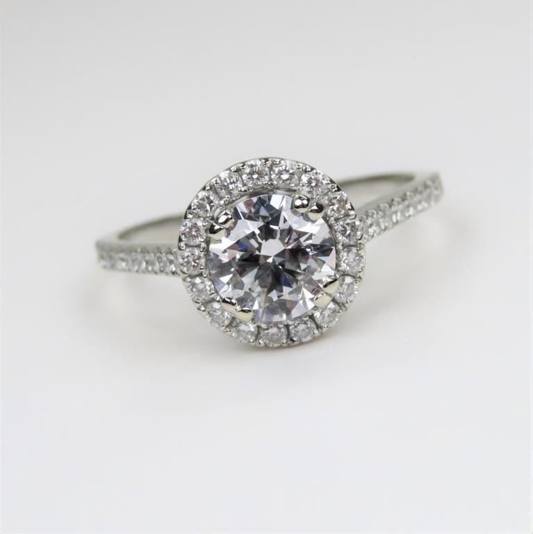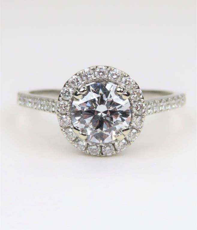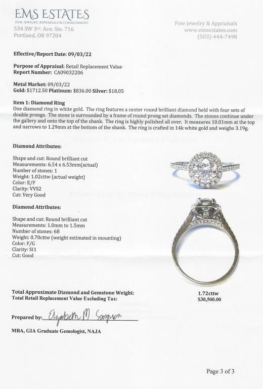 featuring a ‘IDEAL’ cut center Diamond weighing 1.02 carats with E-F colors and VVS clarity accented with 68 fine cut Diamonds weighing approx. 0.70 carats with F-G colors and VS/SI clarity set in a very labor intensive 14 karat white gold setting. Full Retail Appraisal - $30,000.00