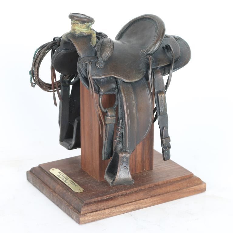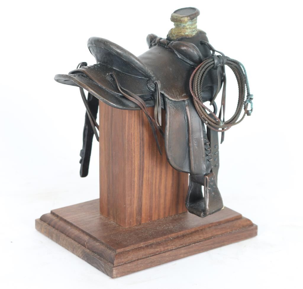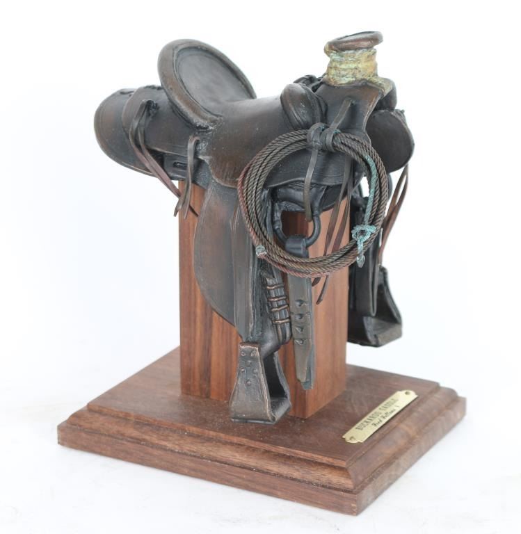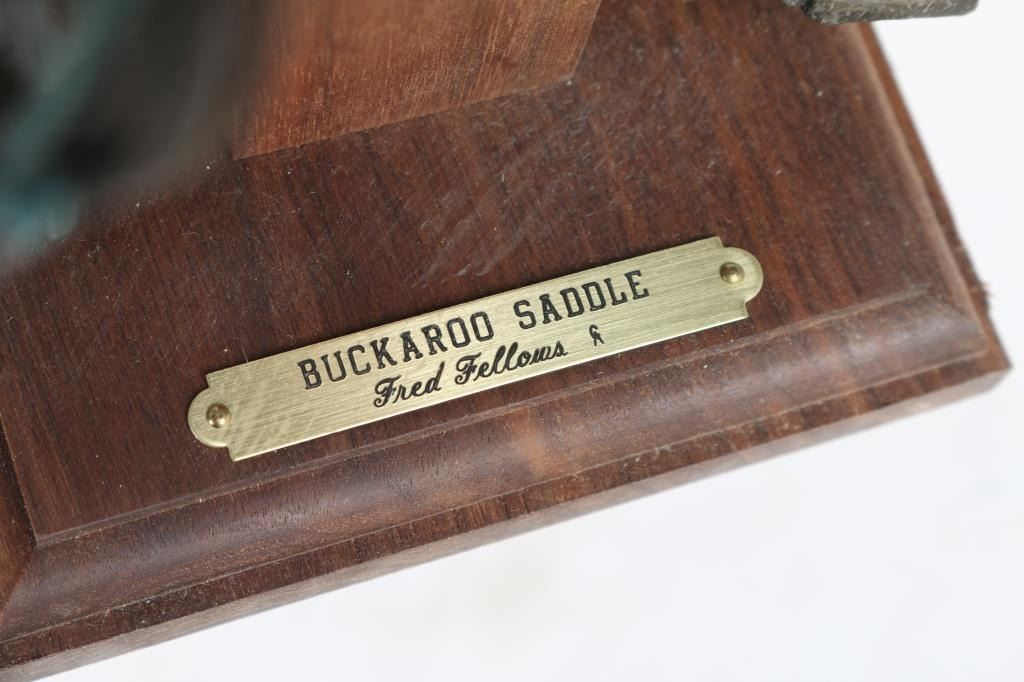 By well known artist "Fred Fellows"entitled "Buckaroo" numbered 94/100. Highly Collectable on wooden stand. in beautiful condition. Measures 5"x6"x8"