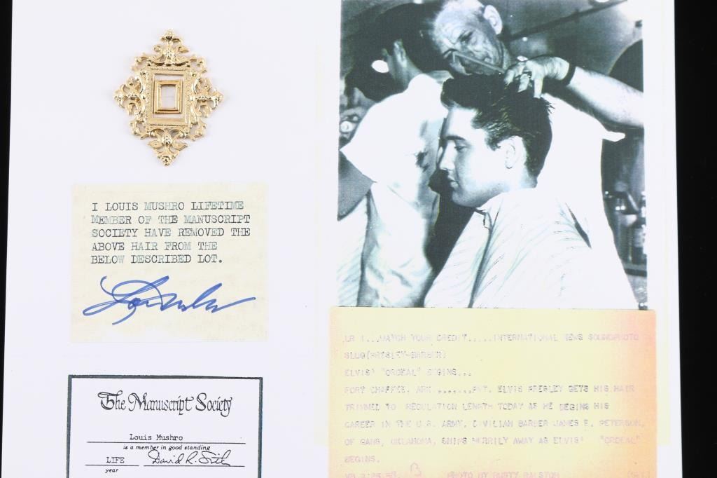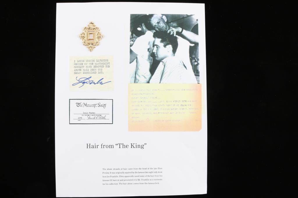 Single strand came from the Gi Haircut of Elvis , and presented to late night talk show Joe Franklin, as a memento for his collection. This is part of the "Mushro Collection"