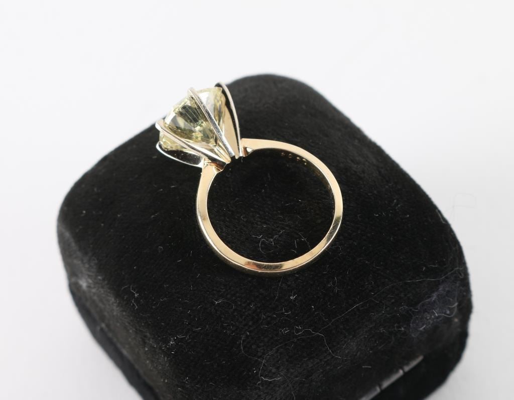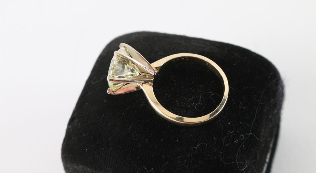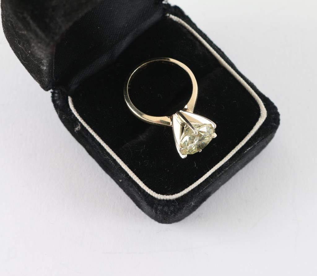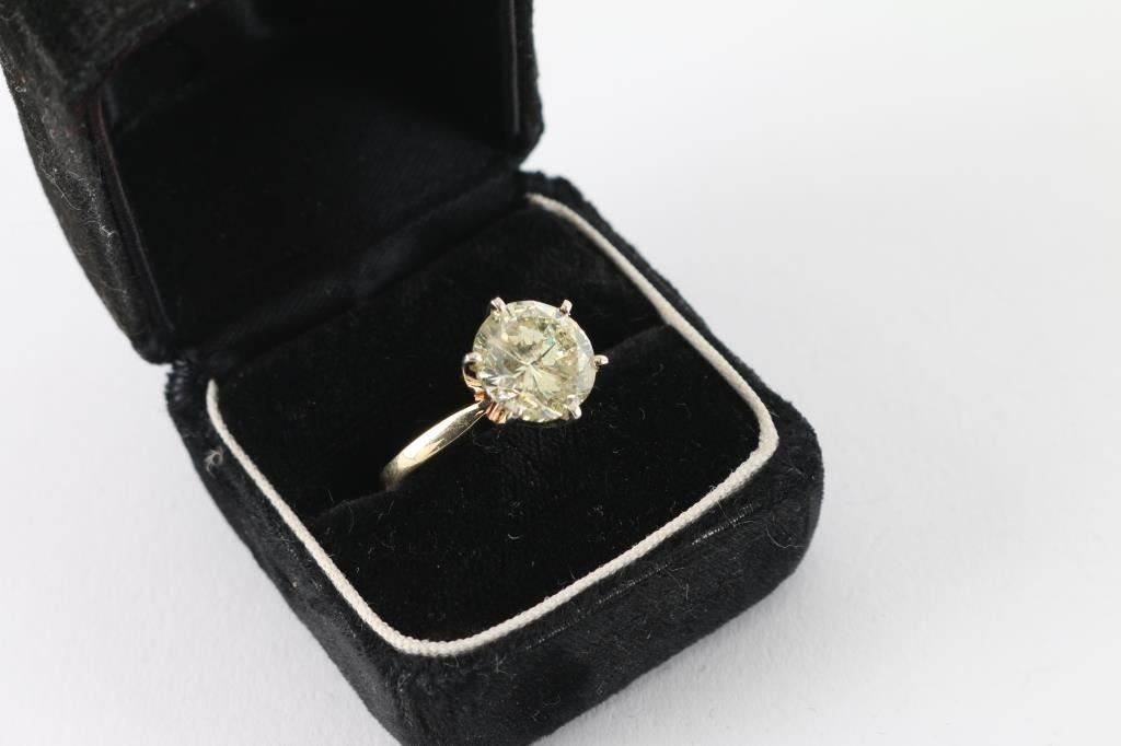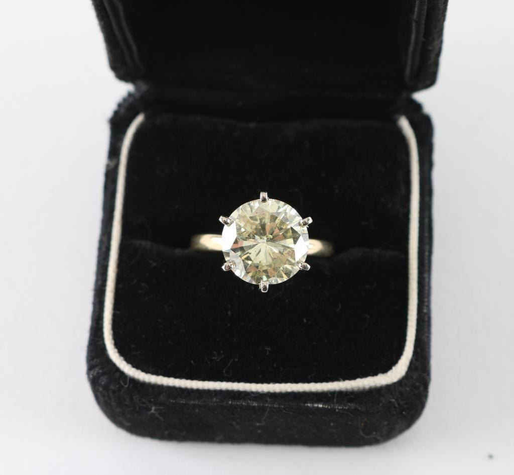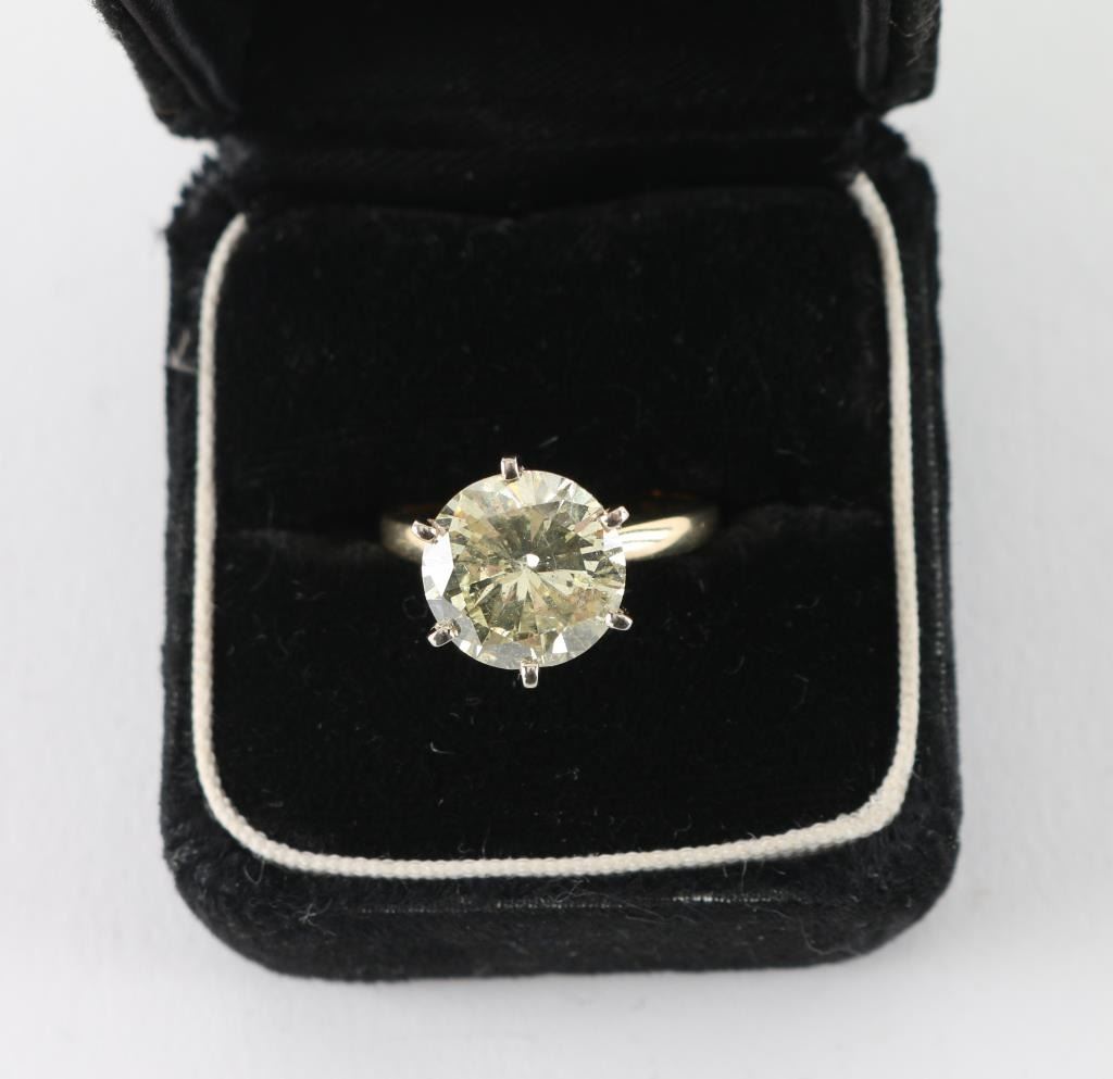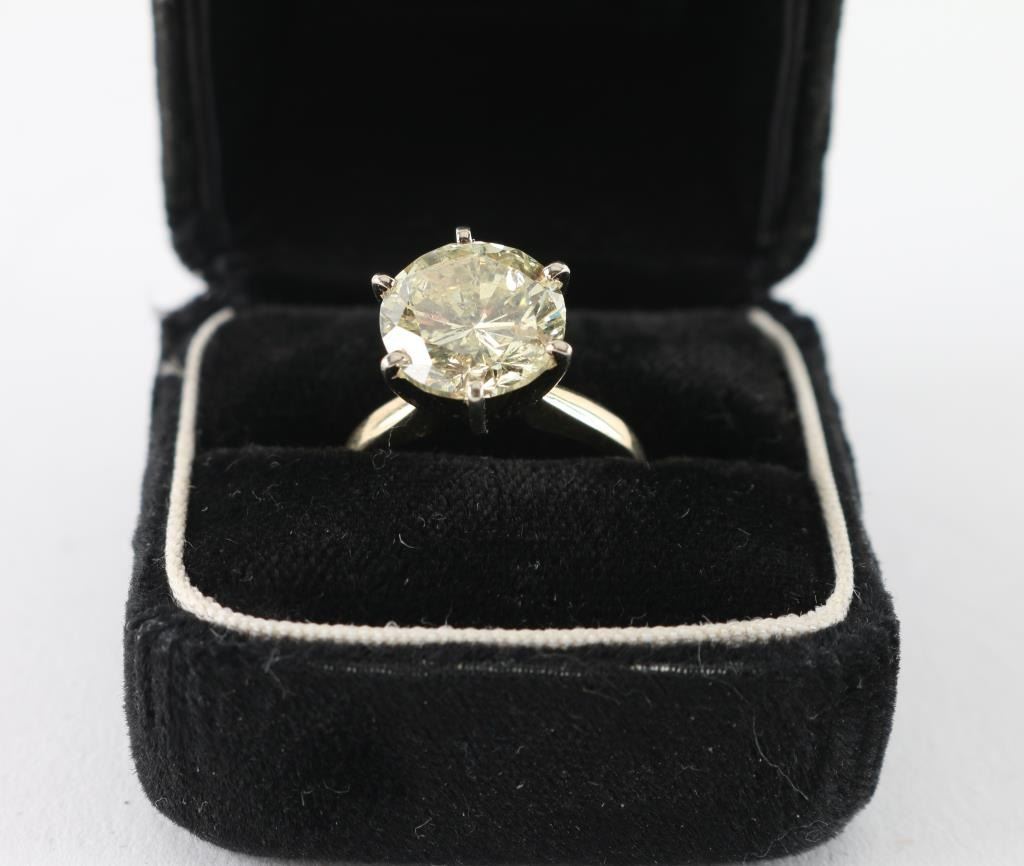 Nearly 5CT (4.91 estimated WT) measuring 11mm x 6.71 in depth. Graded I-2 O.P color, cape or yellow range, thick girdle , mounted in tiffany style, set in 14k white gold in a 6 prong mount. With a copy of the examination report. By Lamerson jewelers, certified and gemologist, GIA registered jeweler in the American gem society. Total replacement value $20,707.