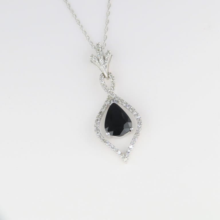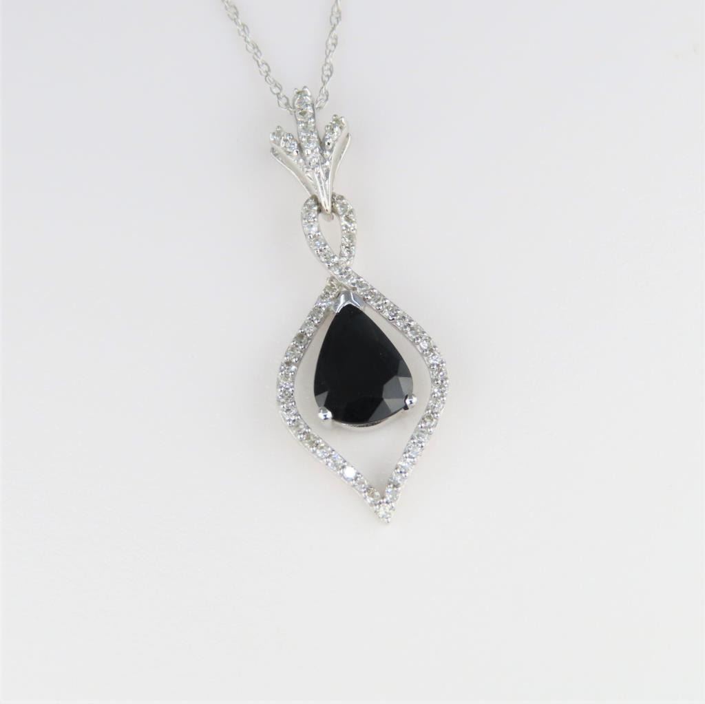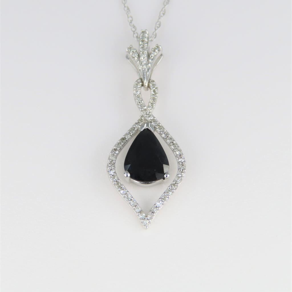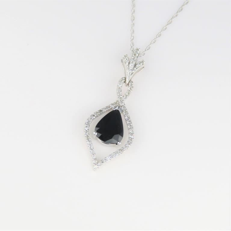 Pendant featuring a pear shape Sapphire weighing approx. 1.20 carats accented with over 50 round cut micro set Diamonds weighing approx. 0.30 carats with G-H colors and VS clarity set in graceful design set in 14 karat white gold.