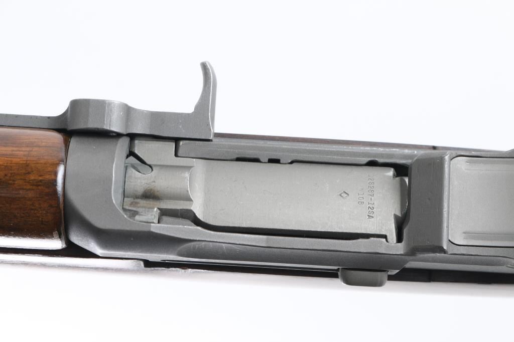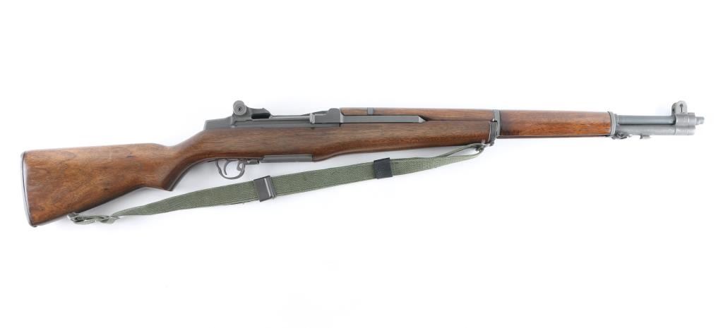 SN: 4716494 US military semiautomatic rifle manufactured circa 1953. Features parkerized re=finish, wood stock & hand guards, 24" barrel, adjustable sights with protected front blade & protected rear peep, fixed magazine for en-bloc clip, manual safety. Bore is very good condition, appears slightly dull, might improve with cleaning. Metal parts retain 95% medium gray color finish, with handling marks and edge losses. Some erosion to letters on back of receiver. Wood appears lightly sanded, finished in a semi-gloss polyurethane, i2 very good condition with a few deeper dents & dings, some loss of wood at toe. No importer marks observed. Barrel markings partially filled with thick parkerizing, appears to be an HRA barrel. Trigger housing marked "SA" Electric pencil rework marking on receiver under stock "A4 9-64". Includes green canvas sling Condition is NRA Excellent as reworked *** C&R Firearm ***