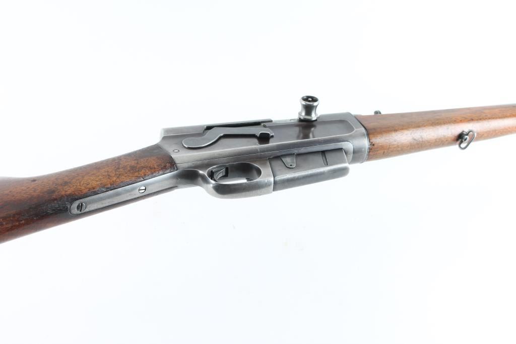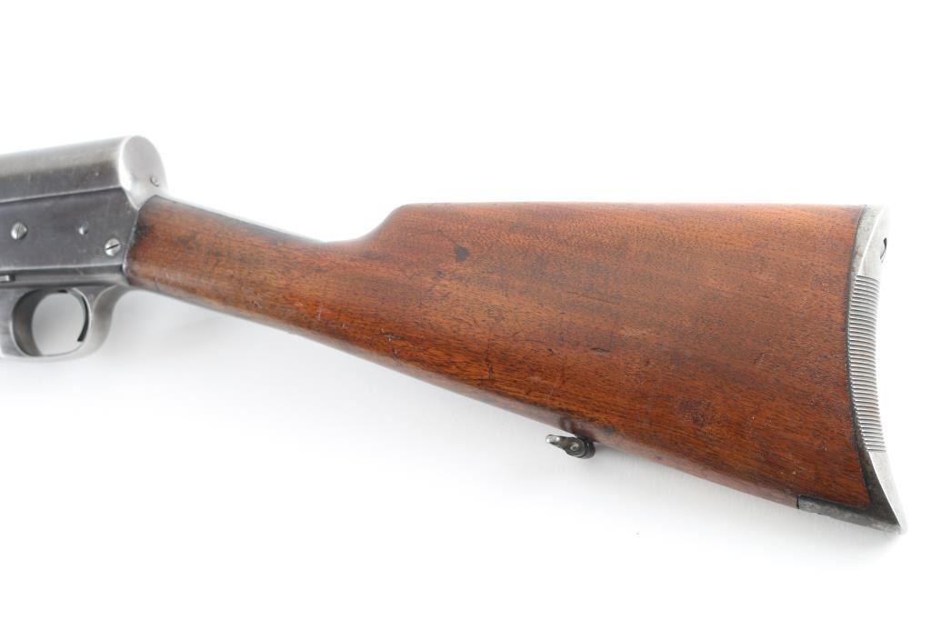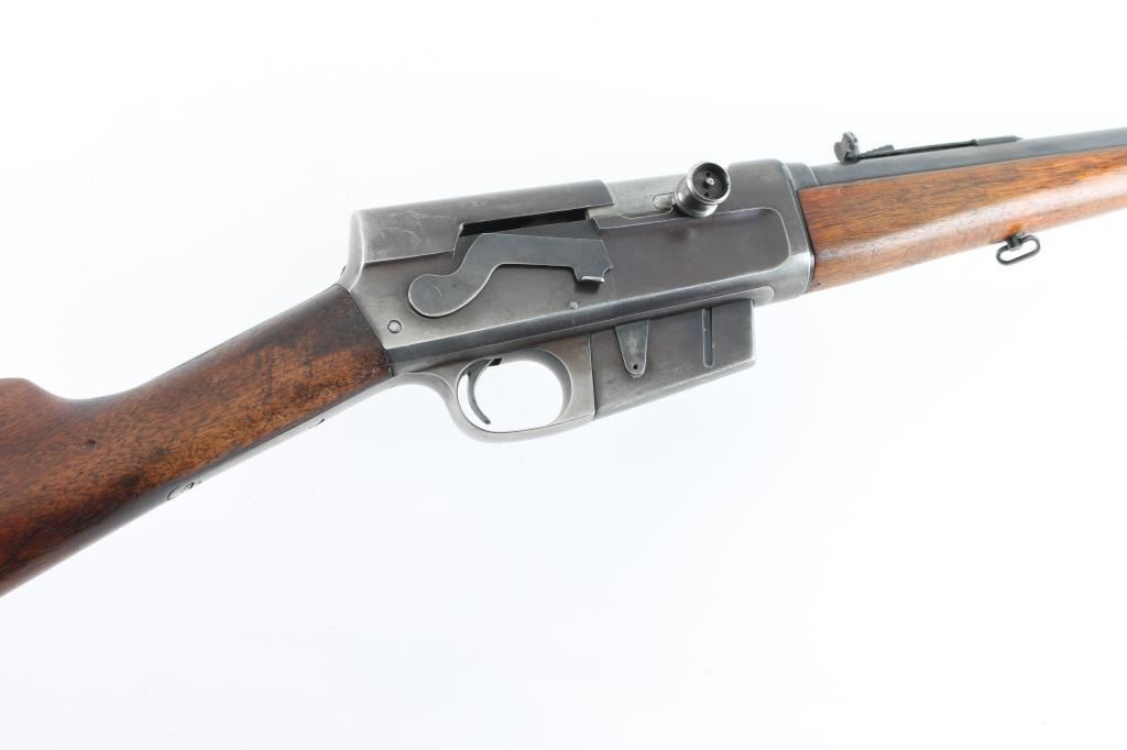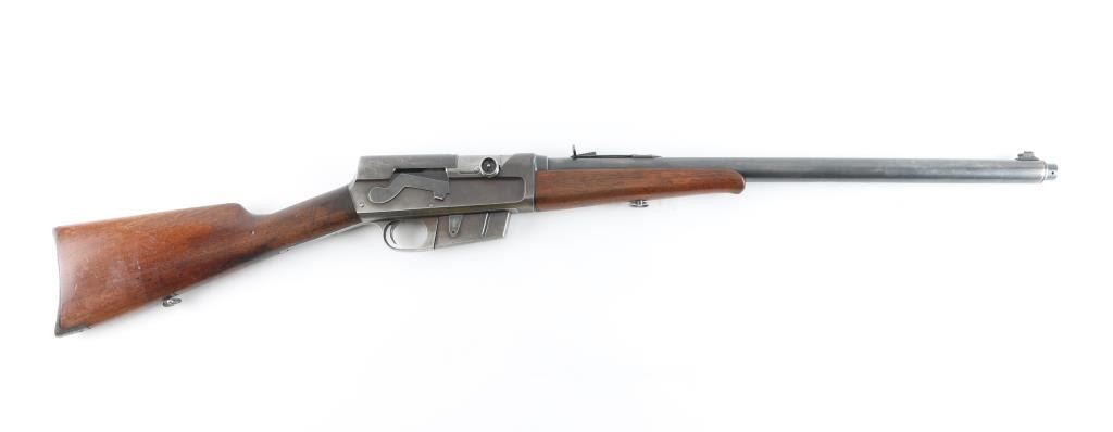 This is a semi-auto rifle chambered in .35 REM. It has a 22" jacketed barrel, raised dovetailed front sight painted red, adjustable rear sight, AK style safety, bolt release on left of receiver. Two piece plain wood stocks have sling swivels attached with a serrated metal butt plate. Metal finish has worn but is in good shape. Wood stocks are fine, no cracks a few dings. Bore looks great, bright. LOP is 14". Condition is NRA Good++ *C&R Firearm*