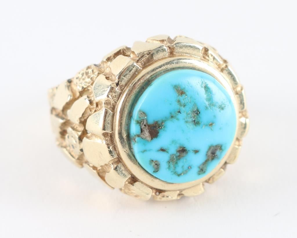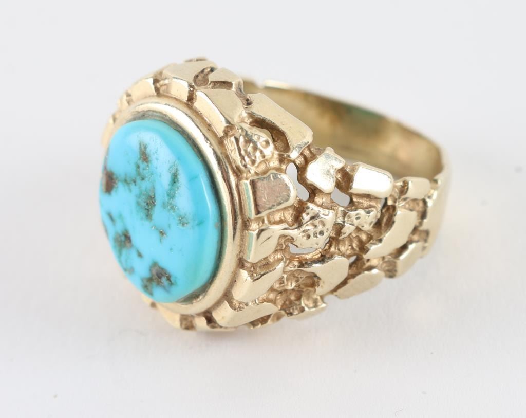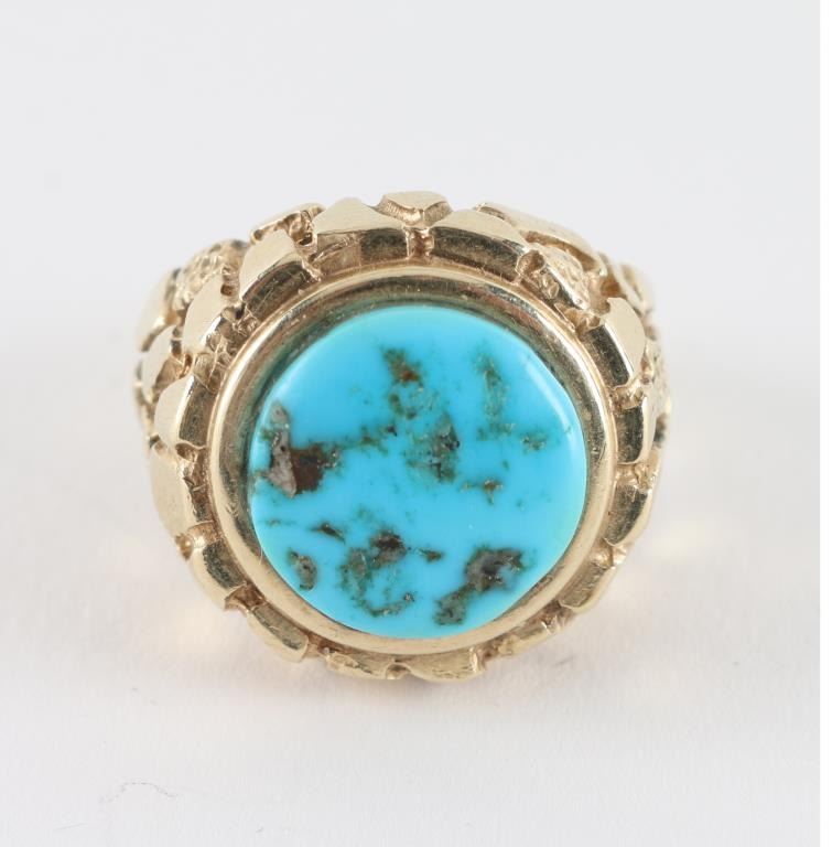 Nugget style 14kt gold setting with single turquoise stone, size 10.5, weighs13.8 grams.