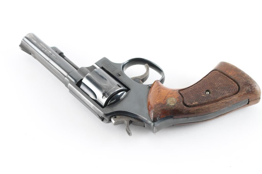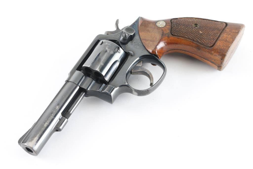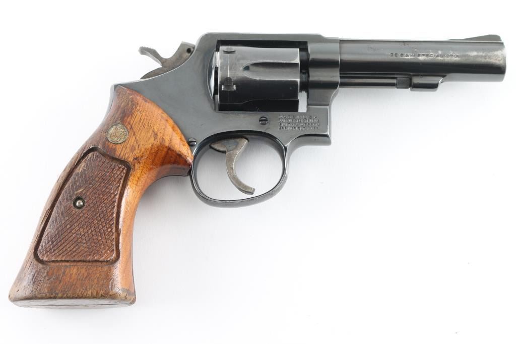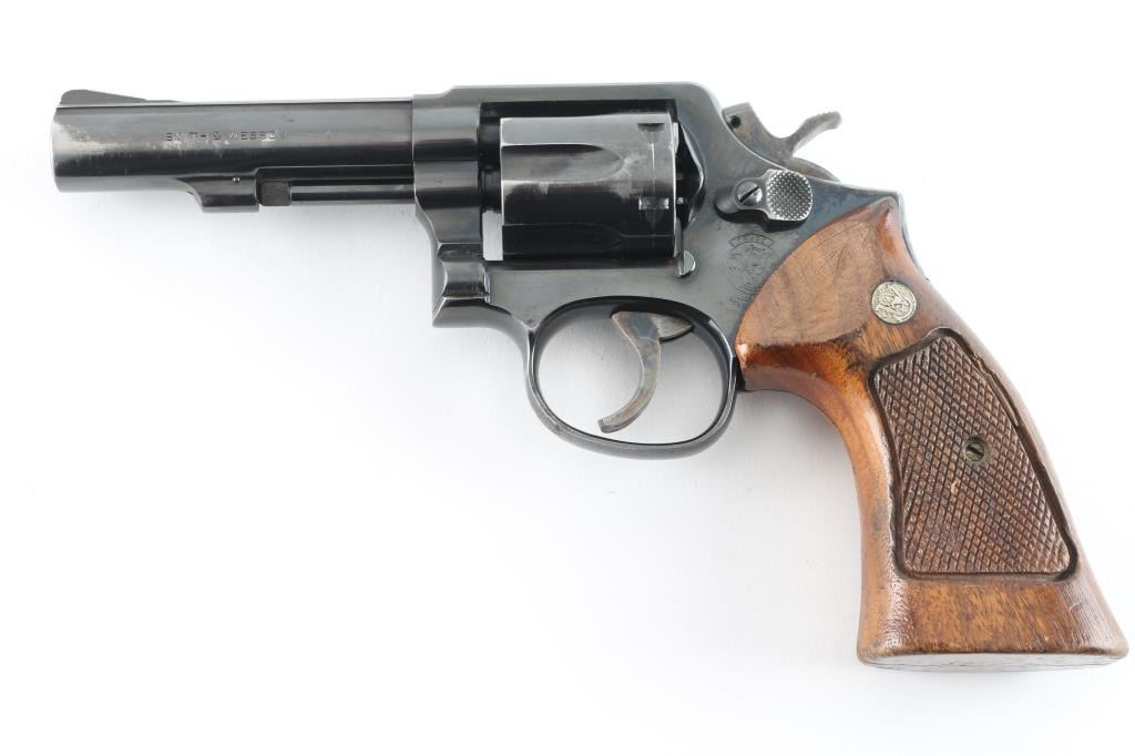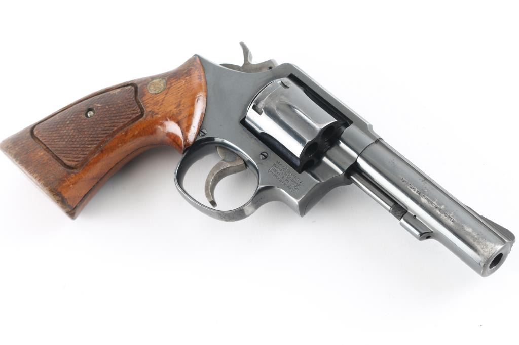 Medium frame double action revolver. Features a blued finish, 4" barrel, forged blade front sight, square notched rear sight, four screw square butt K service frame and two-piece checkered wood Magna grips with silver S&W medallions. Bore is very good condition. Revolver retains approximately 70% of it's original finish showing bare metal near muzzle and other sharp edges, several areas of handling loss on cylinder, drag line on the cylinder. Action is smooth with tight lock up. Grips are ok with finish loss, chips, and someone has sanded out a thumb rest on the top of the left panel. Condition is NRA Good Modern Firearm