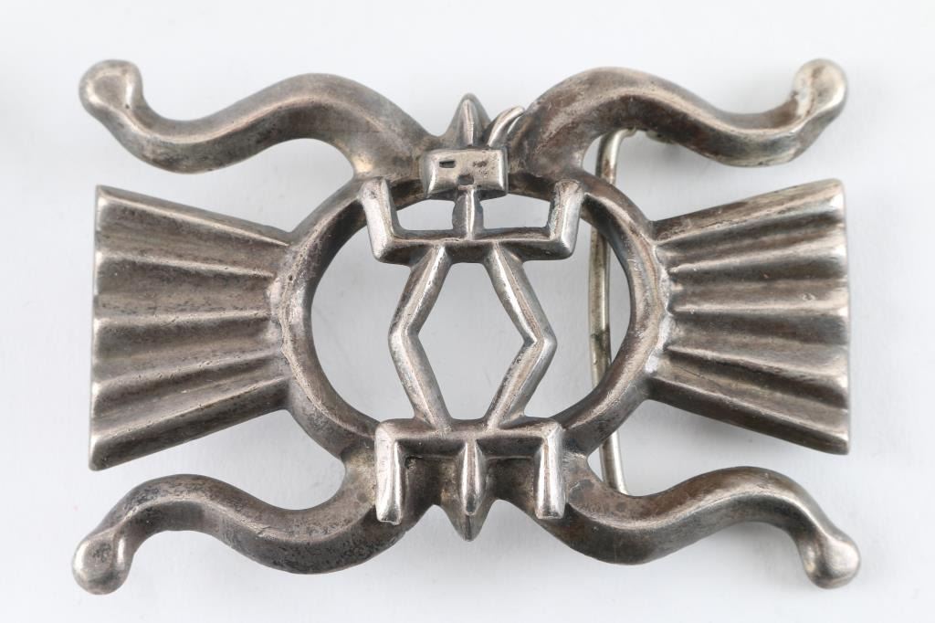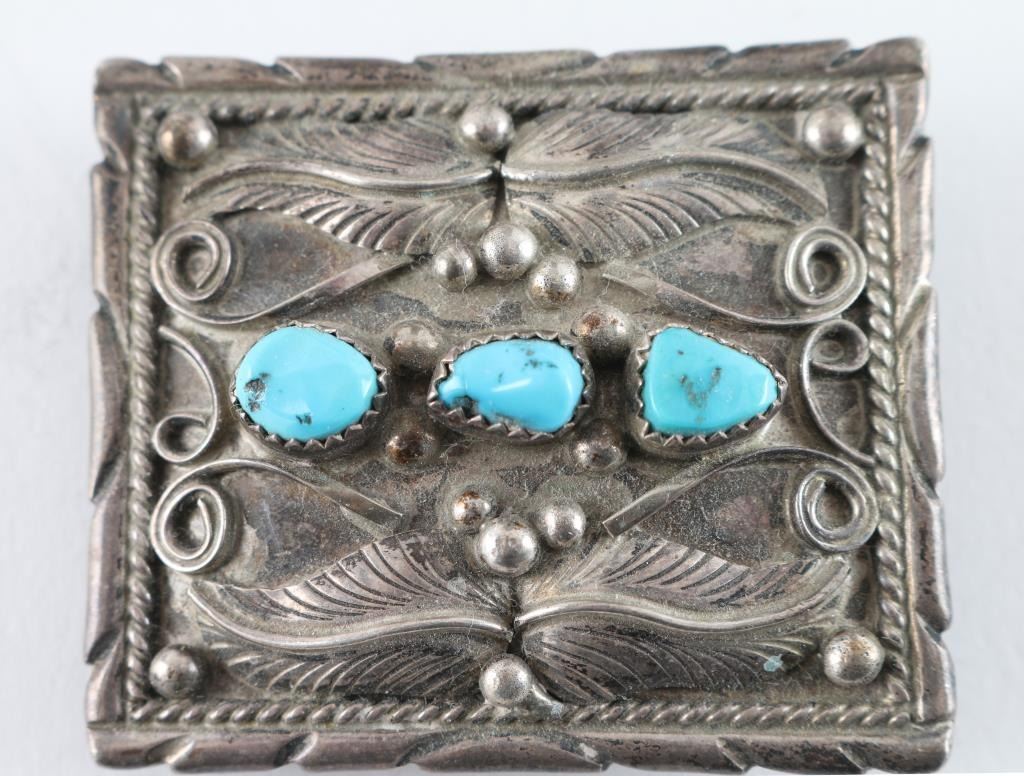 Sandcast Buckle with Kachina design, Turquoise Watchband Cuff, and small Navajo Square turquoise and sterling buckle. Also a B&W photo of Chief Duck of the Blackfoot Tribe from Western Canada.