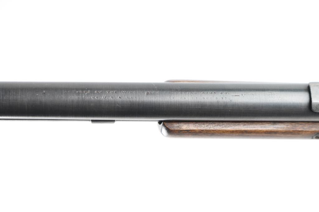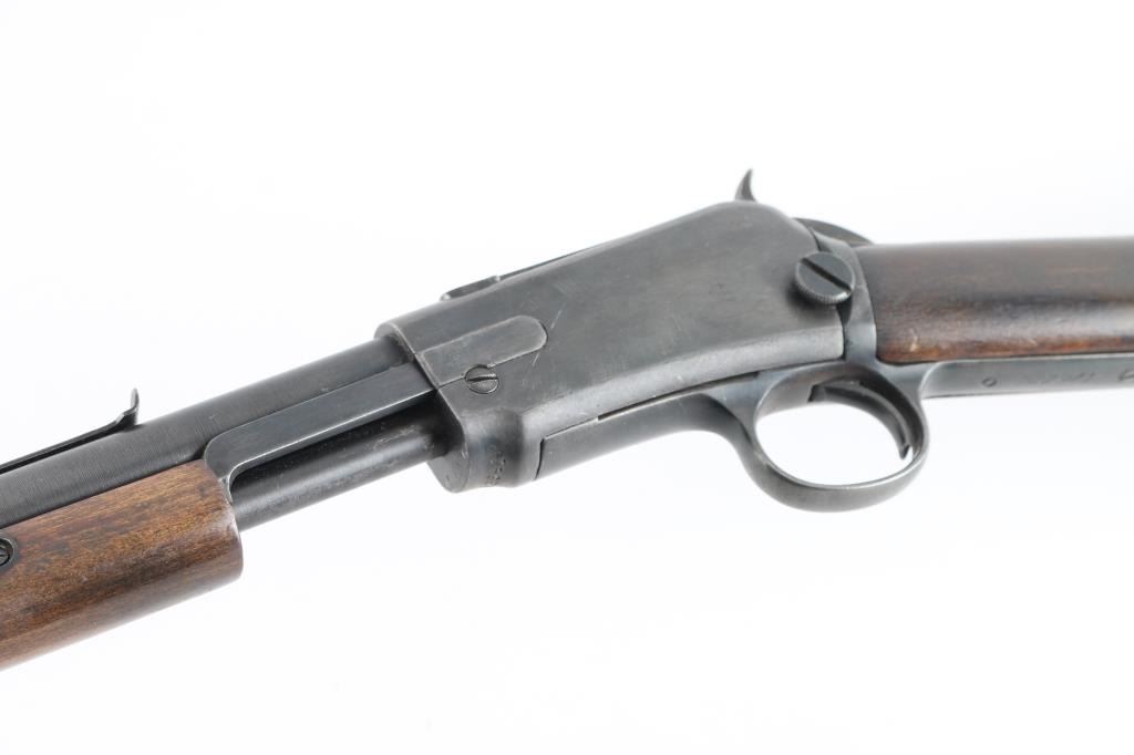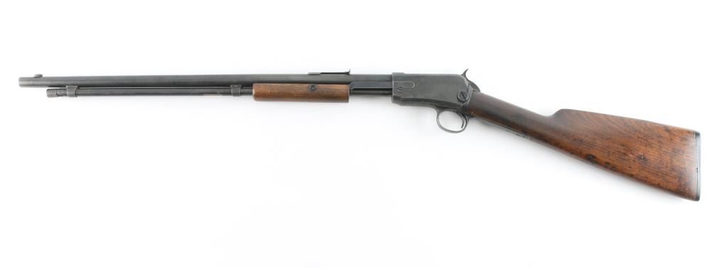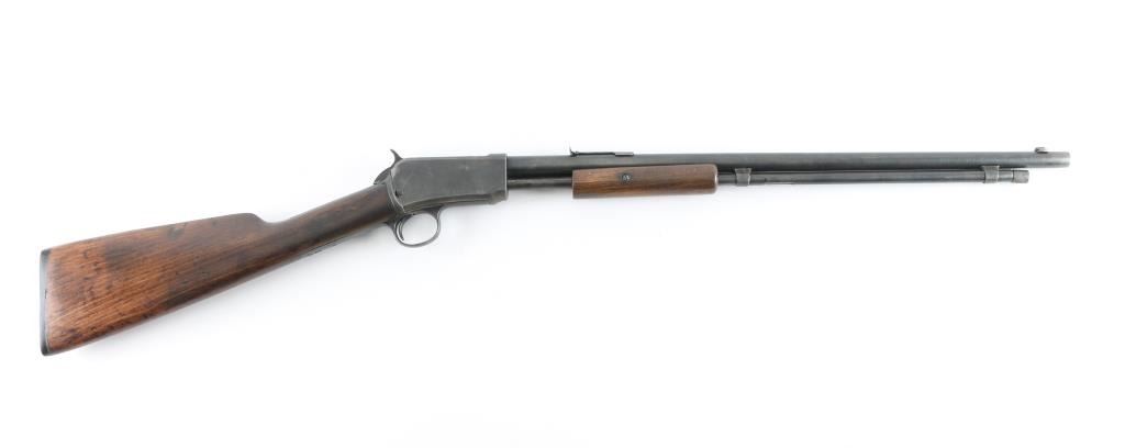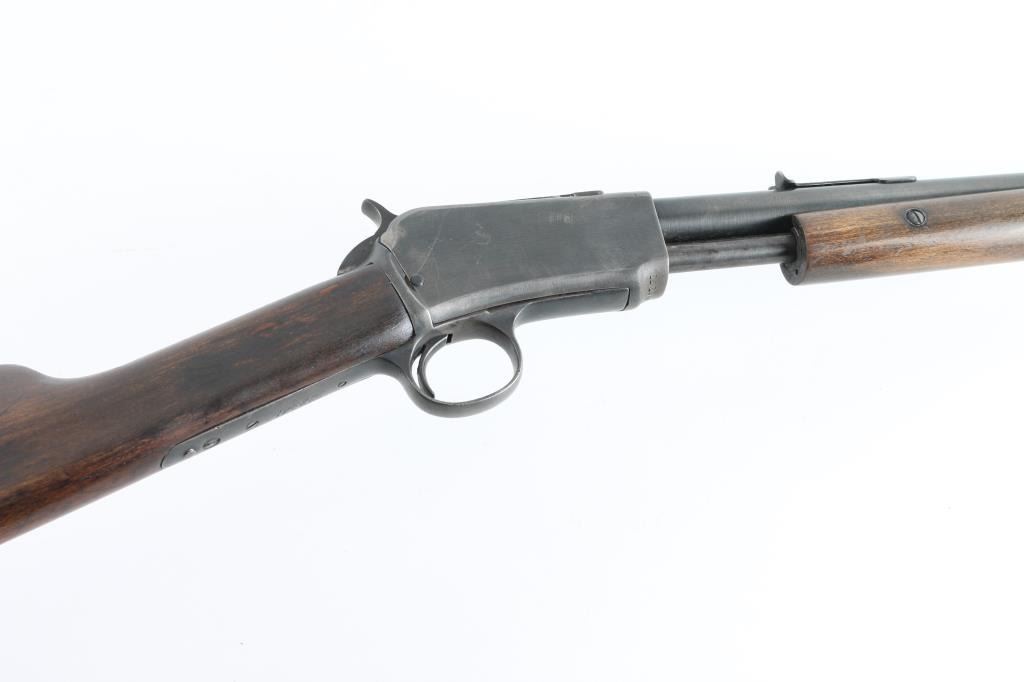 Pump action rimfire rifle manufactured circa 1904. Features blued finish, smooth wood pump handle and shoulder stock with straight grip area, factory hard rubber buttplate, 20" round barrel, blade front sight (appears to have had a bead top, broken off, edge smoothed), adjustable rear sight, magazine tube under barrel, external hammer, take down screw in receiver. Bore is very good condition. Has been reblued, with remains of old pitting under new finish, 80% coverage with edge losses, dark gray color. Light rust on bottom of receiver. Barrel markings eroded, partially readable. Numbers match on receiver and trigger group. Wood is good condition, lightly sanded, erosion at wrist/tangs, some deeper dents remain and show dark color, oil staining at wrist. Condition is NRA Good *** C&R Firearm ***