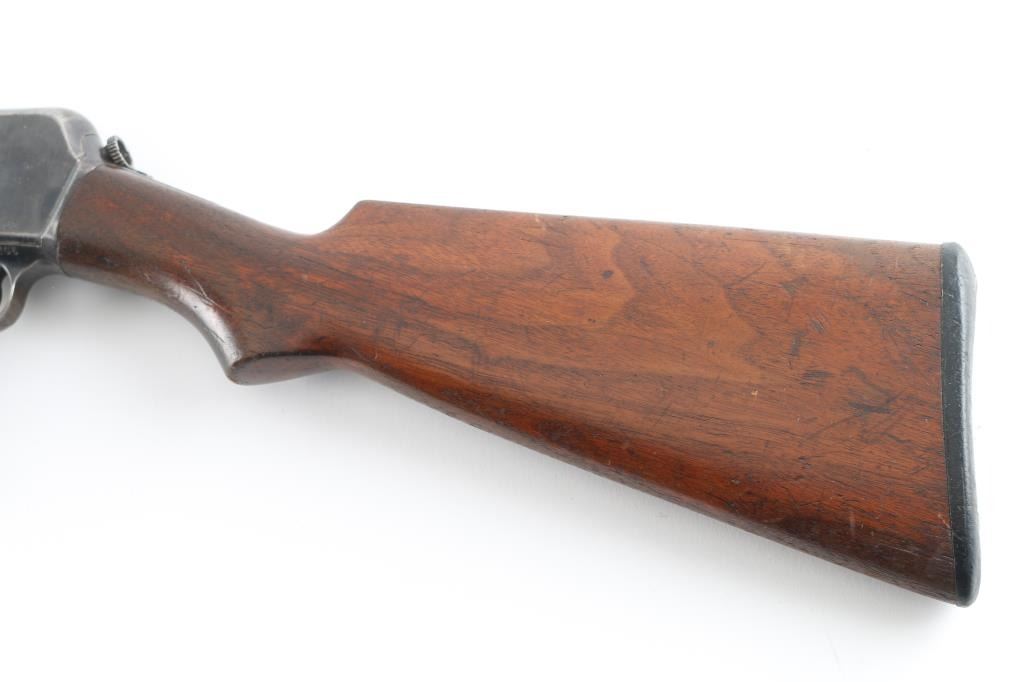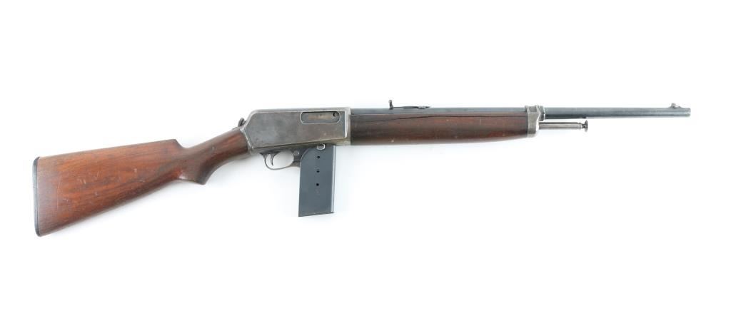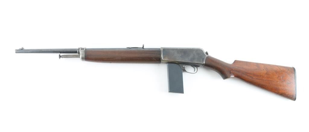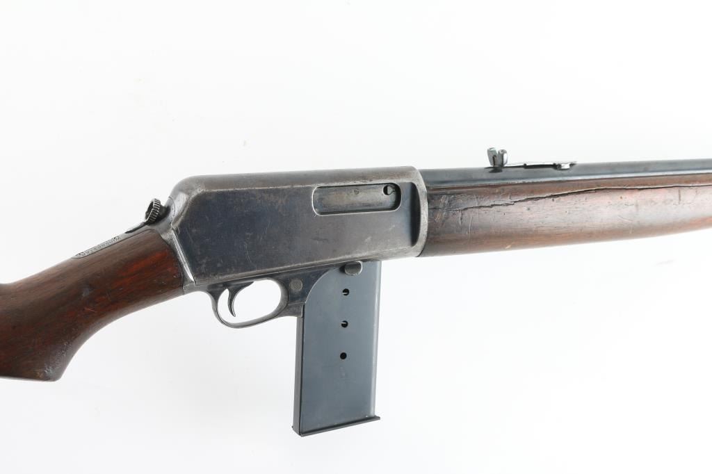 Winchester Self-Loading American made, magazine fed semi-automatic rifle chambered in .351 SL, circa1909. It has a 20" blued barrel with dovetailed front sight, "King" fixed rear sight, smooth trigger, safety in the front of the trigger guard, mag release on the right side of the receiver and takedown screw on back of receiver. It has two piece wood stocks with a beat up Winchester butt plate. The forearm stock is cracked the entire length on the right and 3/4 of the way on the left. Shoulder stock is fine but used, no cracks. Bore looks dirty. LOP is 14". Comes with one 10 round after market magazine. Condition is NRA Good *C&R Firearm*
