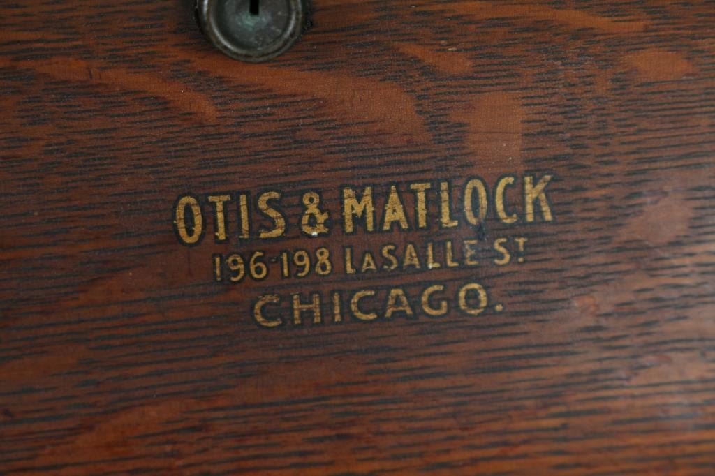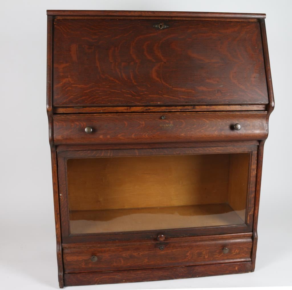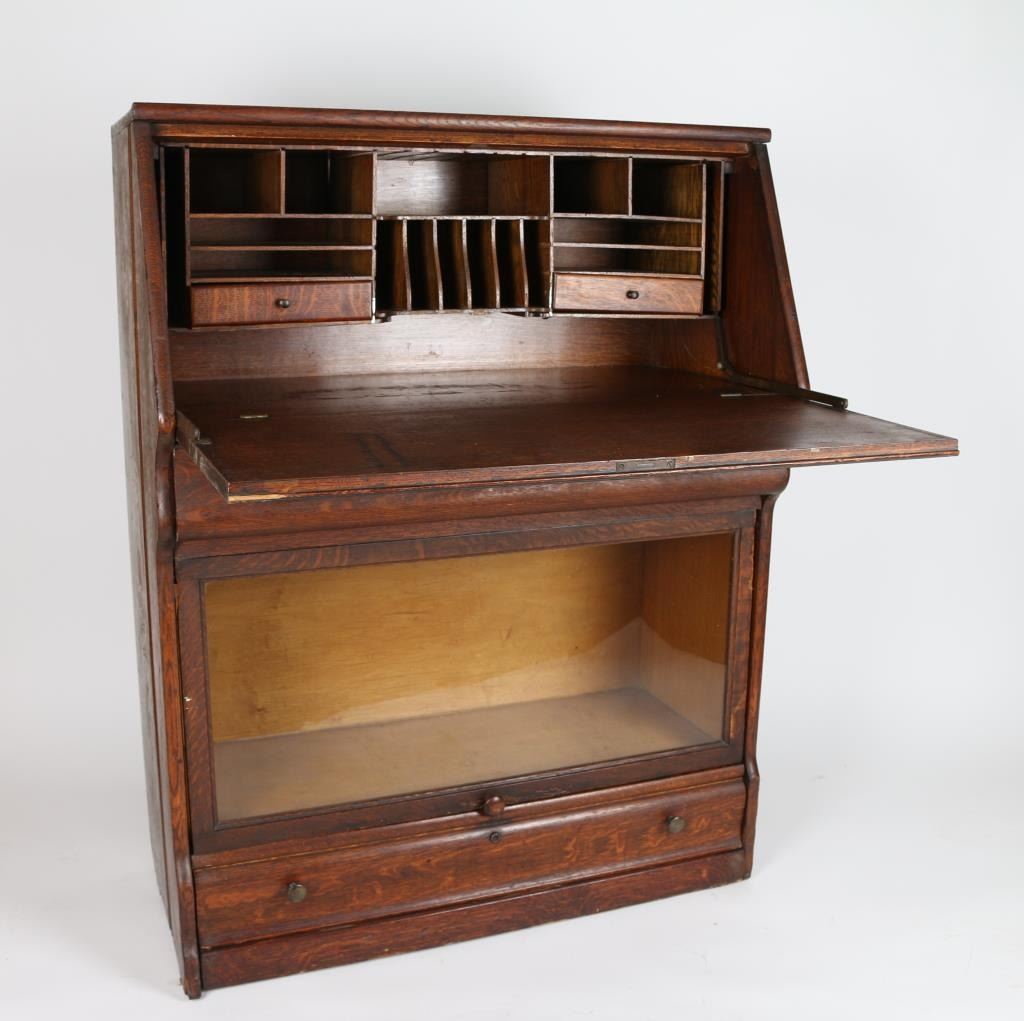 With Lawyer bookcase and drawers, measuring 44"x"34"x12". Interior of desk has organizers, and drawers. In overall good condition for age.