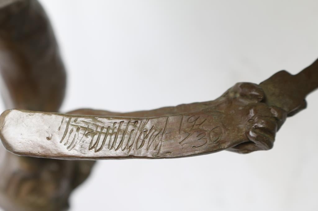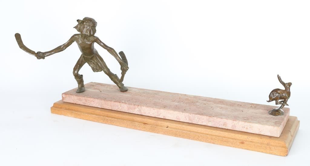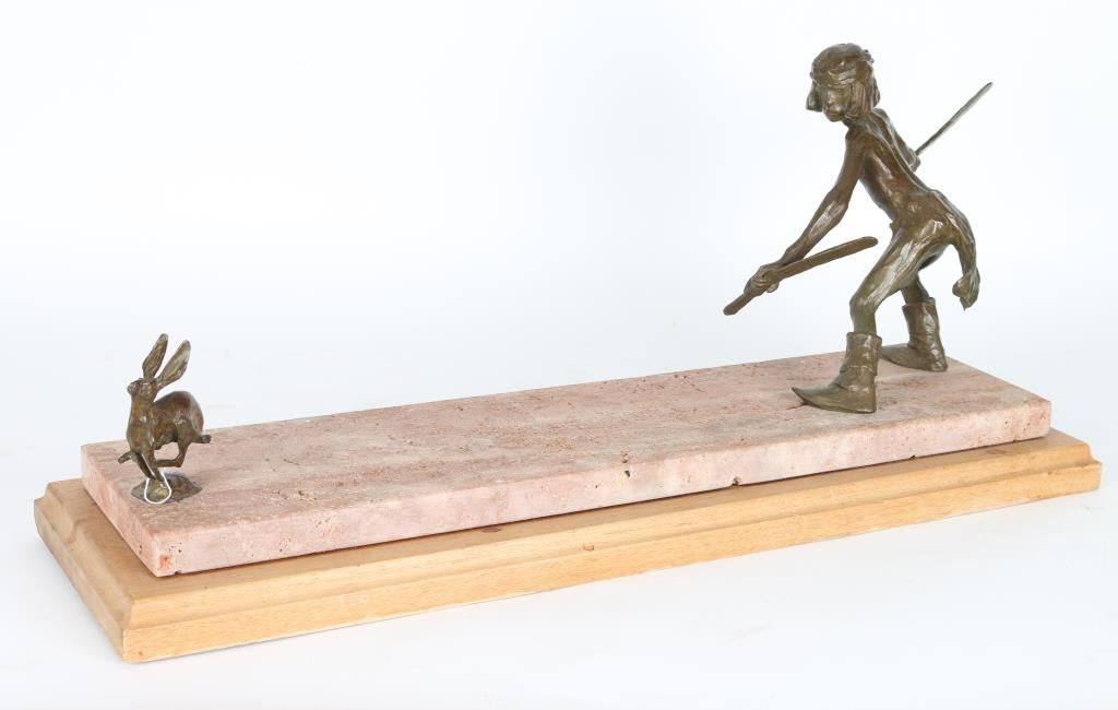 Unsigned, depicting of indian boy and rabbit, on red stone base. Measuring 31"x12"x11". Numbered 19/30 signed on Indians blade but not readable.
