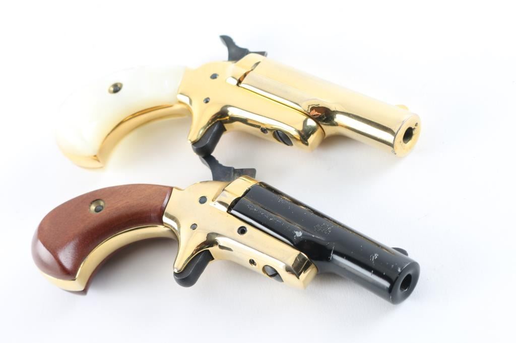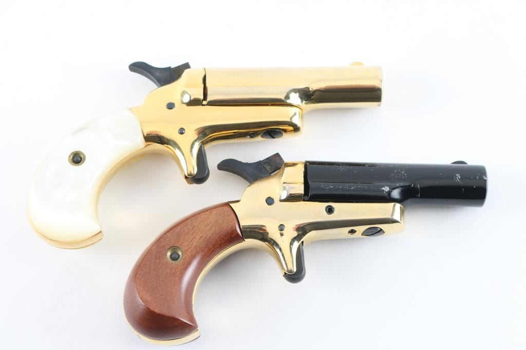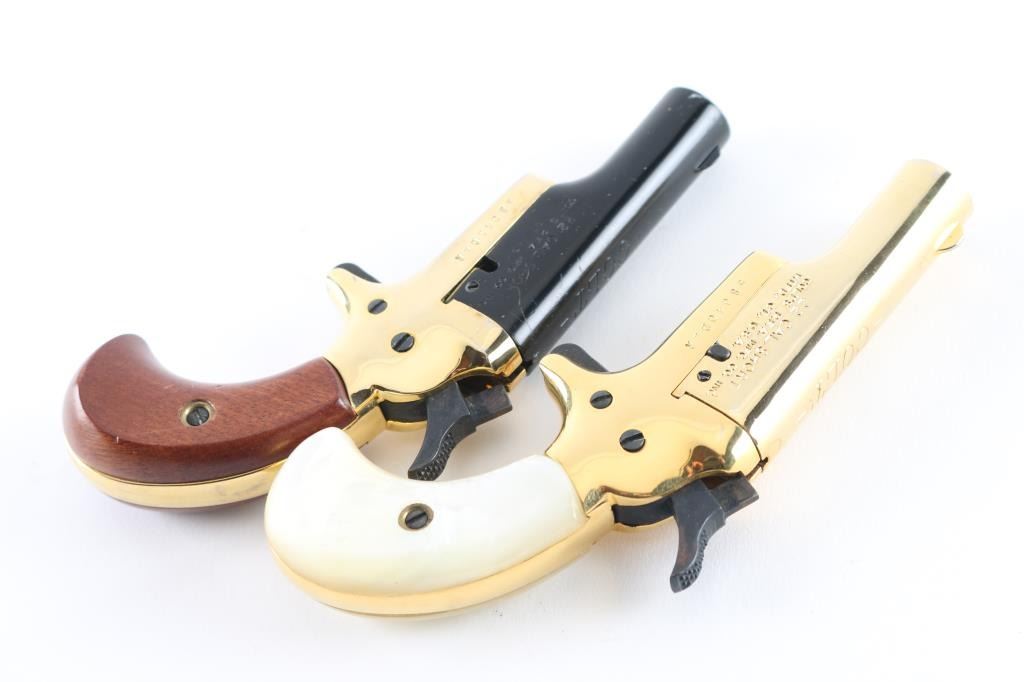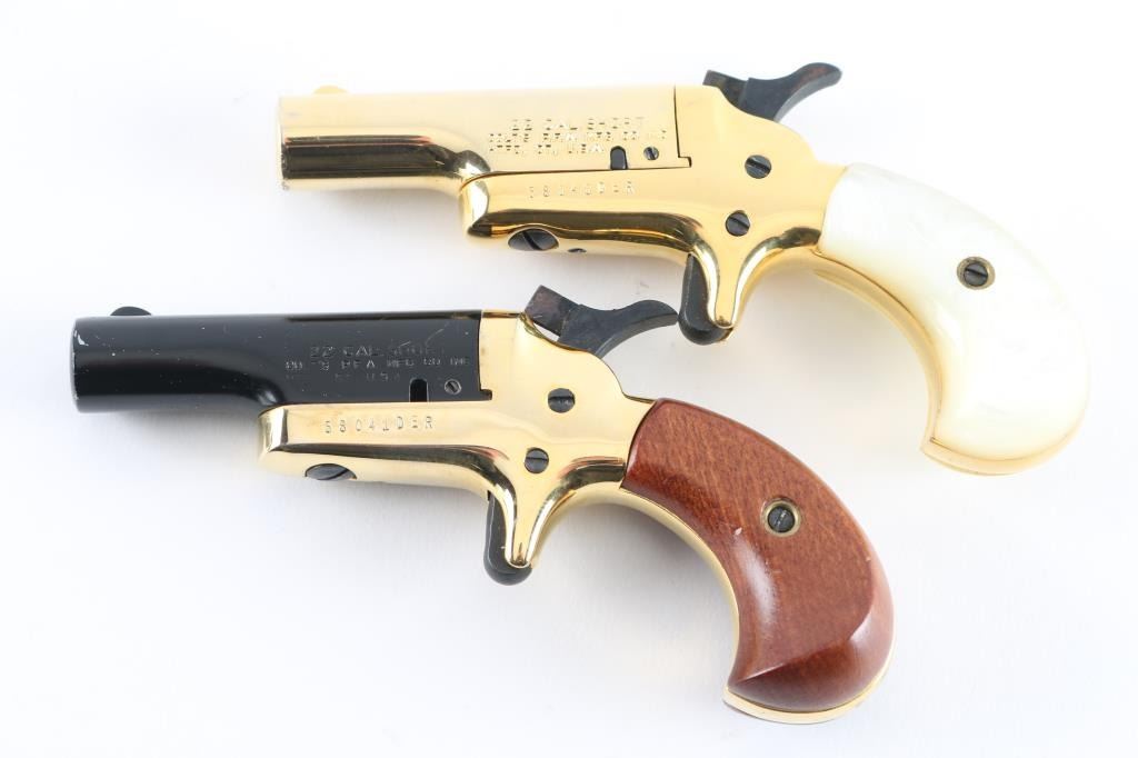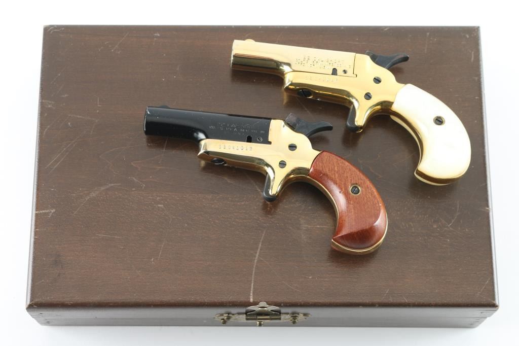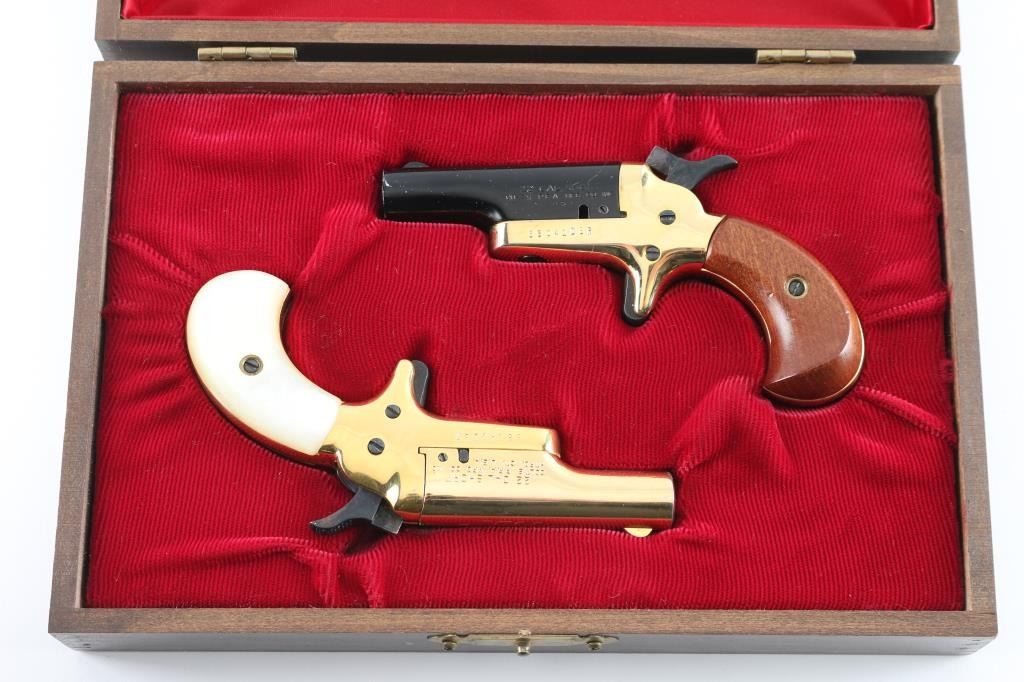 58040DER/58041DER ‘Lord & Lady Derringers’ Cased & consecutively numbered pair of small frame single shot spur trigger pistols chambered in .22 short, manufactured circa 1970-1973. Configuration: 2.5" swing out barrels(one black finished & the other gold plated), fixed blade front sights, smooth spur triggers, knurled hammer spurs, gold plated frames and two-piece bird's head grip(one set smooth walnut & the other faux mother-of-pearl). Includes a wood presentation case with fitted red velvet lined interior. Pistols exhibits approximately 98% finish overall . Actions are sound, the bore on the 'lord" derringer is very good, the bore on the 'Lady' derringer is rough/pitted. and the grips are fine. Condition is NRA Good in case. C&R Firearms