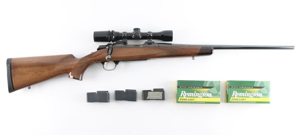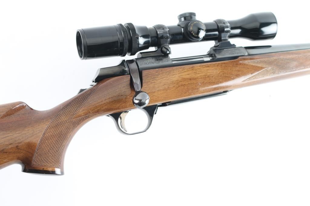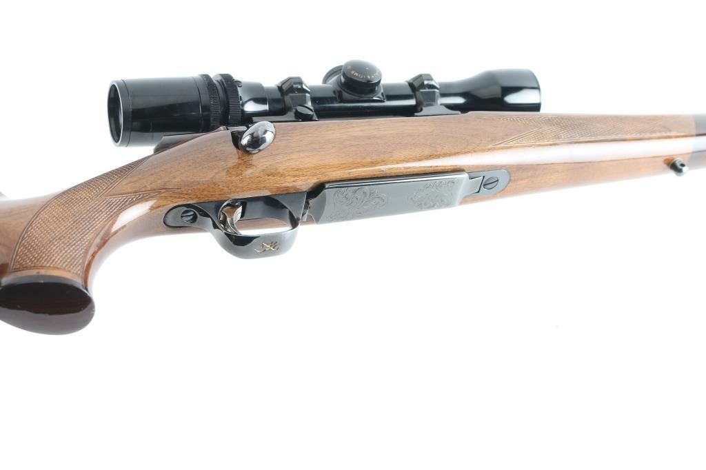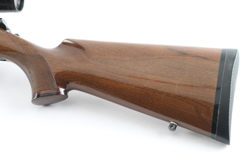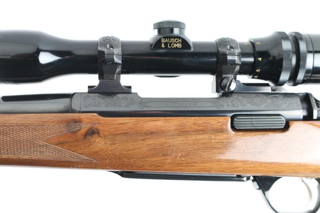 'Medallion' grade bolt action rifle manufactured circa 1988. Features blued finish, urethane finished walnut stock (rosewood tip & grip cap, curved wrist, checkering at wrist & forend, solid rubber factory butt pad, sling studs), hinged floorplate (holds a magazine that can be detached from the open floorplate), manual safety, Leupold style rings & bases. Receiver, floorplate and scope rings are engraved with floral scrolls. Mounts a Bausch & Lomb "Scopechief" 2-7x scope with clear view, duplex reticle. Bore is very good condition. Retains 95% finish with handling marks and edge losses. Stock is very good with creases and dents. Includes three spare magazines, and two boxes (one is partial, 28 rounds total, plus some fired cases) of Remington ammunition. Condition is near NRA Excellent *** Modern Firearm ***