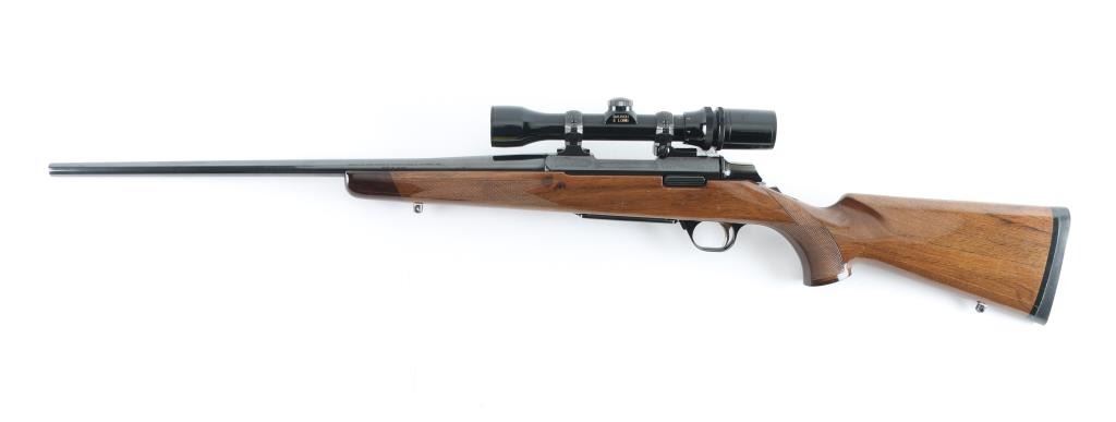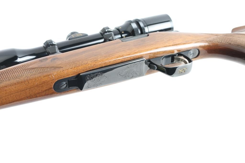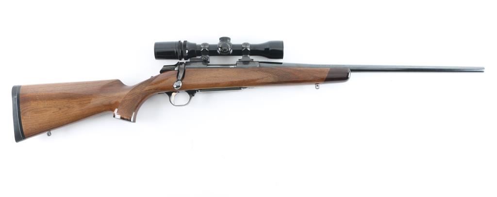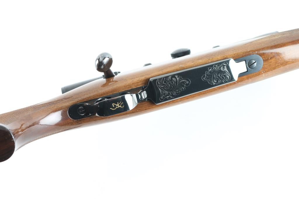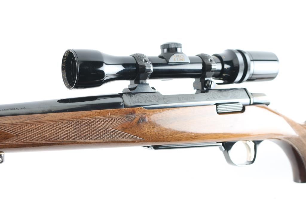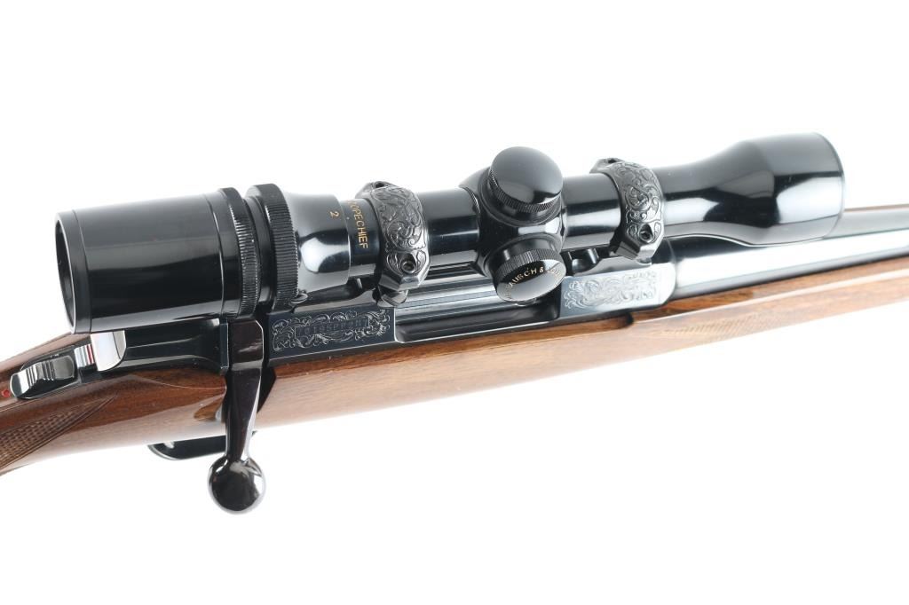 'Medallion' grade bolt action rifle manufactured circa 1988. Features blued finish, urethane finished walnut stock (rosewood tip & grip cap, curved wrist, checkering at wrist & forend, solid rubber factory butt pad, sling studs), hinged floorplate (holds a magazine that can be detached from the open floorplate), manual safety, Leupold style rings & bases. Receiver, floorplate and scope rings are engraved with floral scrolls. Mounts a Bausch & Lomb "Scopechief" 2-7x scope with clear view, duplex reticle. Bore is very good condition. Retains 95% finish with handling marks and edge losses. Stock is very good with creases and dents. Includes three spare magazines, and two boxes (one is partial, 28 rounds total, plus some fired cases) of Remington ammunition. Condition is near NRA Excellent *** Modern Firearm ***
