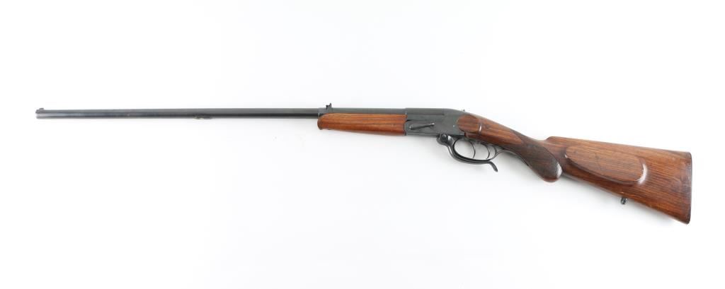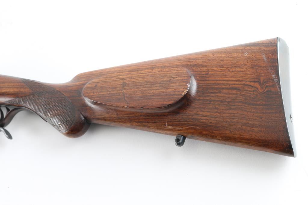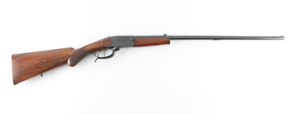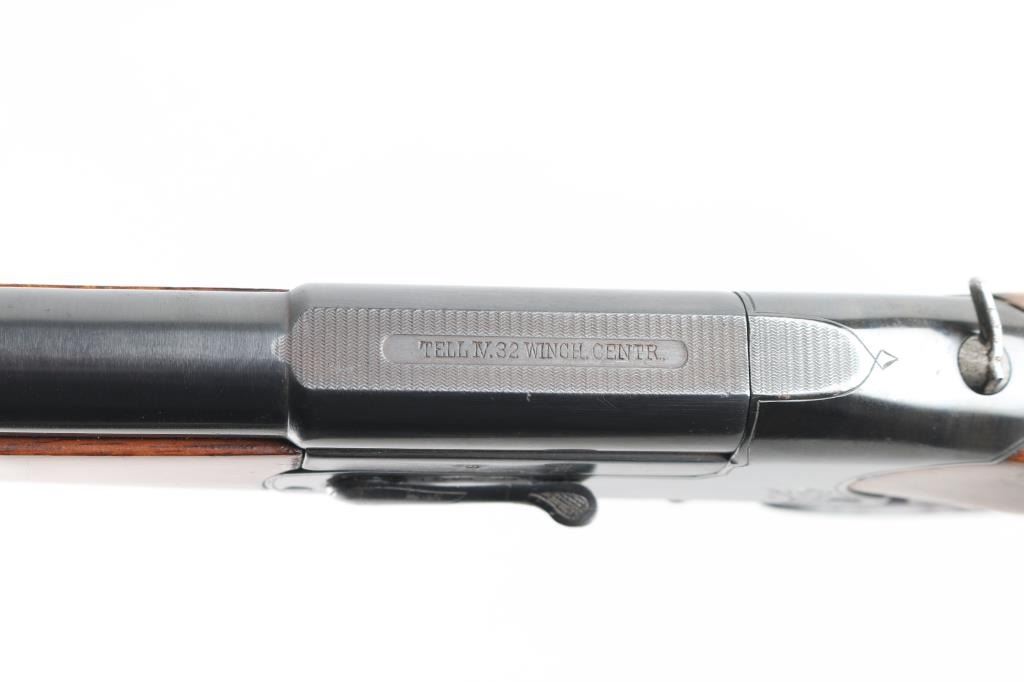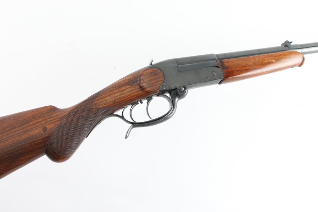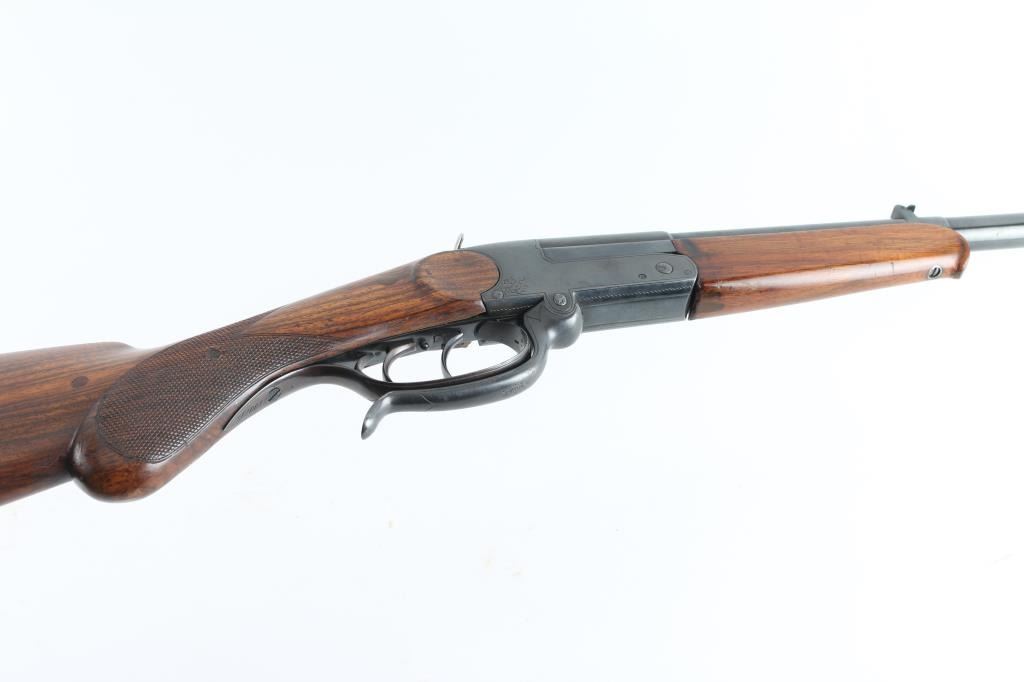 SN: 100704 Single shot, under lever rifle chambered for .32 Winchester Centerfire cartridges. It has a 25.75" blued barrel, tiny blade front sight, flip up rear sight and double set triggers. Two piece wood stocks with checkering at the wrist, a cheek rest for right hand shooters and a black metal butt plate. Metal finish looks good but does show some signs of handling with a "drag line" on the left side of the receiver under the takedown lever. Swivel stud hole on bottom of barrel has been filled. Shoulder stock has multiple cracks, some repair but looks okay. Bore looks good, needs cleaned. LOP is 14". Condition is NRA Good+ *Modern Firearm*
