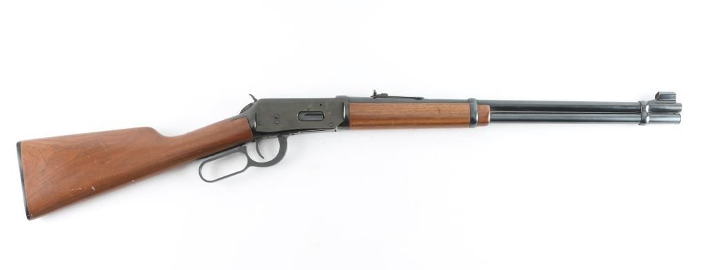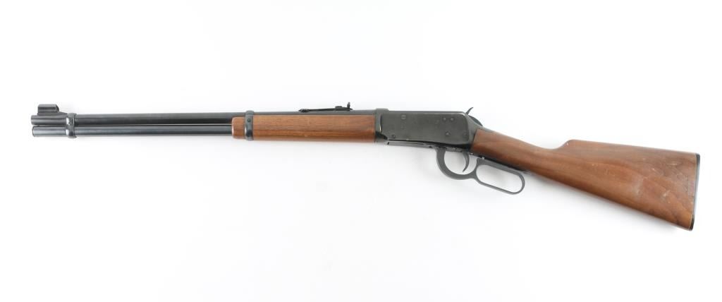 Lever action rifle chambered for 30-30 Win ammunition circa 1971. It has a 20" blued barrel and receiver with a full length magazine tube, smooth trigger, serrated hammer spur, hooded front sight, adjustable rear sight, two piece plain wood stocks with two barrel bands and a black Winchester butt plate. Metal finish looks pretty good with some scuffs and surface scratches on the receiver and a loss of blue on the top of the barrel between the rear sight and the barrel band. Wood looks good but handled. Bore looks very good. Condition is NRA Good *Modern Firearm*