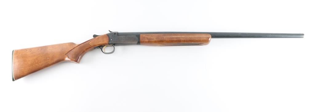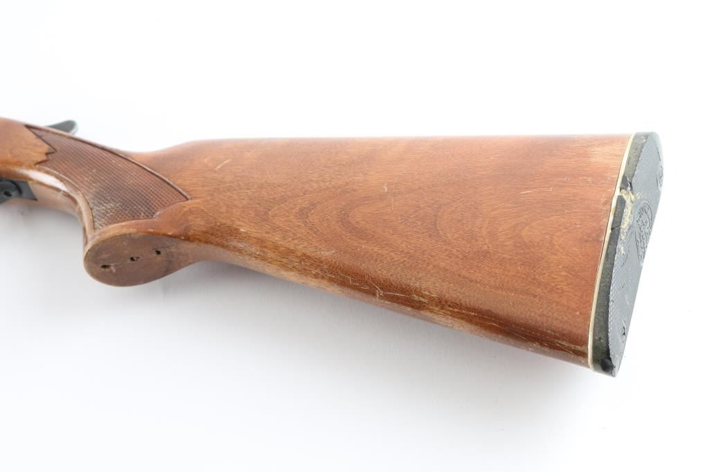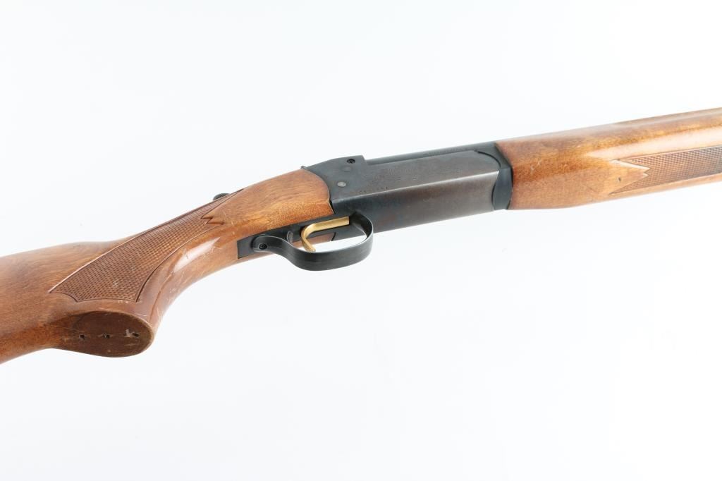 Canadian made single barrel break-open shotgun chambered for 2 3/4" or 3" 20 gauge shells, produced circa 1973-1980. Features a blued finish, 28" CYL choked barrel, automatic ejector, brass bead front sight, smooth gold toned trigger, serrated hammer spur, knurled top lever, steel receiver with roll stamped embellishment, press checkered wood beavertail forend, and pistol grip shoulder stock with factory buttplate, has a chip that has been glued back in place. Shotgun exhibits approximately 85% of it's original finish showing handling wear on the receiver, edge wear and minor scratches. Action is sound, bore is very good, needs cleaning, and the wood stocks are good with scattered dings & scraped, some areas of finish loss. Appears there was a grip cap in place, which is now gone. NRA Condition-Good. Modern Firearm.