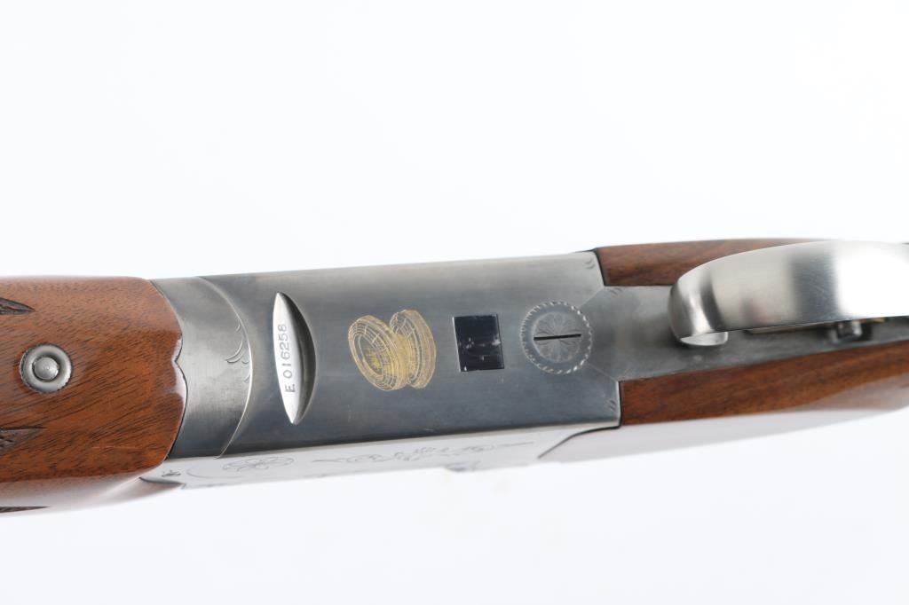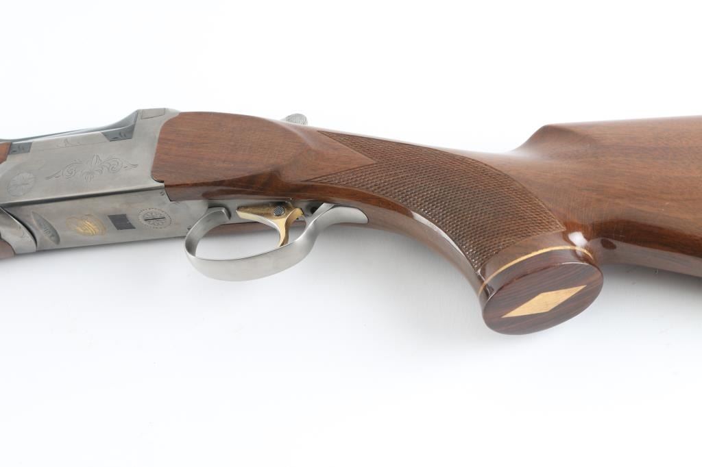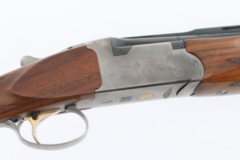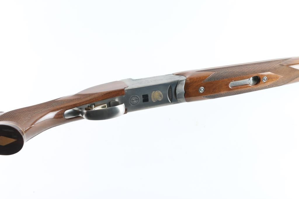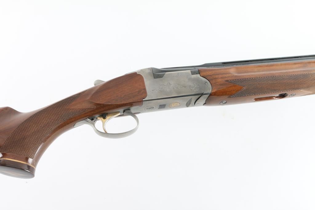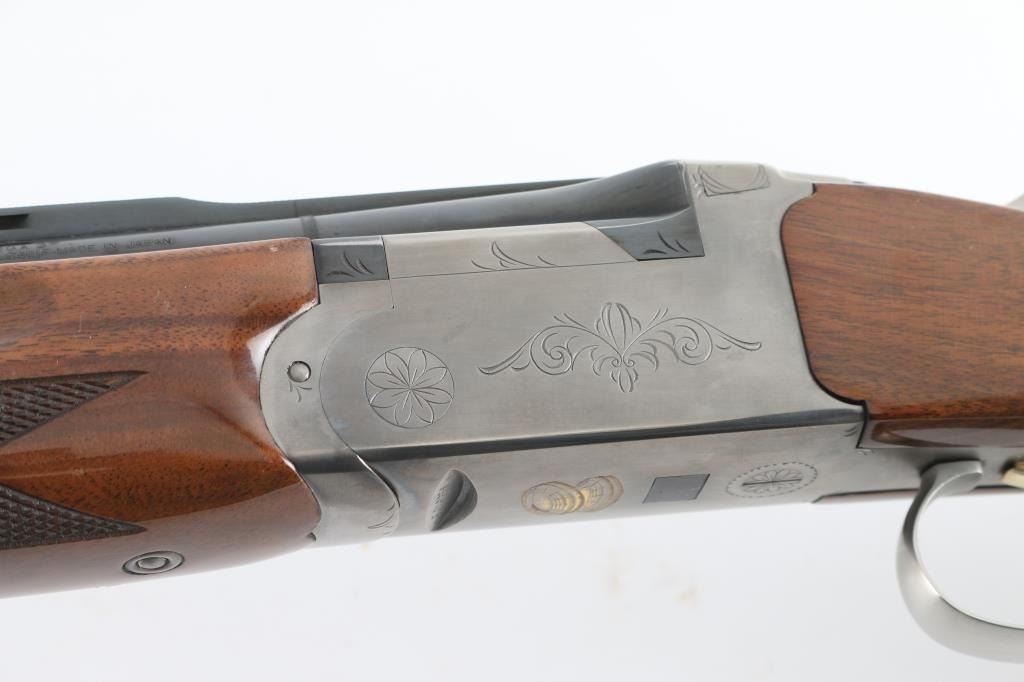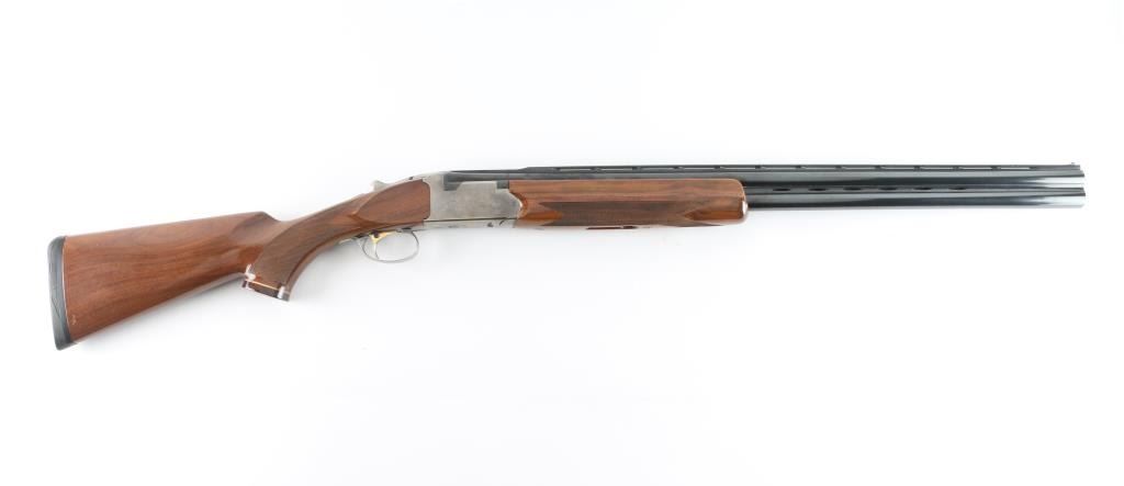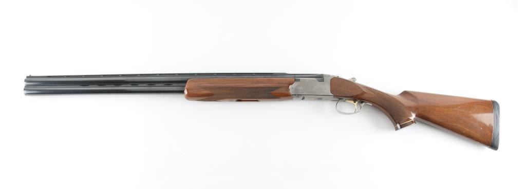 Made in Japan for Weatherby this is an Over Under shotgun chambered for 12 gauge 3" shot shells. It has 28" blued vent rib barrels, a Bradley white bead front sight, sliver tone mid-bead, silver finished receiver with simple engraving, single gold tone trigger with selector button, ejectors, top lever and tang safety. Wood stocks are checkered at the wrist and forearm with diamond grip cap and black rubber recoil pad and spacer. Metal finish looks good with small loss of blue at muzzle. Wood looks good with minor dings and little signs of use or wear. Bore looks very good. LOP is 14.5". Condition is NRA Very Good *Modern Firearm*