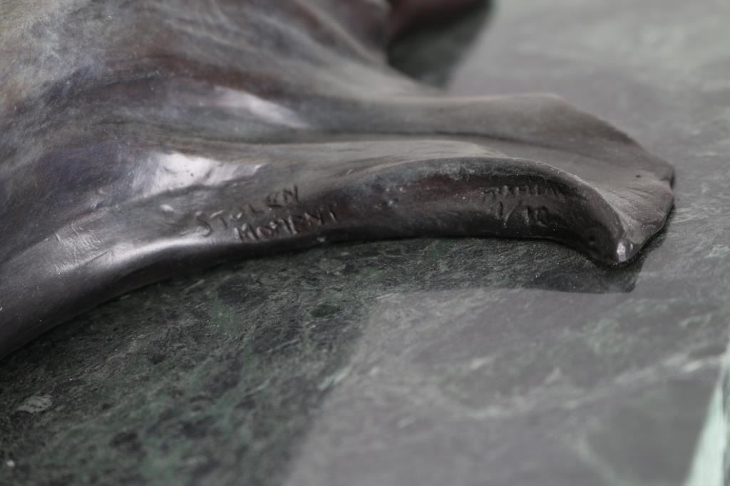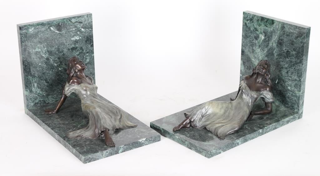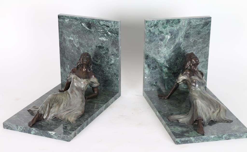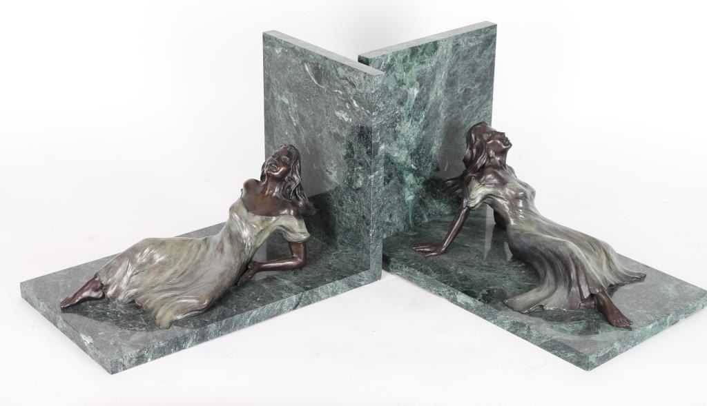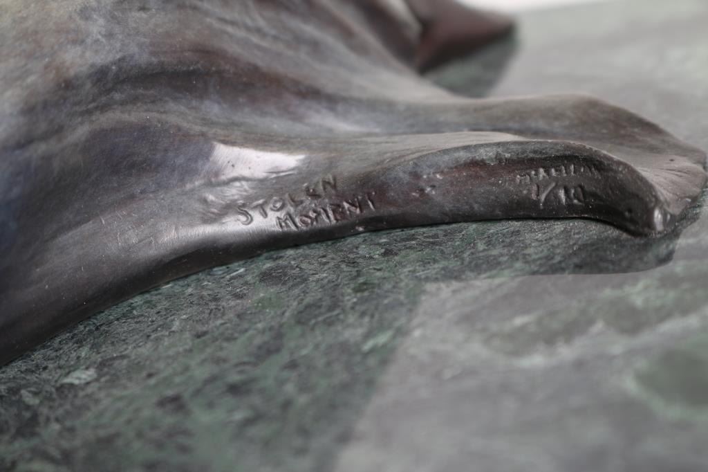 By JD McKellar, dated 1944, entitled "Stolen Moment". Bookends, set on green marble bases. The dimensions of this bronze measure 15"x9". Jerry D. McKellar (Born 1944) is active/lives in Washington. Jerry McKellar is known for Romantic wildlife and Indian sculpture.