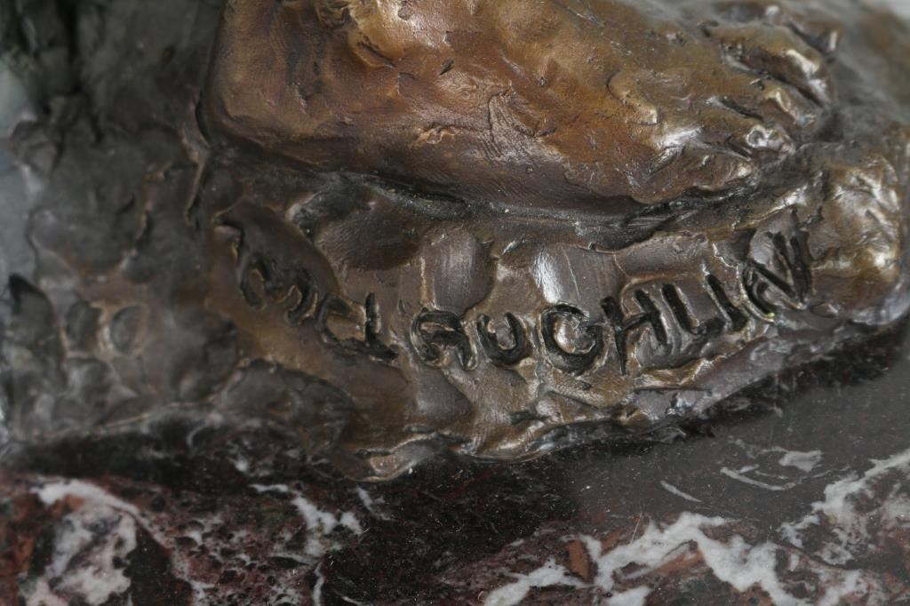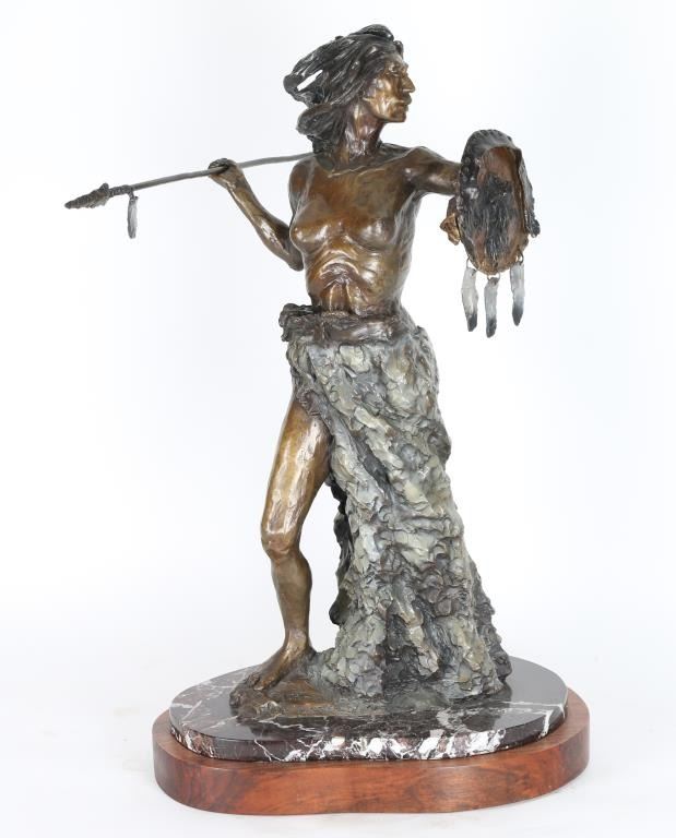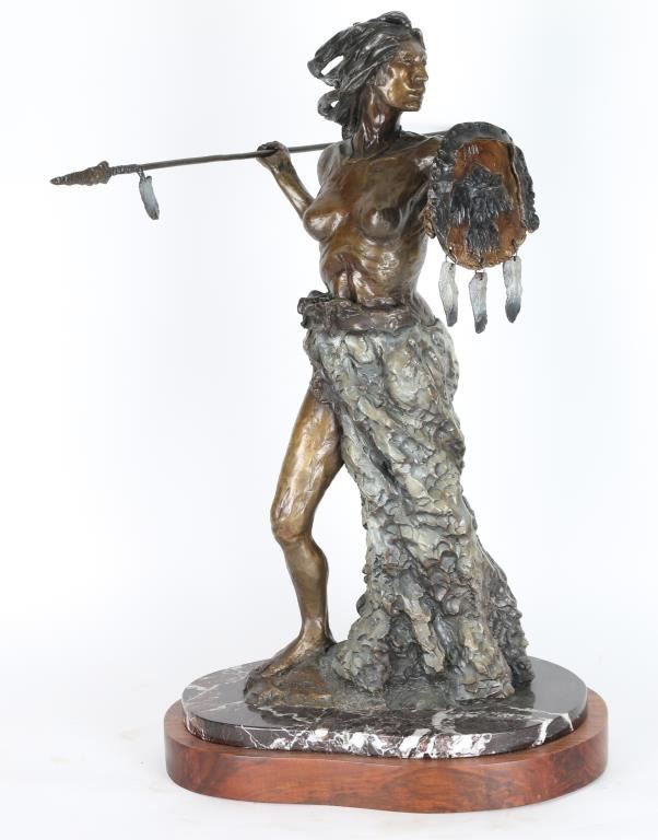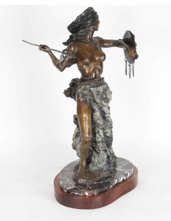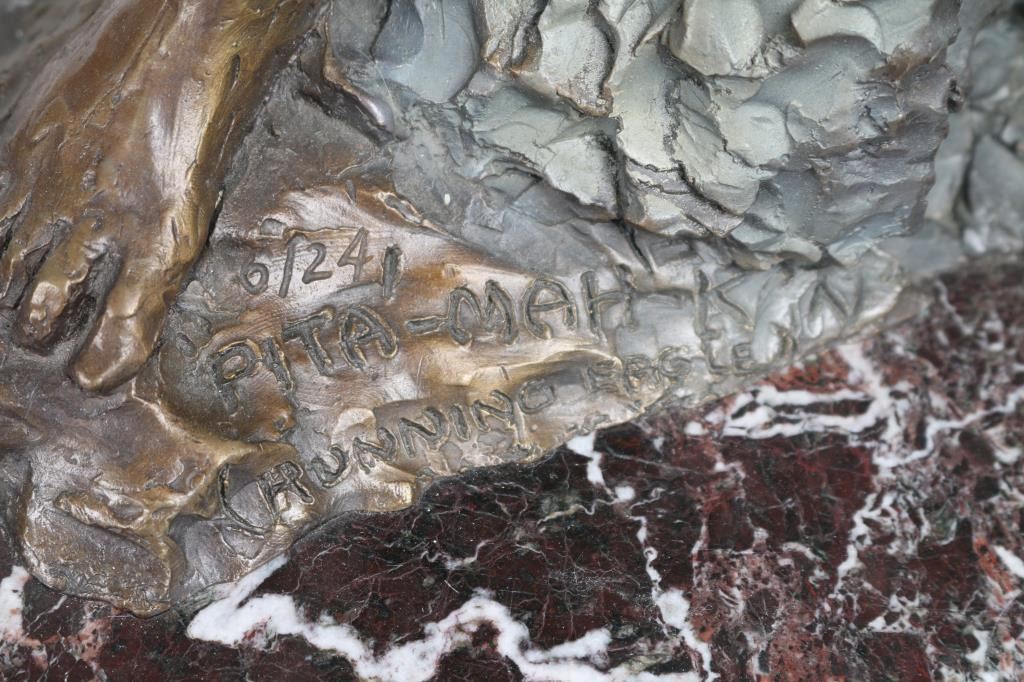 By Nancy McLaughlin numbered 6/24 , entitled "Running Eagle. Signed in bronze and mounted on marble and wood. Measures 28"x13". Nancy Powell McLaughlin (1932 - 1985) was active/lived in Montana. Nancy McLaughlin is known for Indian figure and animal painting, sculpture.