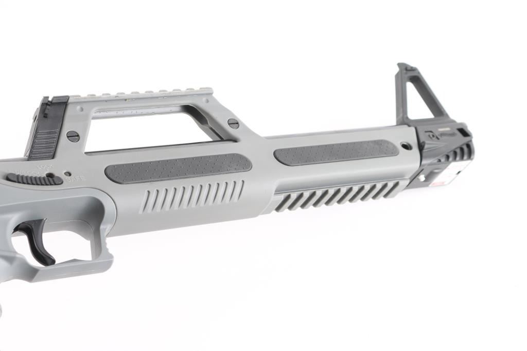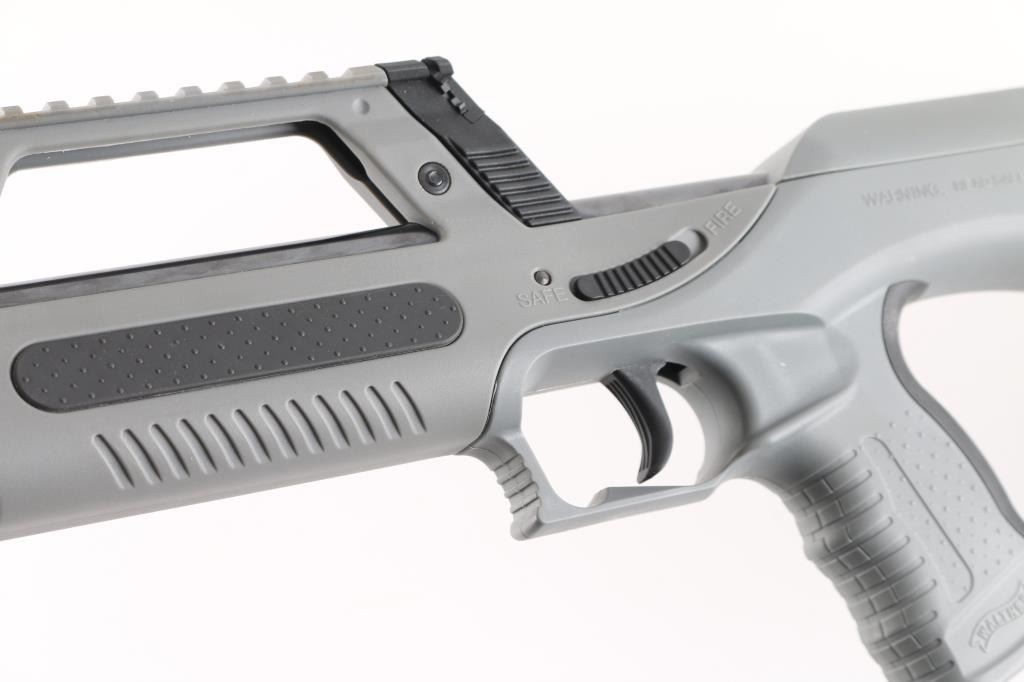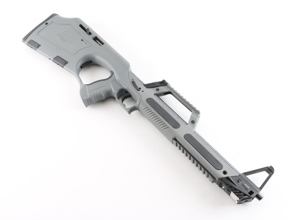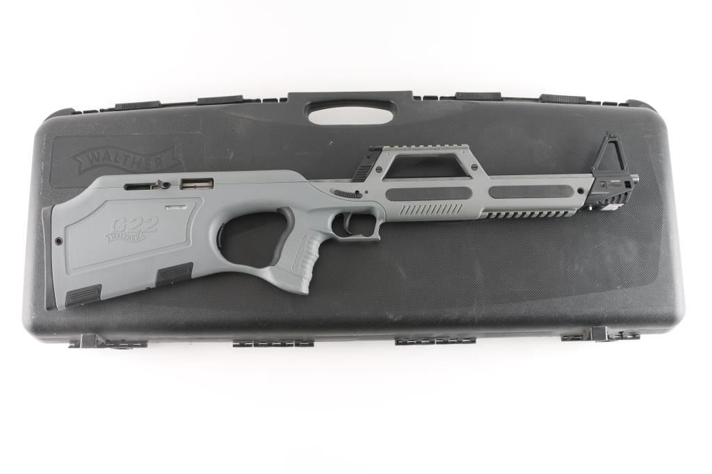German made semi-automatic bullpup rifle chambered in .22 Long Rifle, imported by Smith & Wesson, circa 2004. Features a 20" blued barrel, raised patridge front sight, integrated laser module below the muzzle, carrying handle with scope rail & slide up rear sight (notch aperture rear sight features rotating disk for selecting various range settings), accessory rail section under forend, ambidextrous safety, serrated trigger, ambidextrous magazine release, 10 round factory magazine and gray synthetic thumb-hole stock with pebbled pistol grip, black color accent panels, threaded sockets in multiple places for swivel mounting, spare 10 round magazine in stock, rubber recoil pad. Configured for a right handled shooter, stock appears to be reversible, with covered panels on left side that match the ejection port and charging handle slot on the right. Bore is very good condition. Externally near excellent with few minor handling marks. Includes Walther hard case with stock spacers and tools. Condition is NRA Excellent *** Modern Firearm ***
